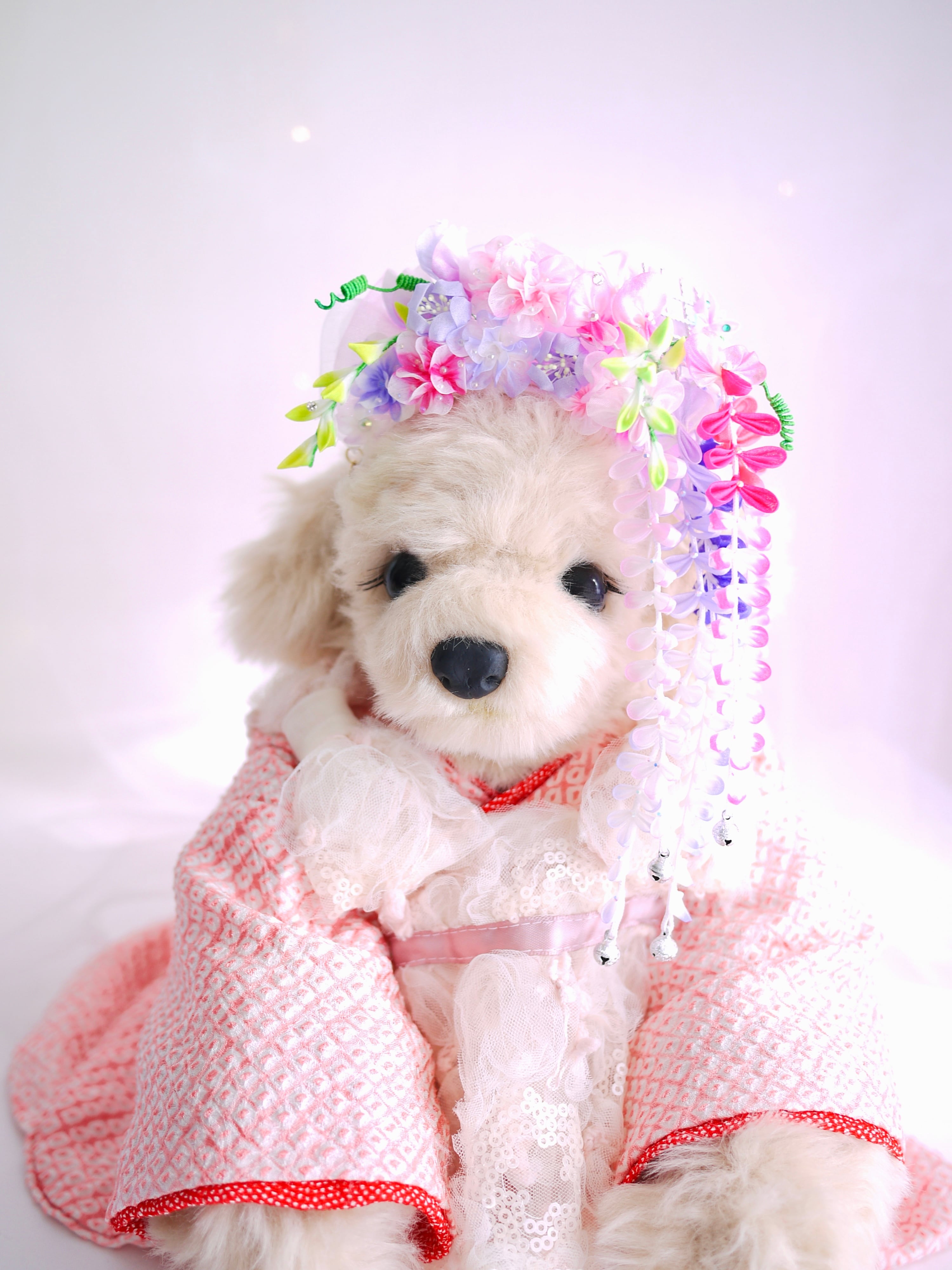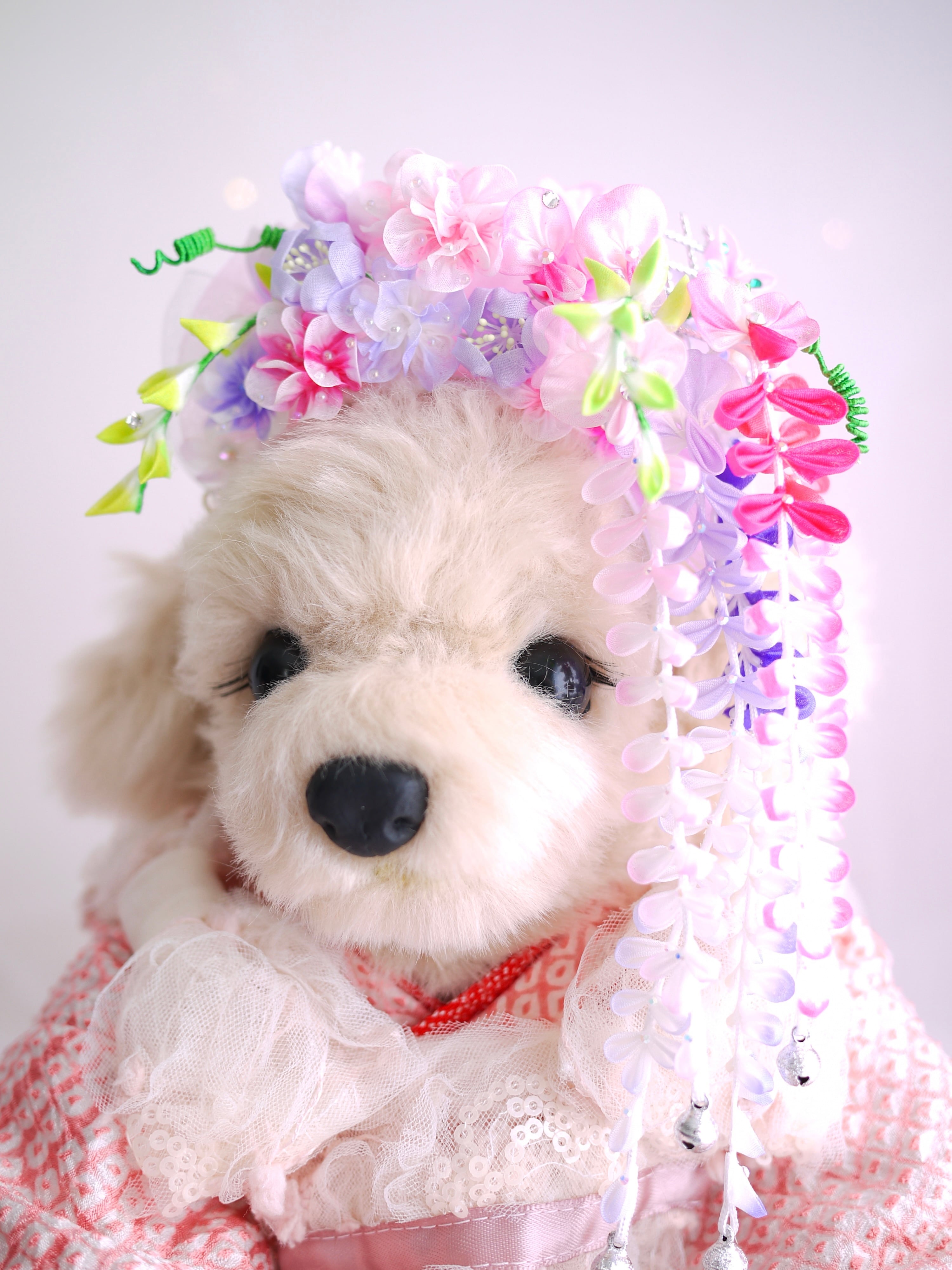 ワンちゃんの可愛らしい雰囲気のお着物にも合わせやすい春の女神風のflesh & sweetな藤娘に