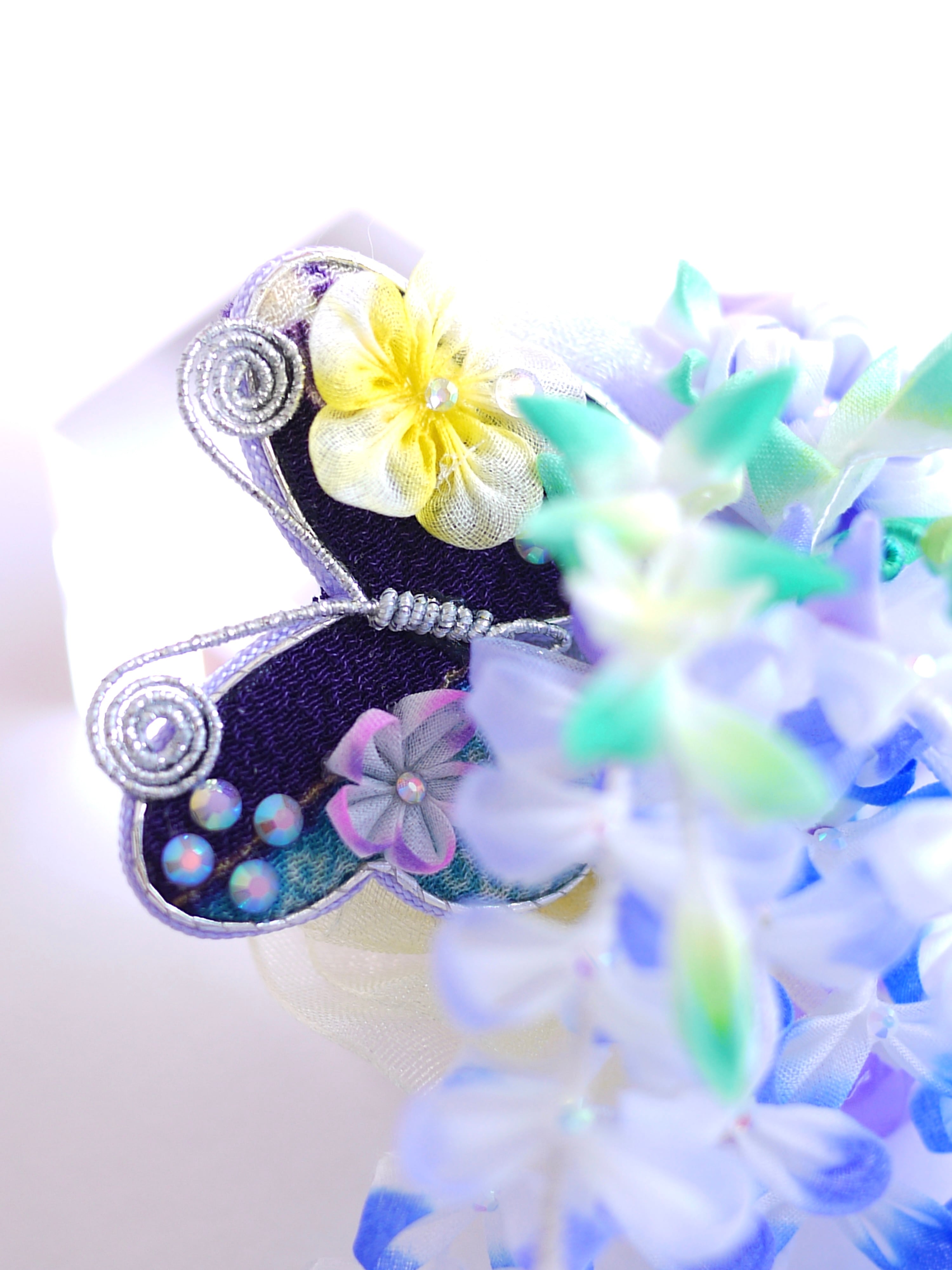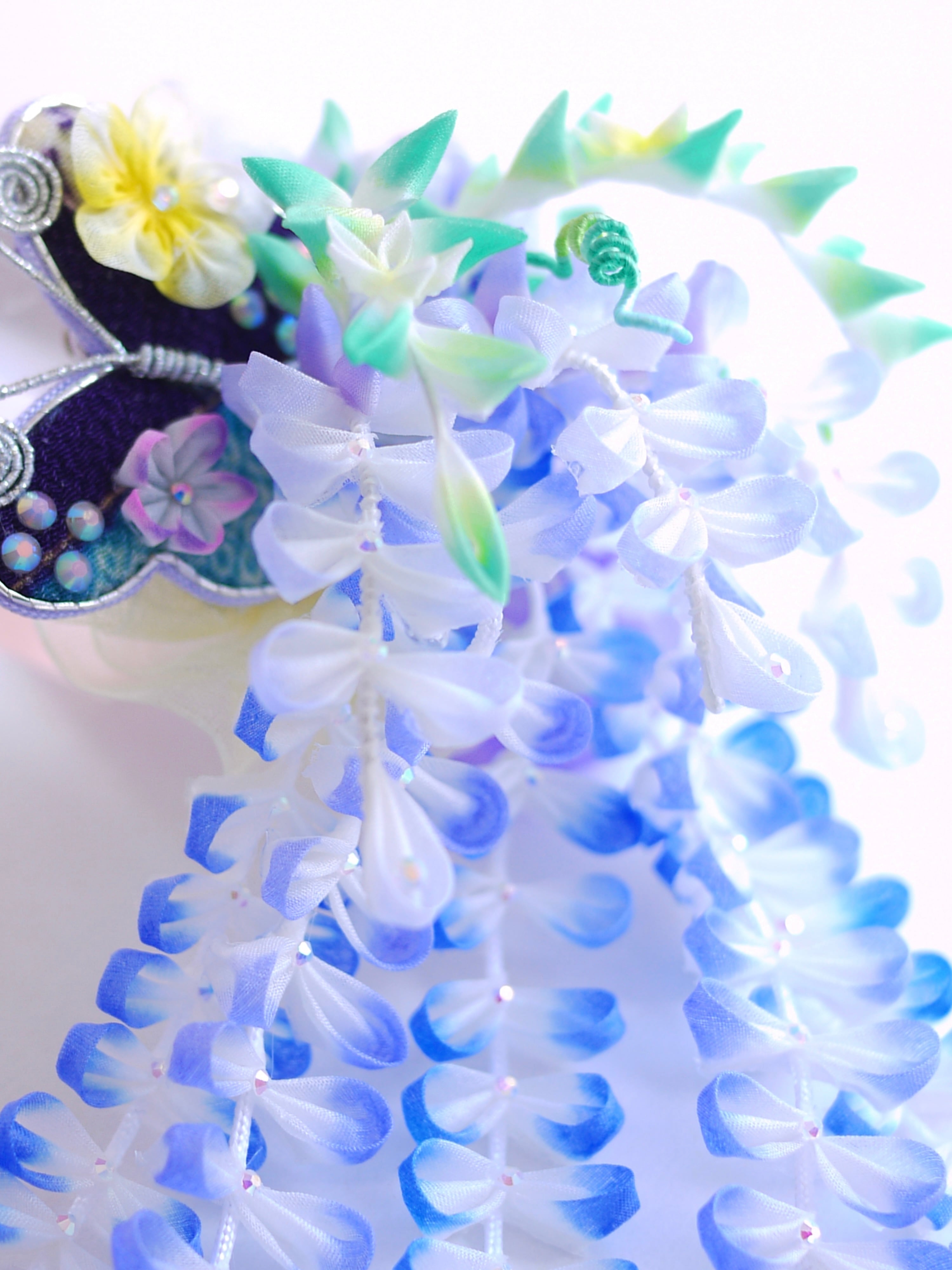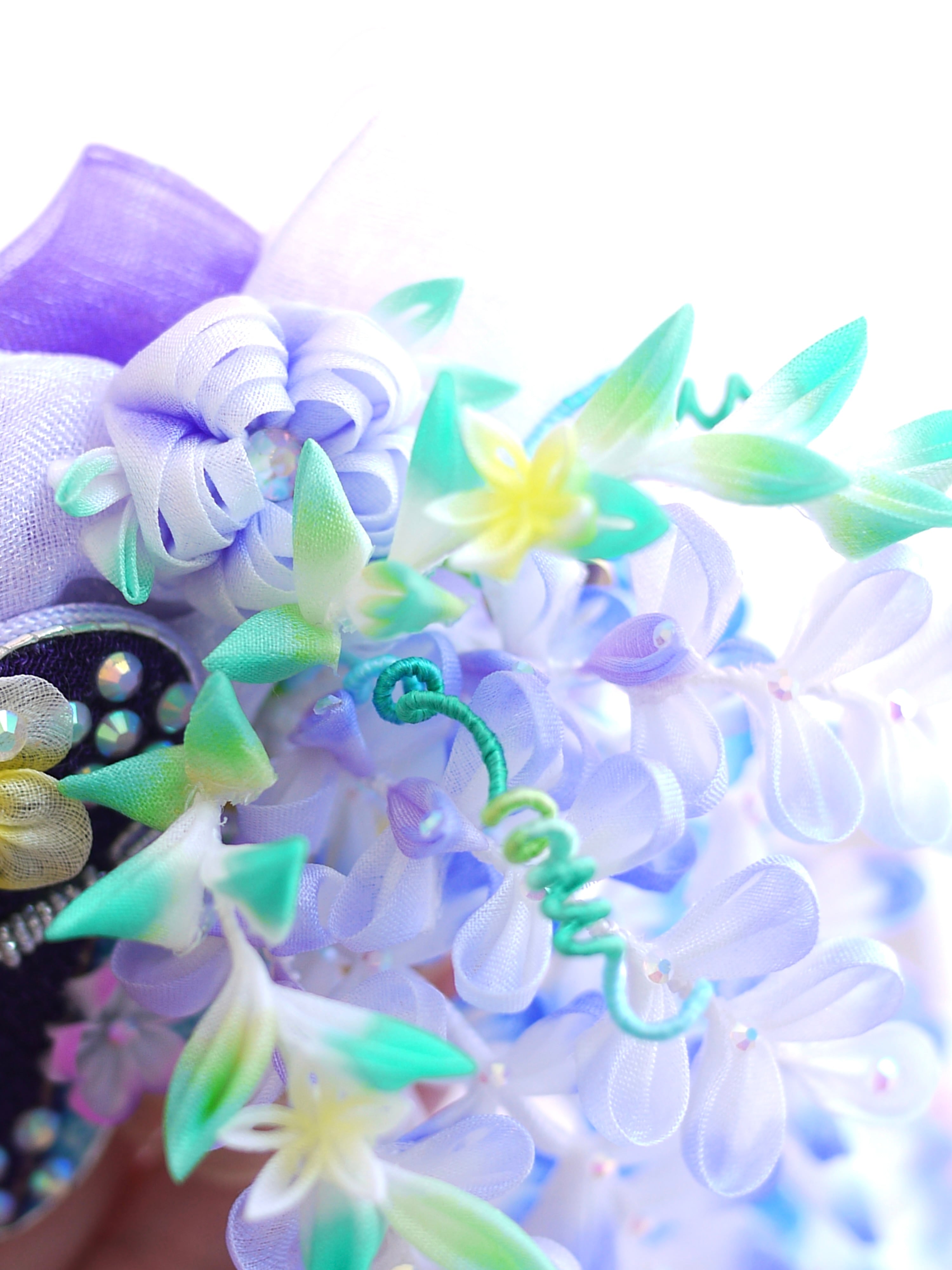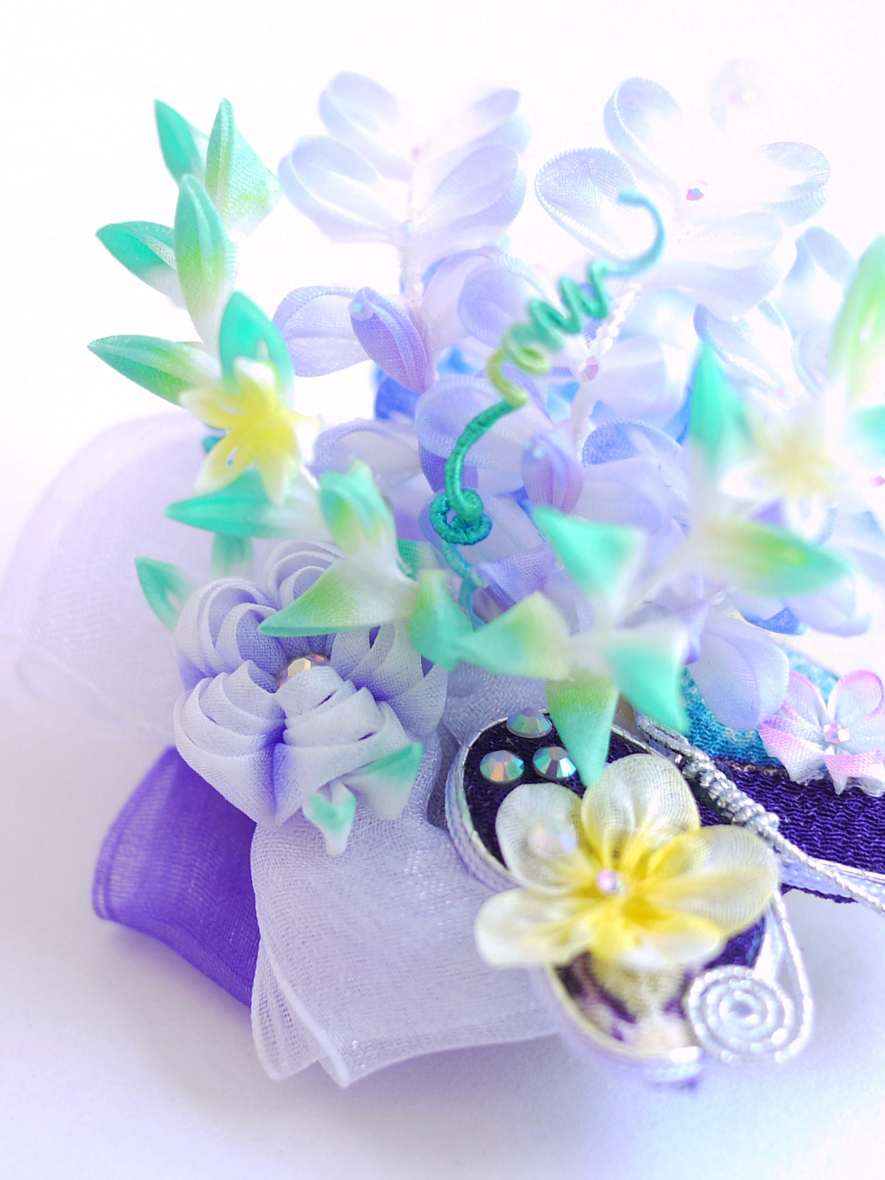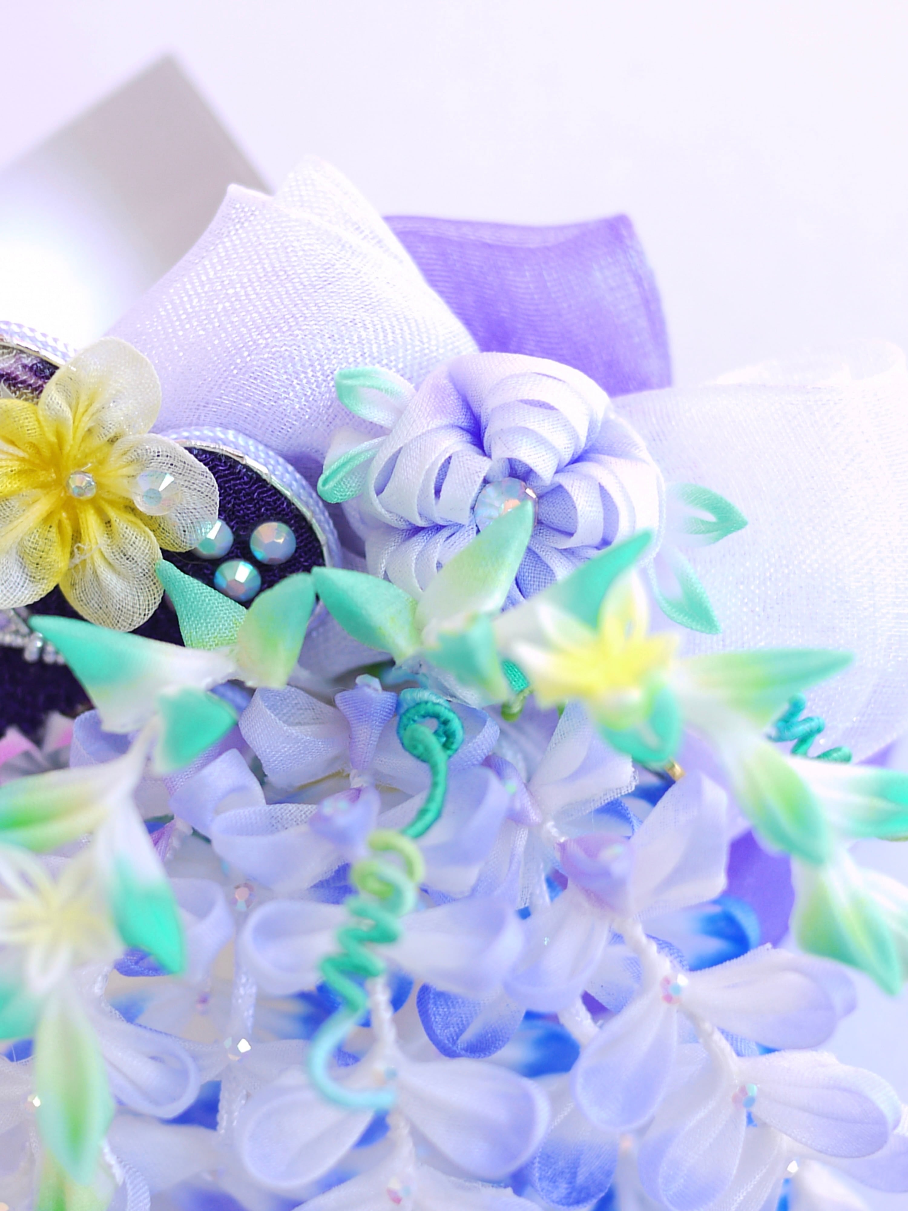 つまみ細工は専用の糊のみで制作しております、水に濡れると糊が溶けて型崩れしたり、正絹地が変形・変色する原因になることがございます。 雨や水濡れ・湿気には十分お気をつけください。 濃色のものは特に色移りする場合がございます