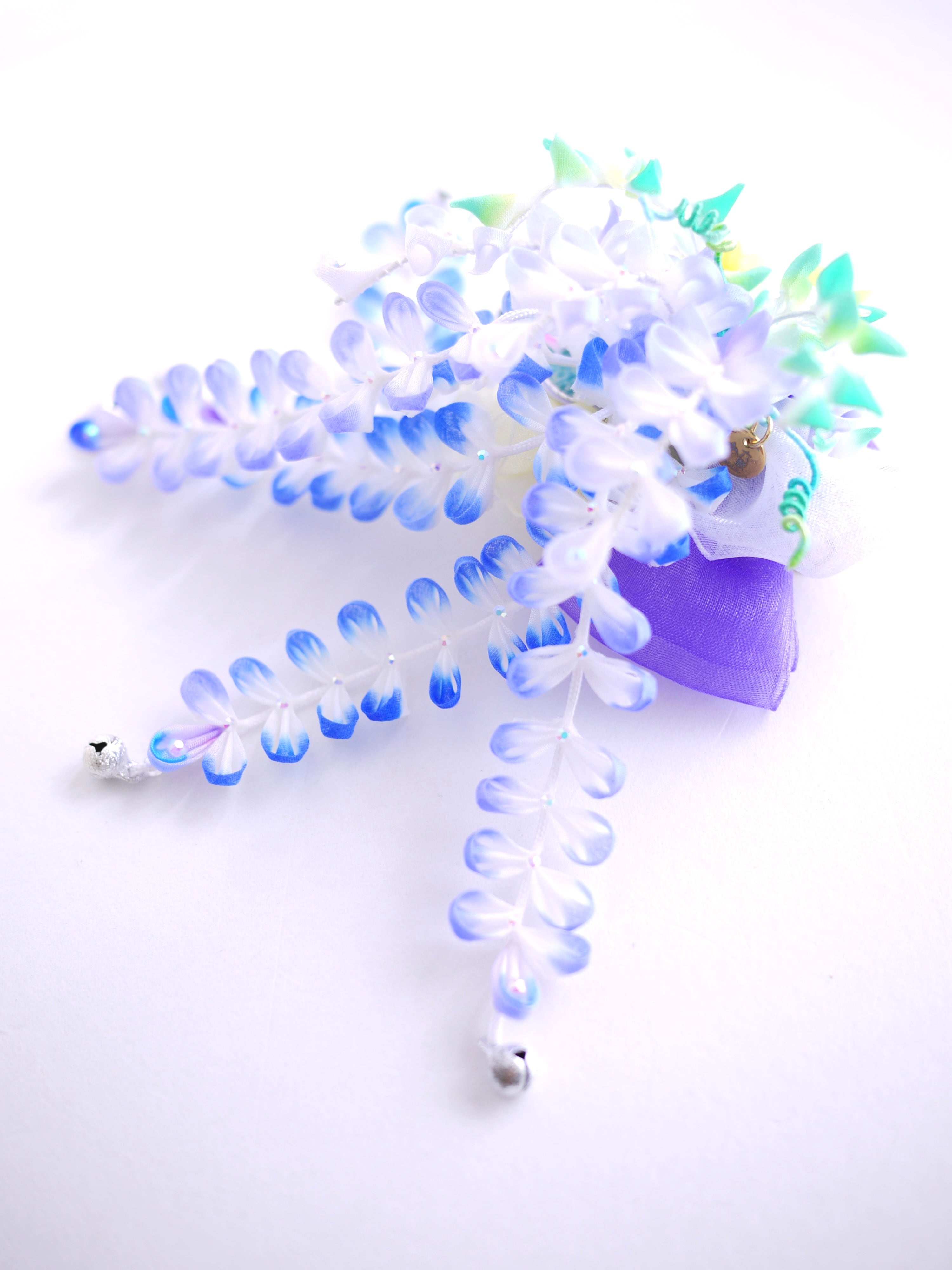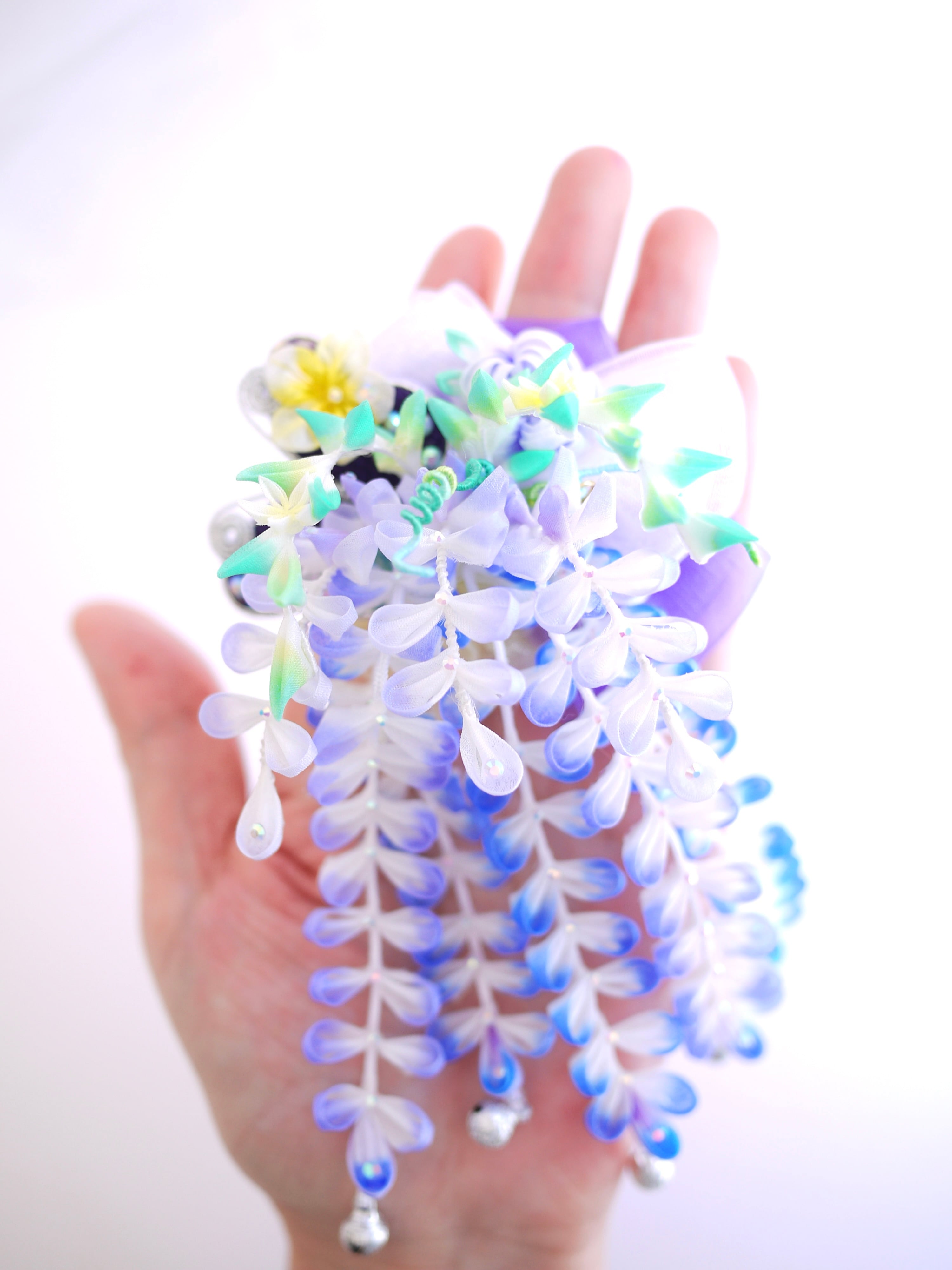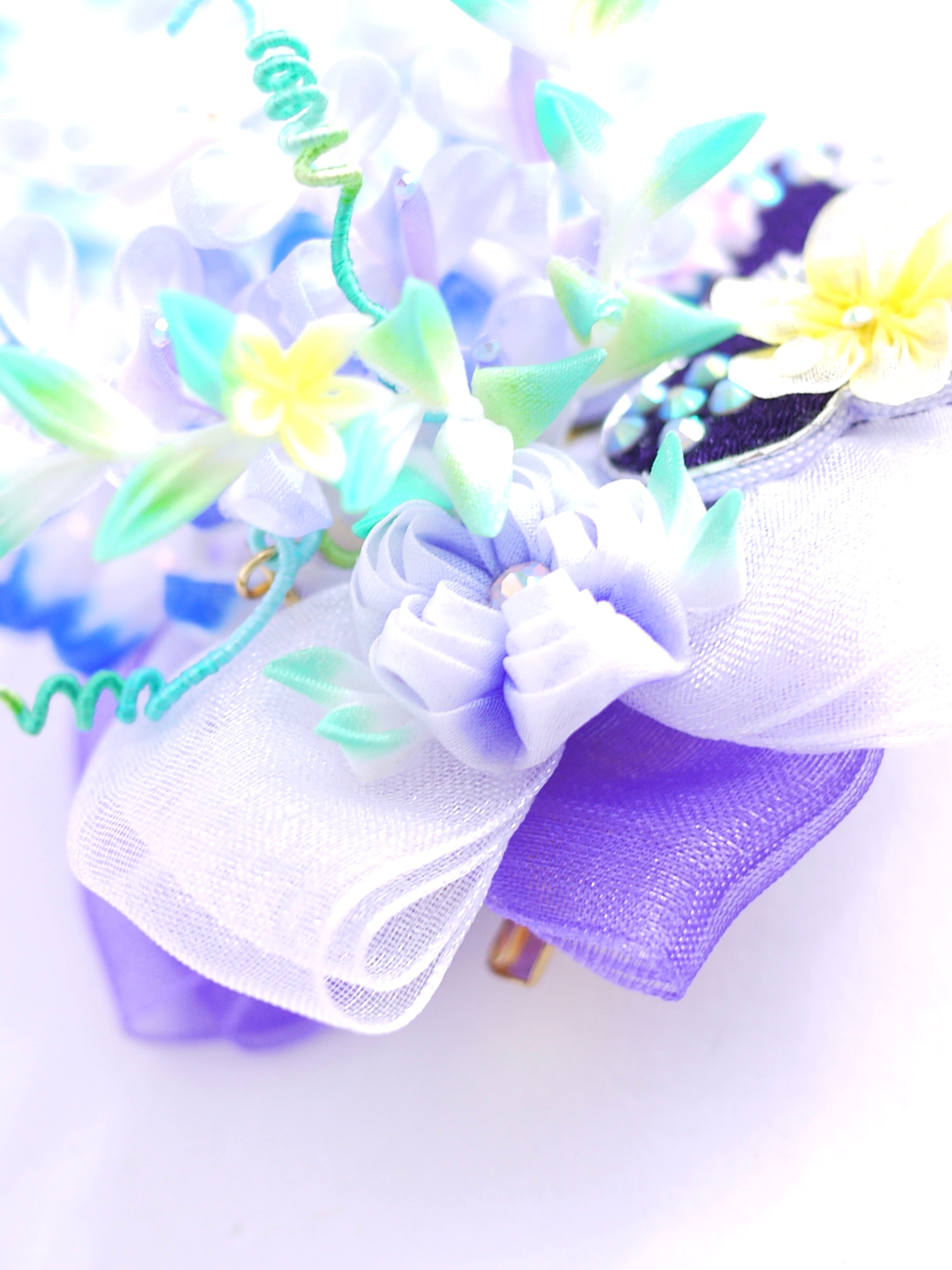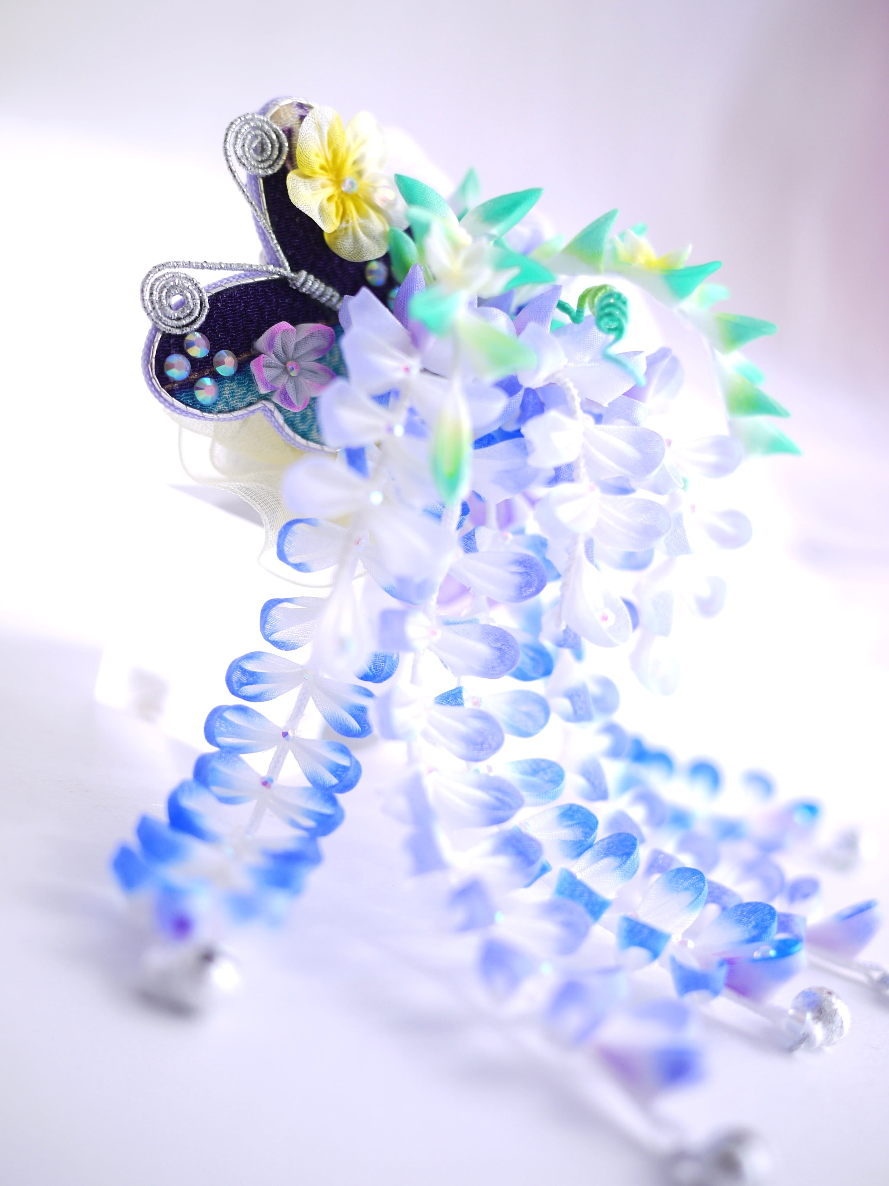 つまみ細工は専用の糊のみで制作しております、水に濡れると糊が溶けて型崩れしたり、正絹地が変形・変色する原因になることがございます。 雨や水濡れ・湿気には十分お気をつけください。 濃色のものは特に色移りする場合がございます