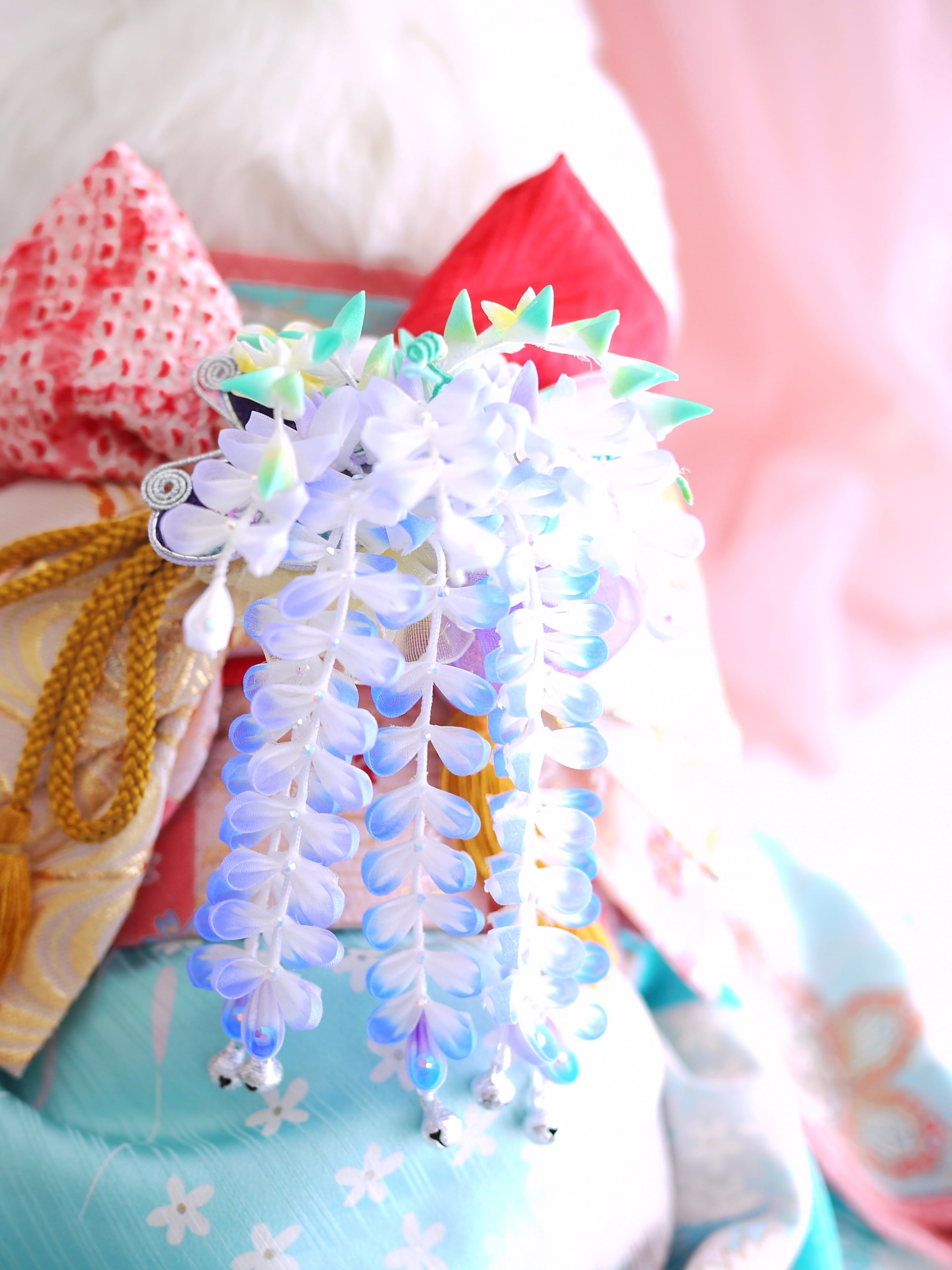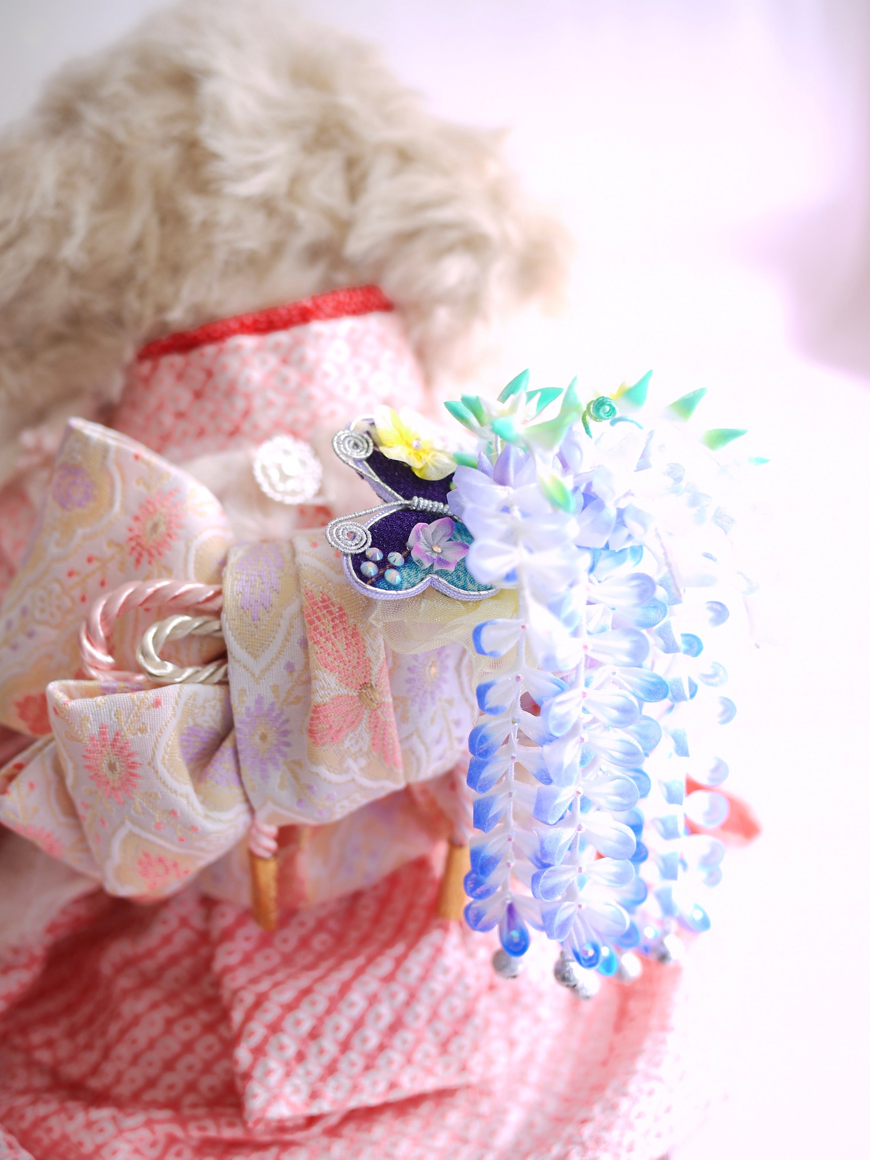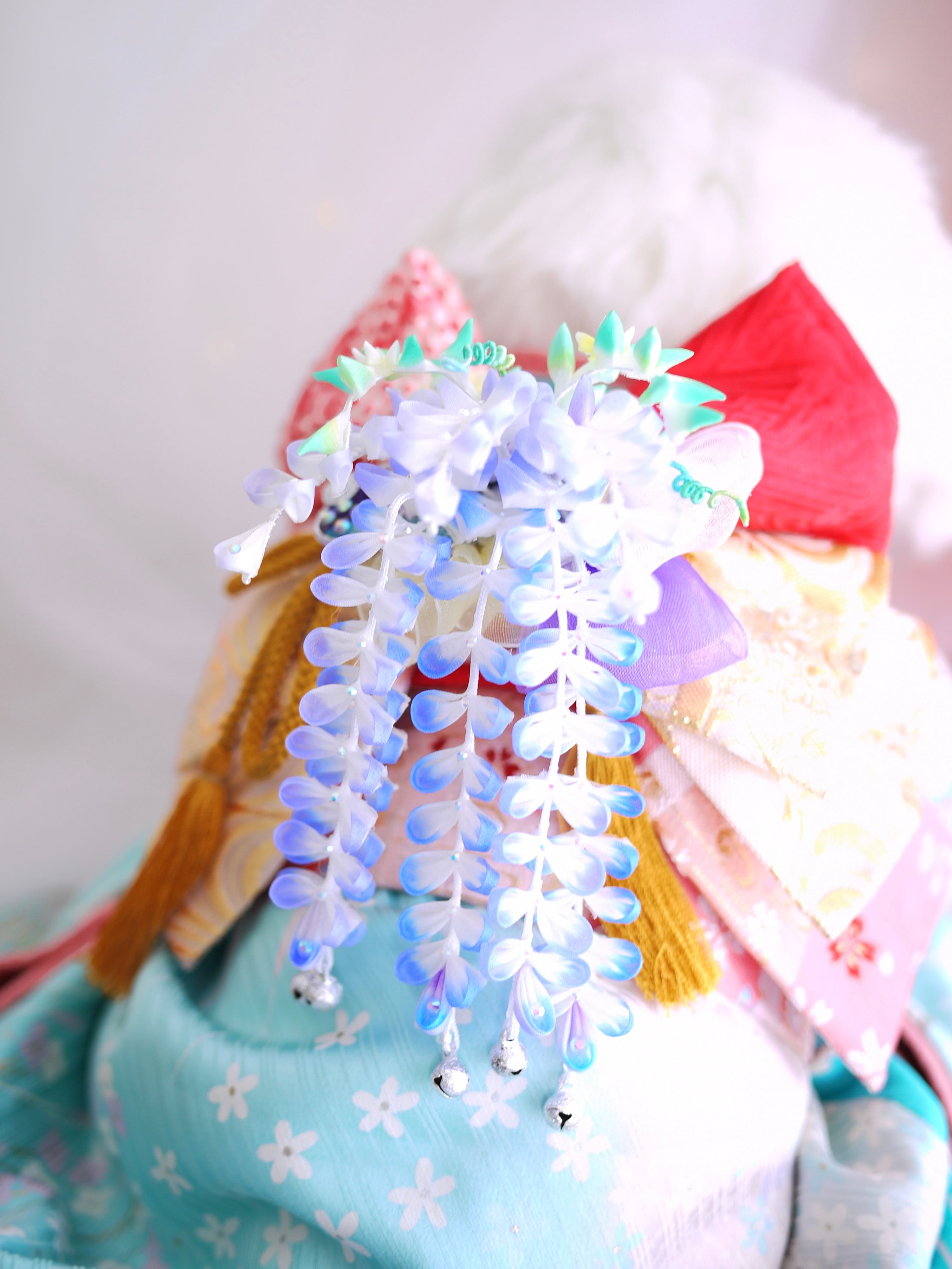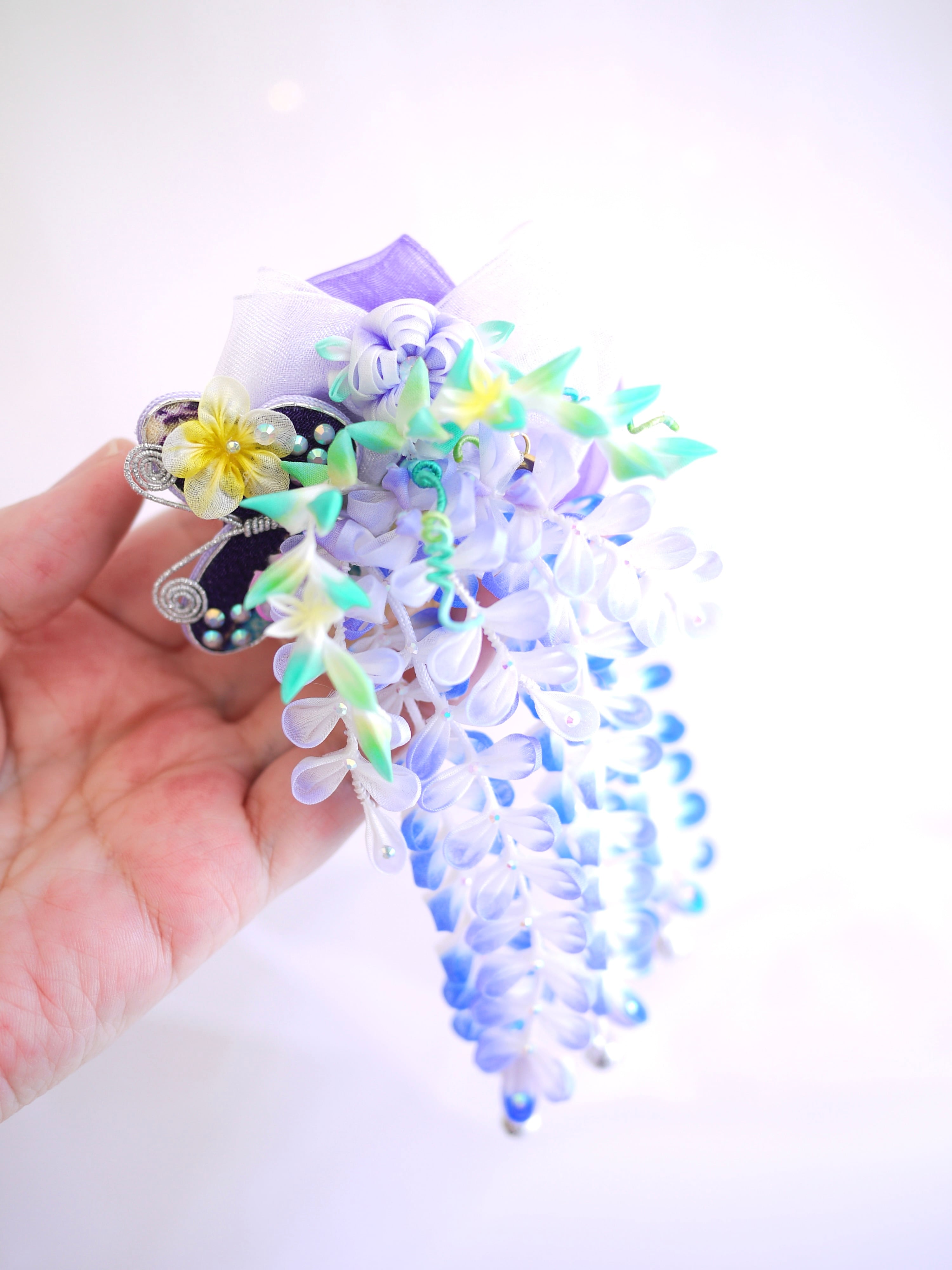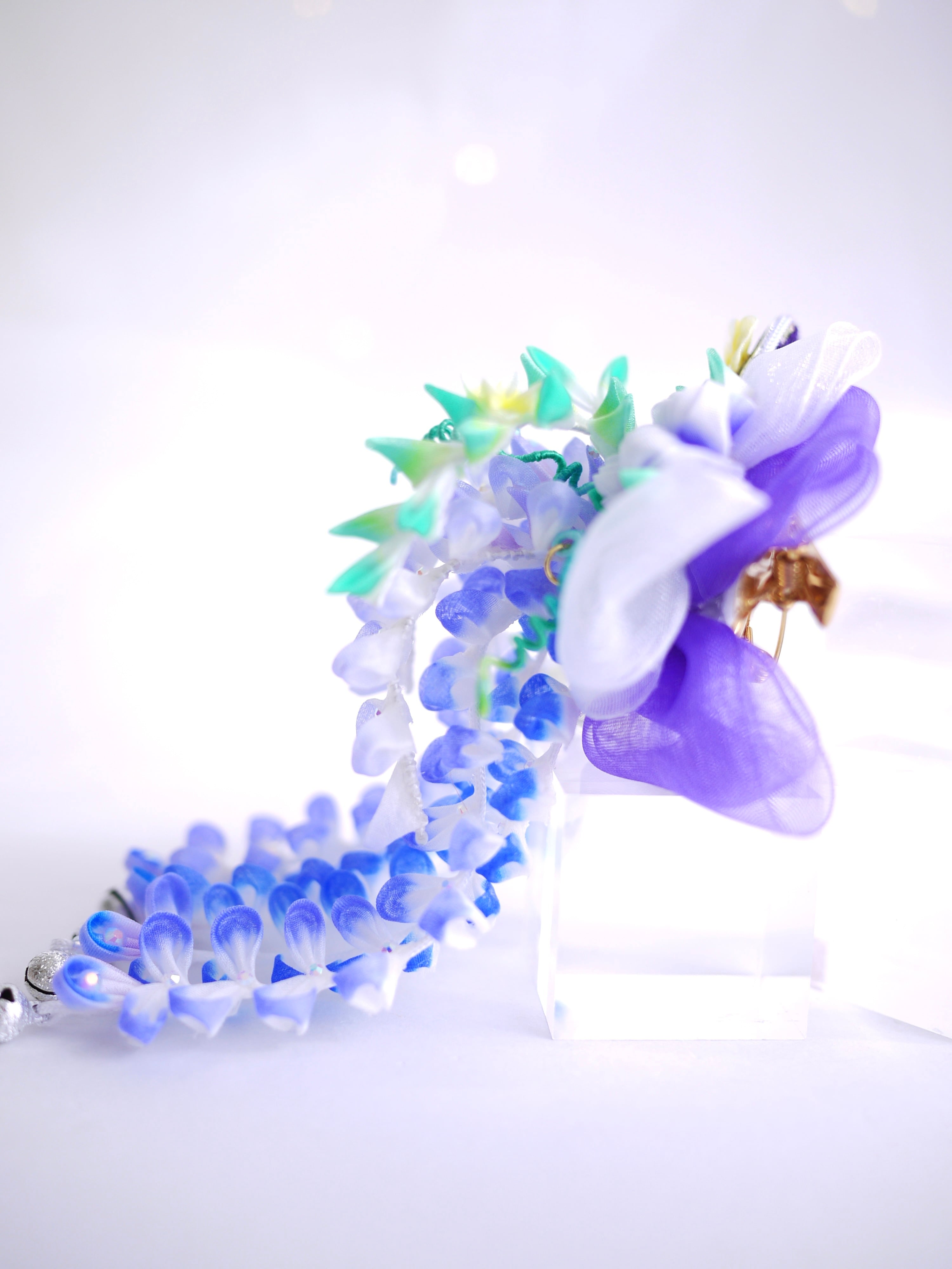 つまみ細工は専用の糊のみで制作しております、水に濡れると糊が溶けて型崩れしたり、正絹地が変形・変色する原因になることがございます。 雨や水濡れ・湿気には十分お気をつけください。 濃色のものは特に色移りする場合がございます