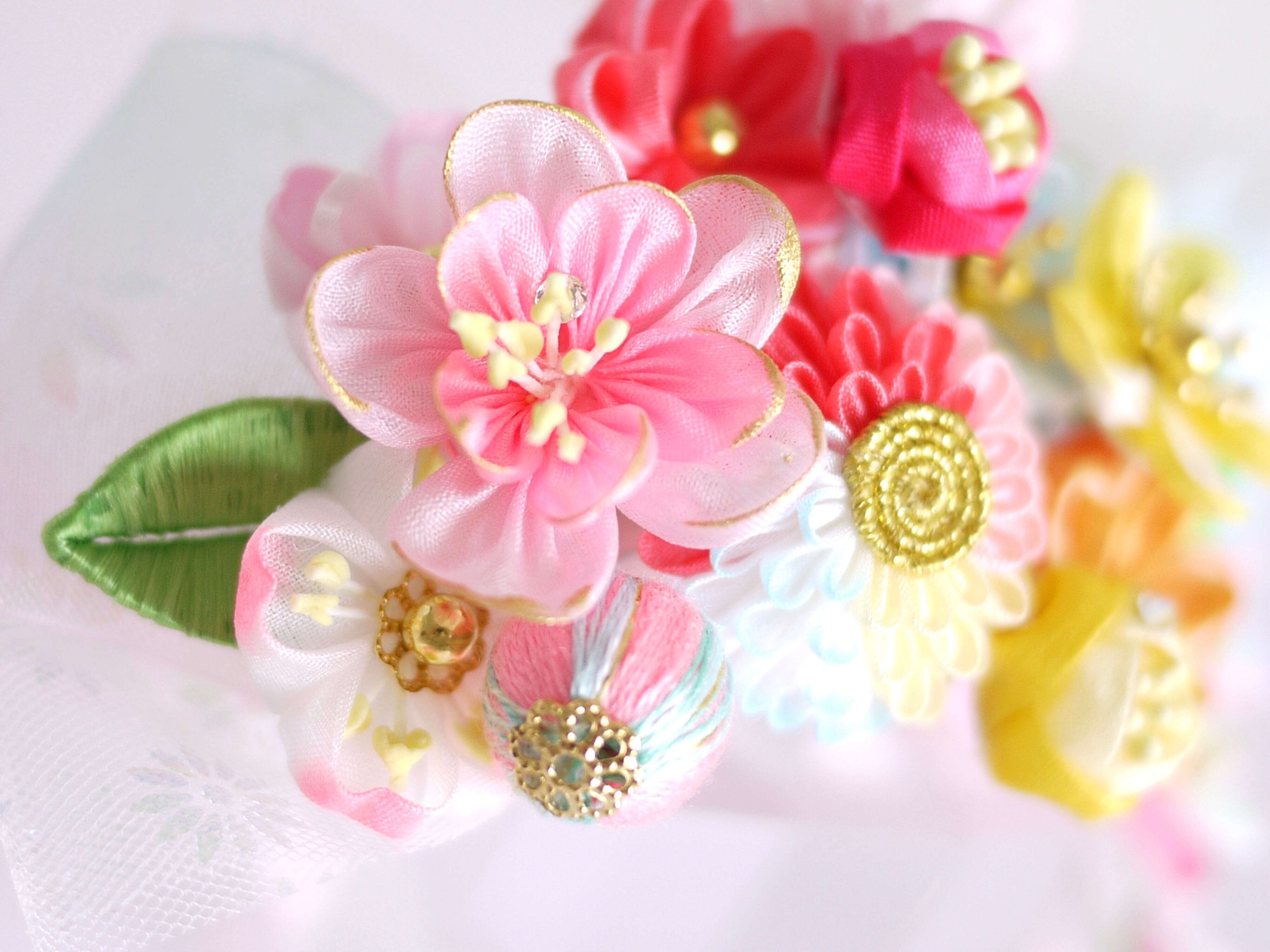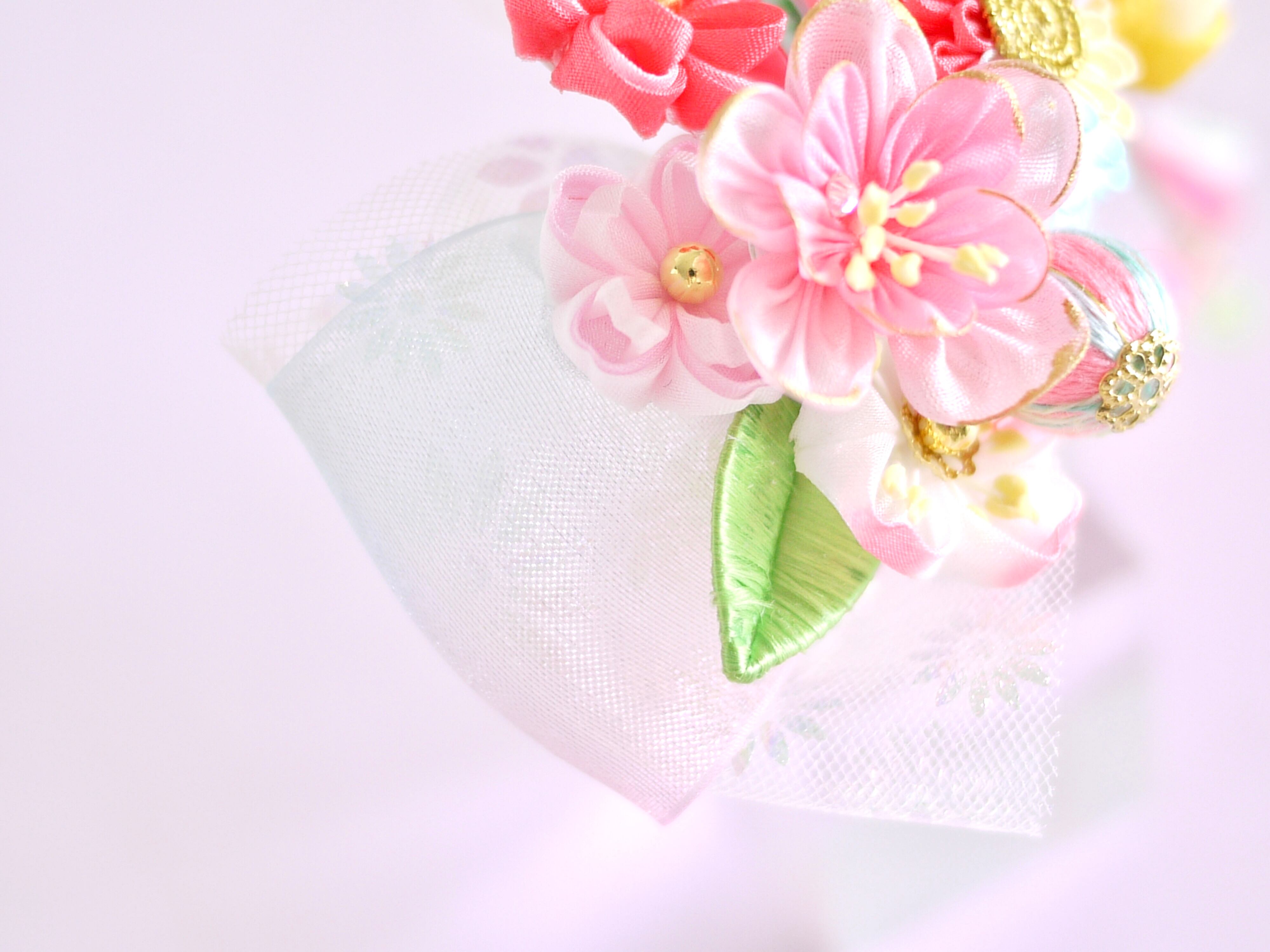 つまみ細工は専用の糊のみで制作しております、水に濡れると糊が溶けて型崩れしたり、正絹地が変形・変色する原因になることがございます。 雨や水濡れ・湿気には十分お気をつけください。 濃色のものは特に色移りする場合がございます