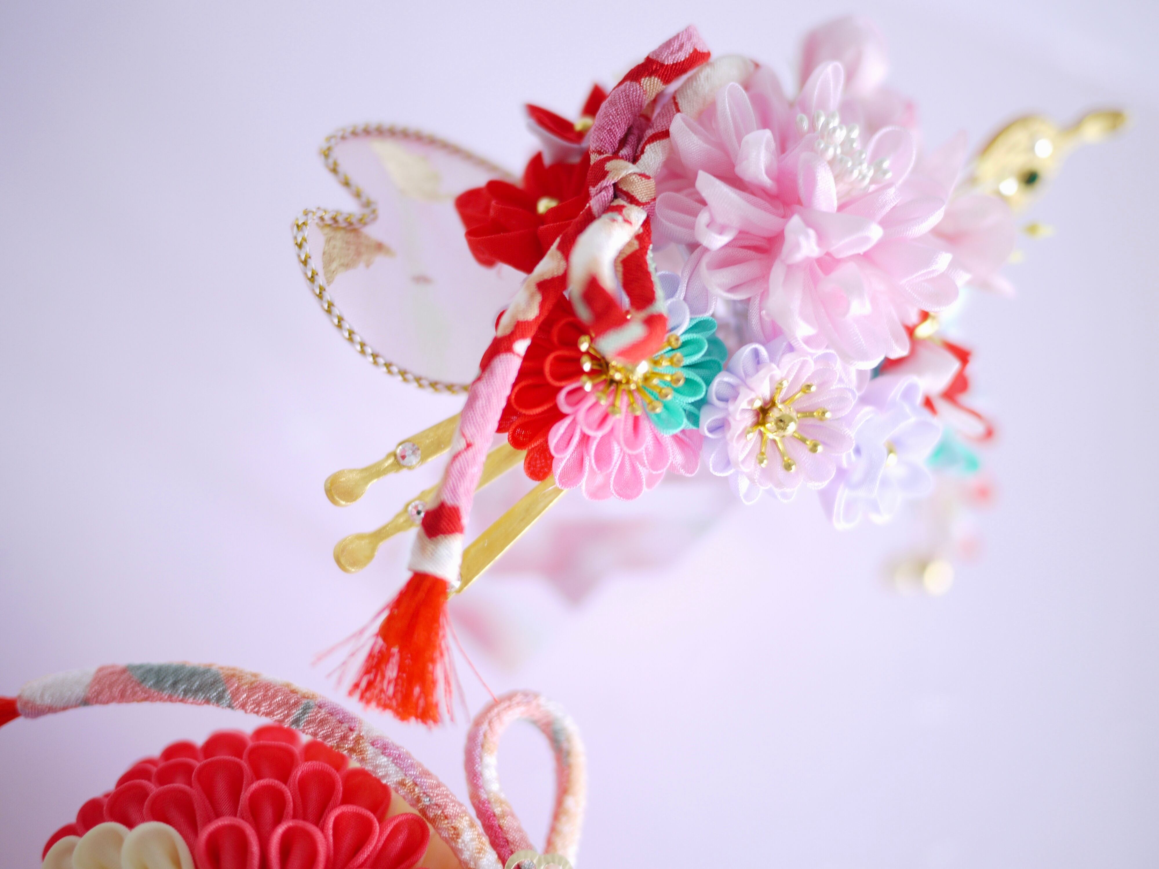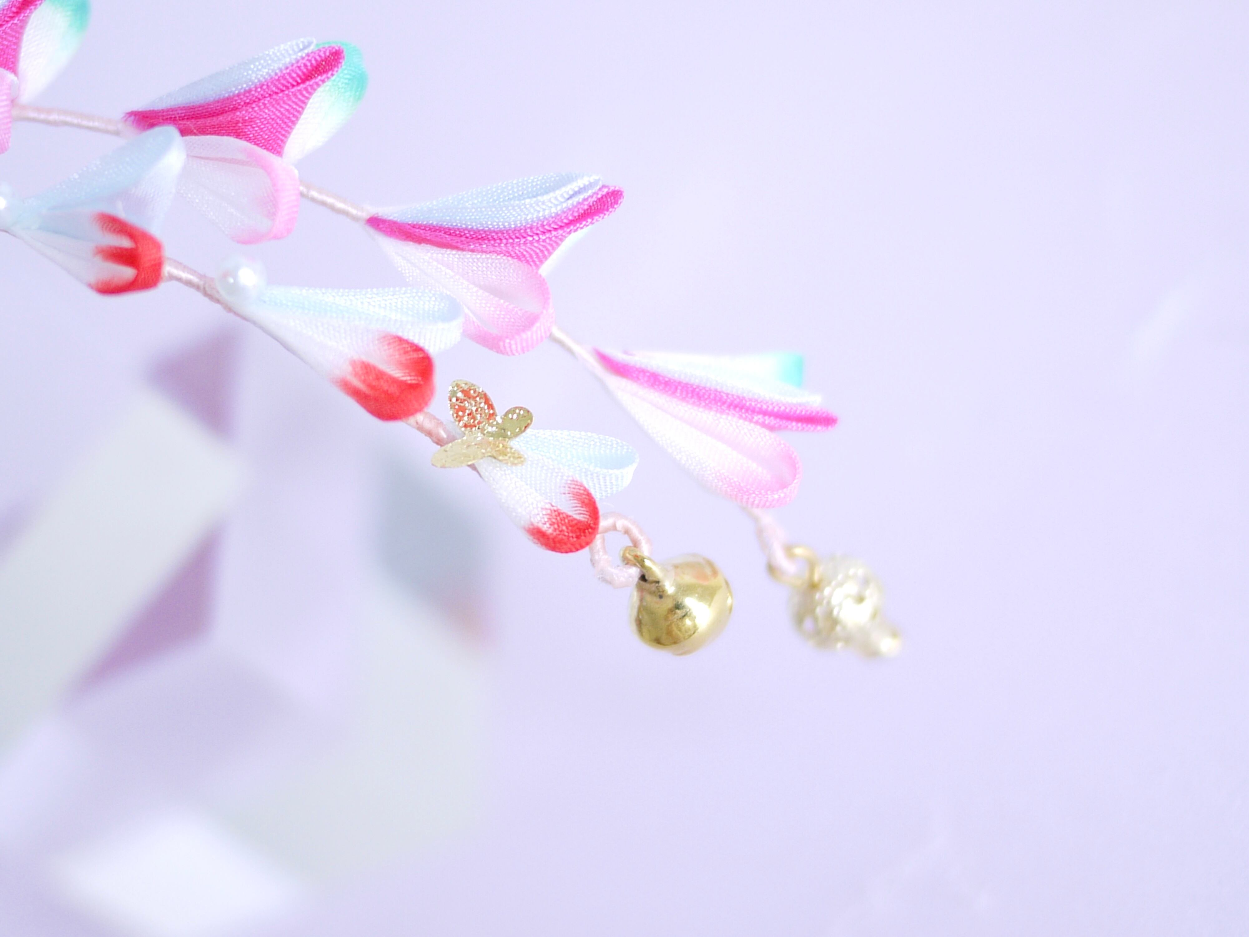 つまみ細工は専用の糊のみで制作しております、水に濡れると糊が溶けて型崩れしたり、正絹地が変形・変色する原因になることがございます。 雨や水濡れ・湿気には十分お気をつけください。 濃色のものは特に色移りする場合がございます