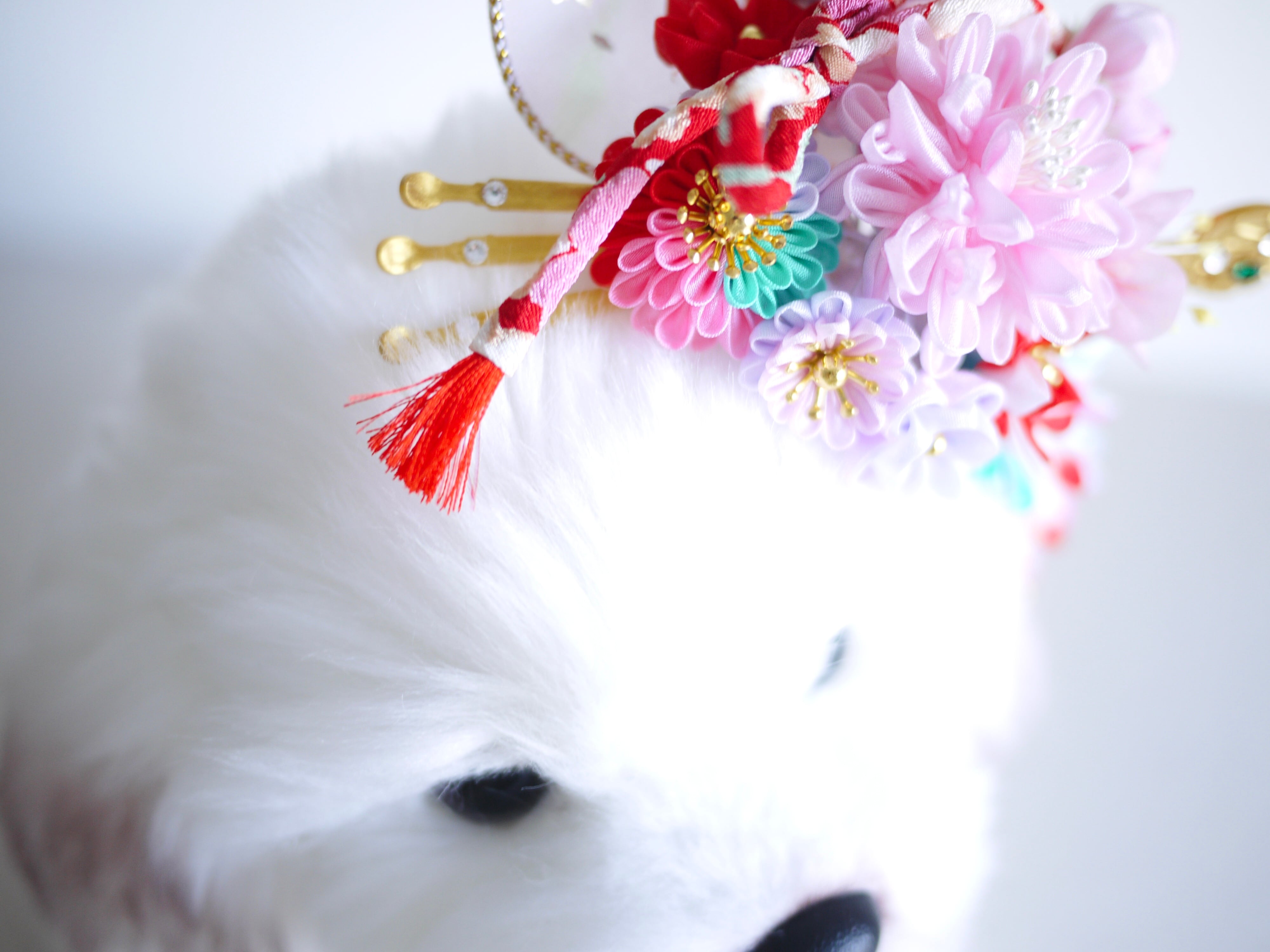 平打ちやコトジも挿して太夫さん風に、ワンちゃん用かんざしでは珍しい乱菊のつまみ細工を贅沢に使った花かんざしです