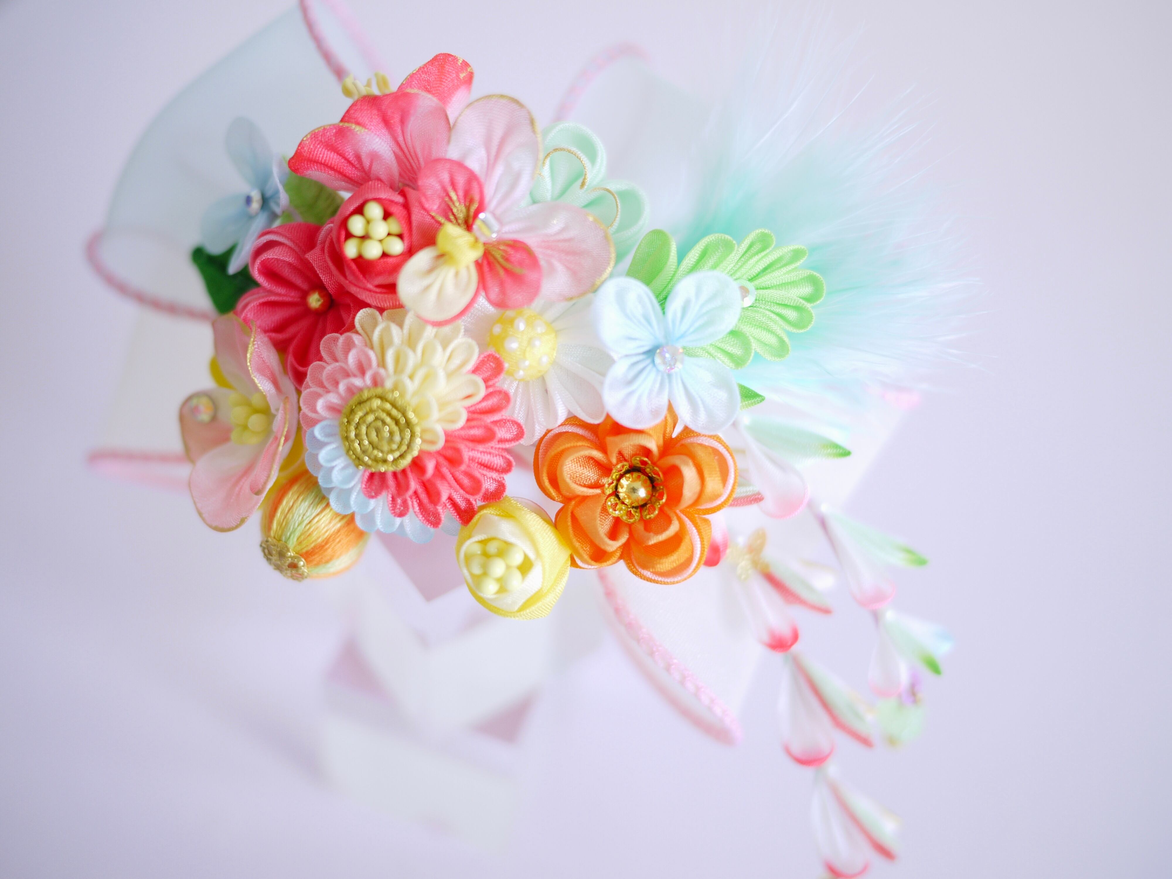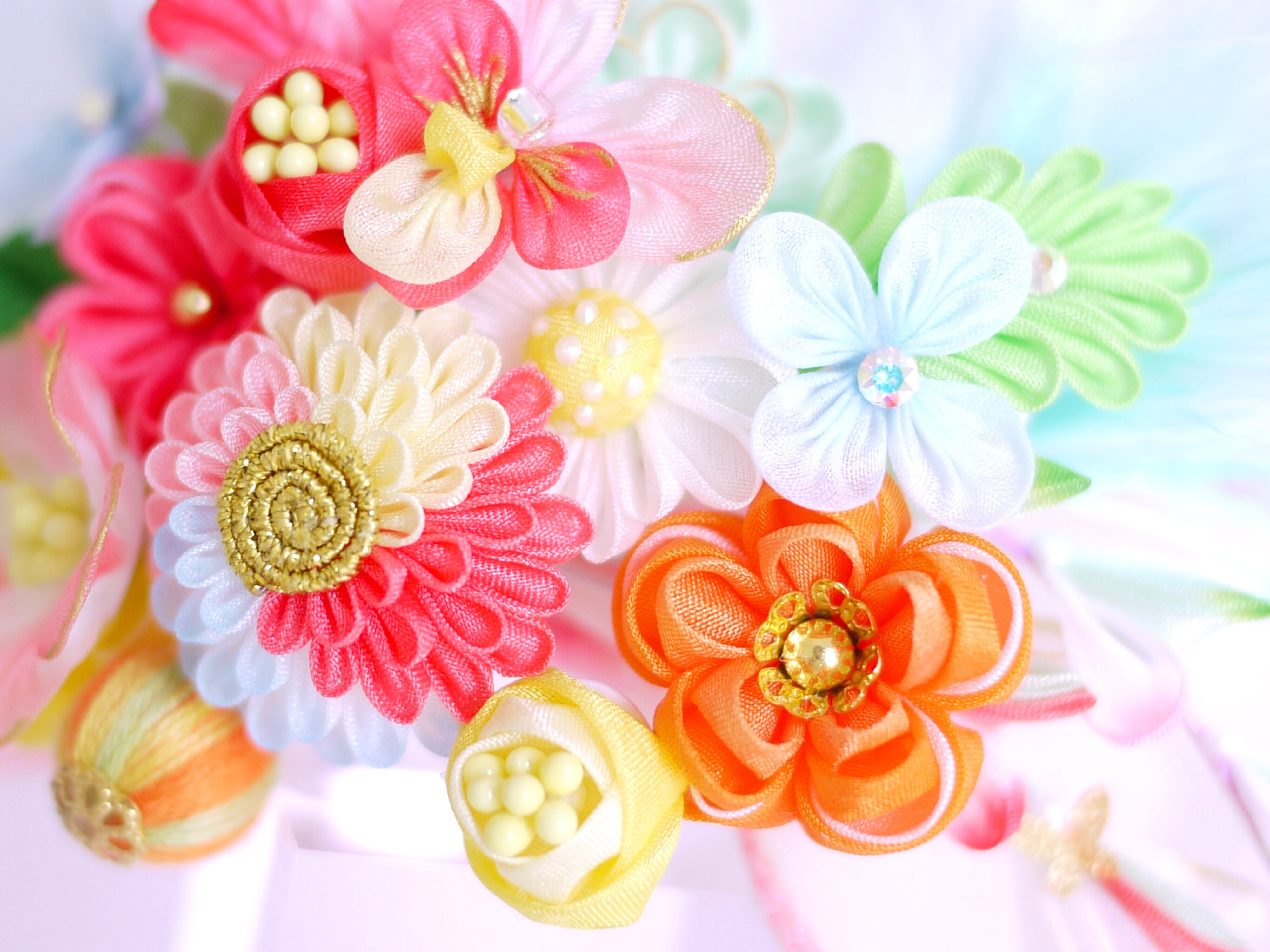 つまみ細工は専用の糊のみで制作しております、水に濡れると糊が溶けて型崩れしたり、正絹地が変形・変色する原因になることがございます。 雨や水濡れ・湿気には十分お気をつけください。 濃色のものは特に色移りする場合がございます
