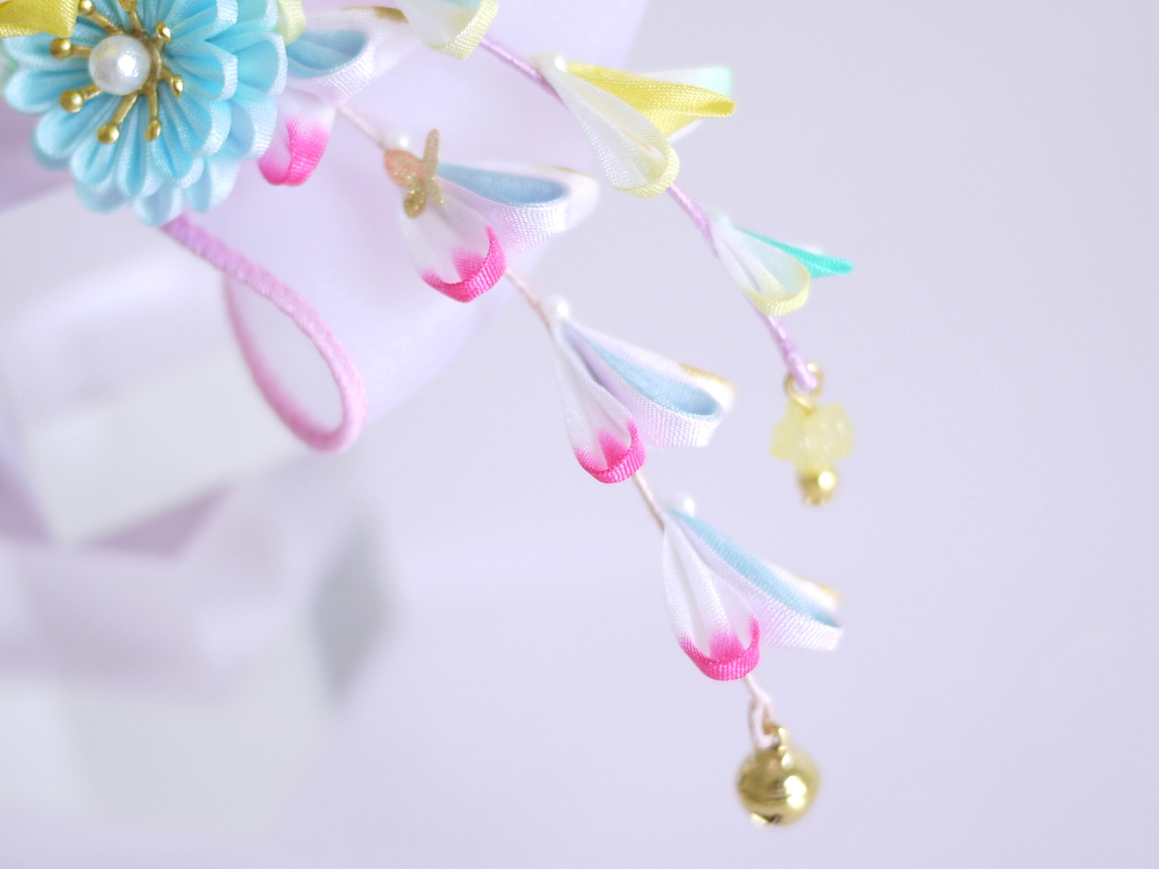 つまみ細工は専用の糊のみで制作しております、水に濡れると糊が溶けて型崩れしたり、正絹地が変形・変色する原因になることがございます。 雨や水濡れ・湿気には十分お気をつけください。 濃色のものは特に色移りする場合がございます