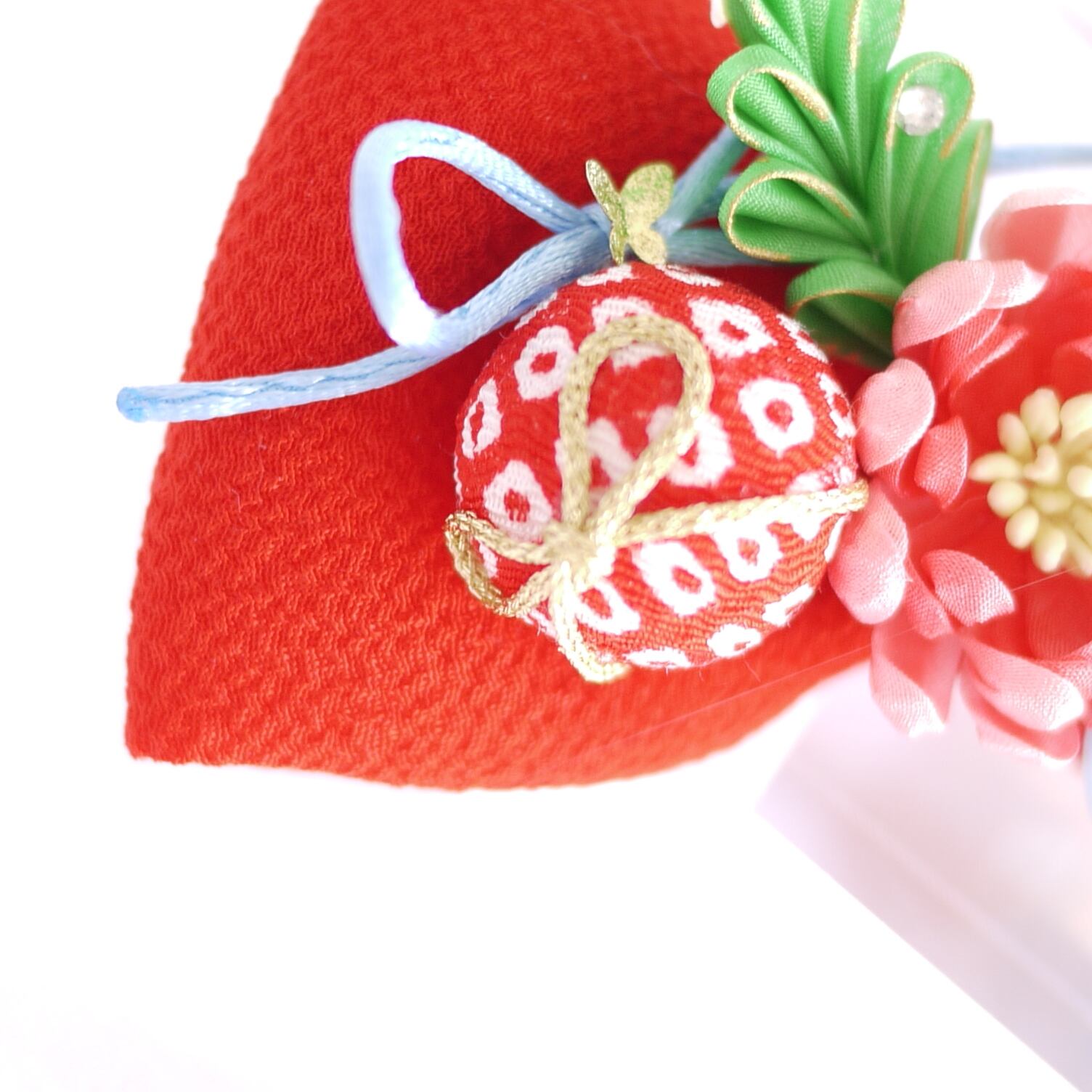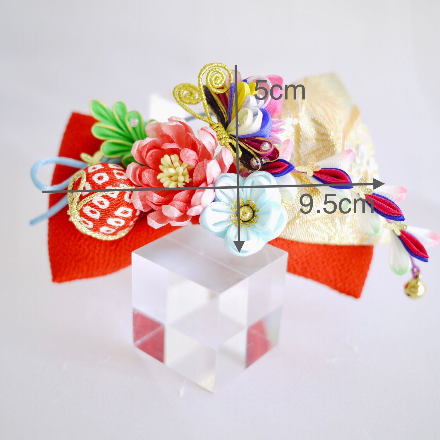 朱赤のちりめんと金襴のリボンがコンパクトながら豪奢な印象のリボン飾り