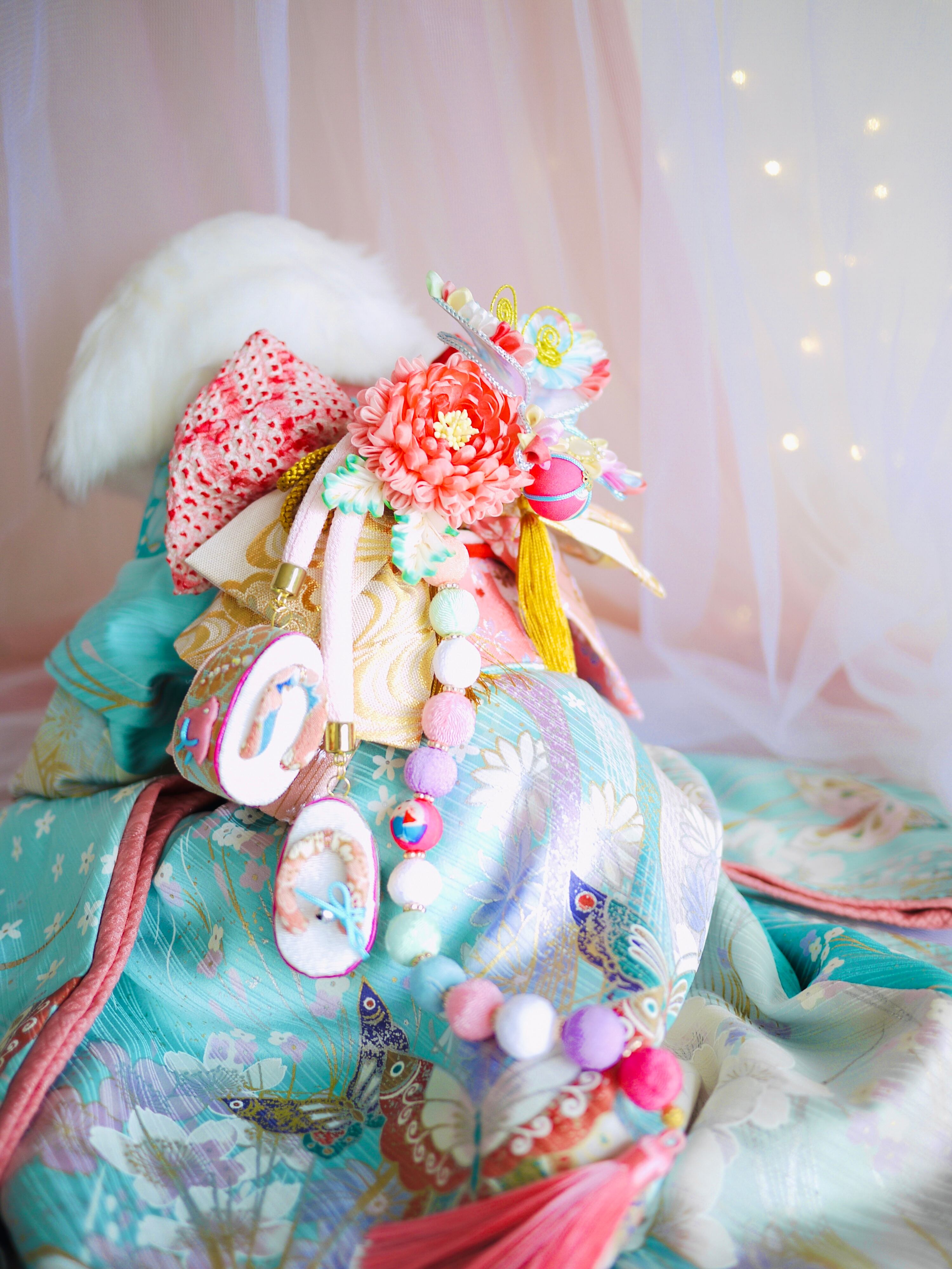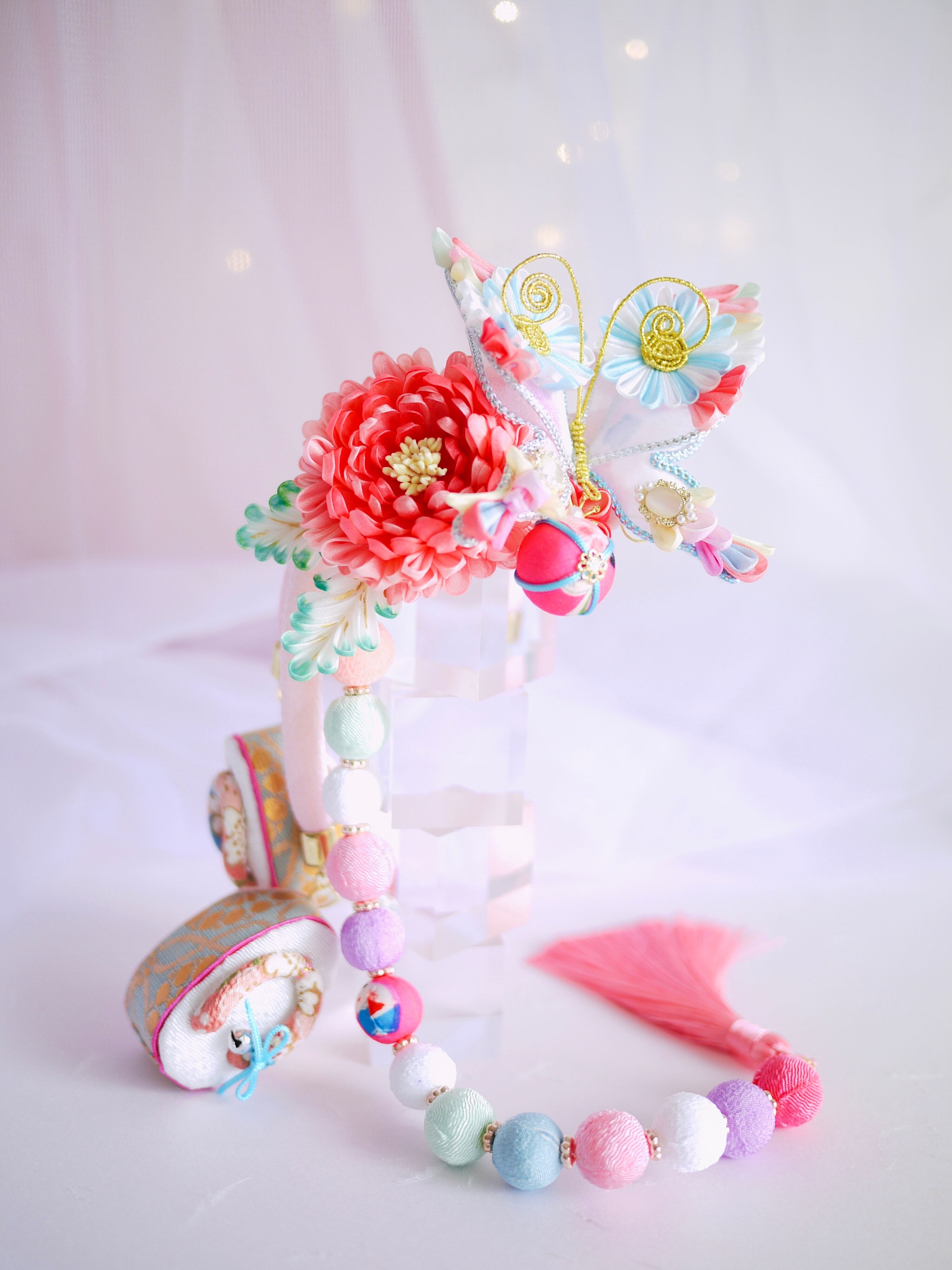 着物柄の牡丹と蝶をイメージしたつまみ細工で繊細さを、ちりめん細工のぽっくりと繭玉飾りでふんわりした愛くるしさの両方を楽しんで頂けるようデザインしました