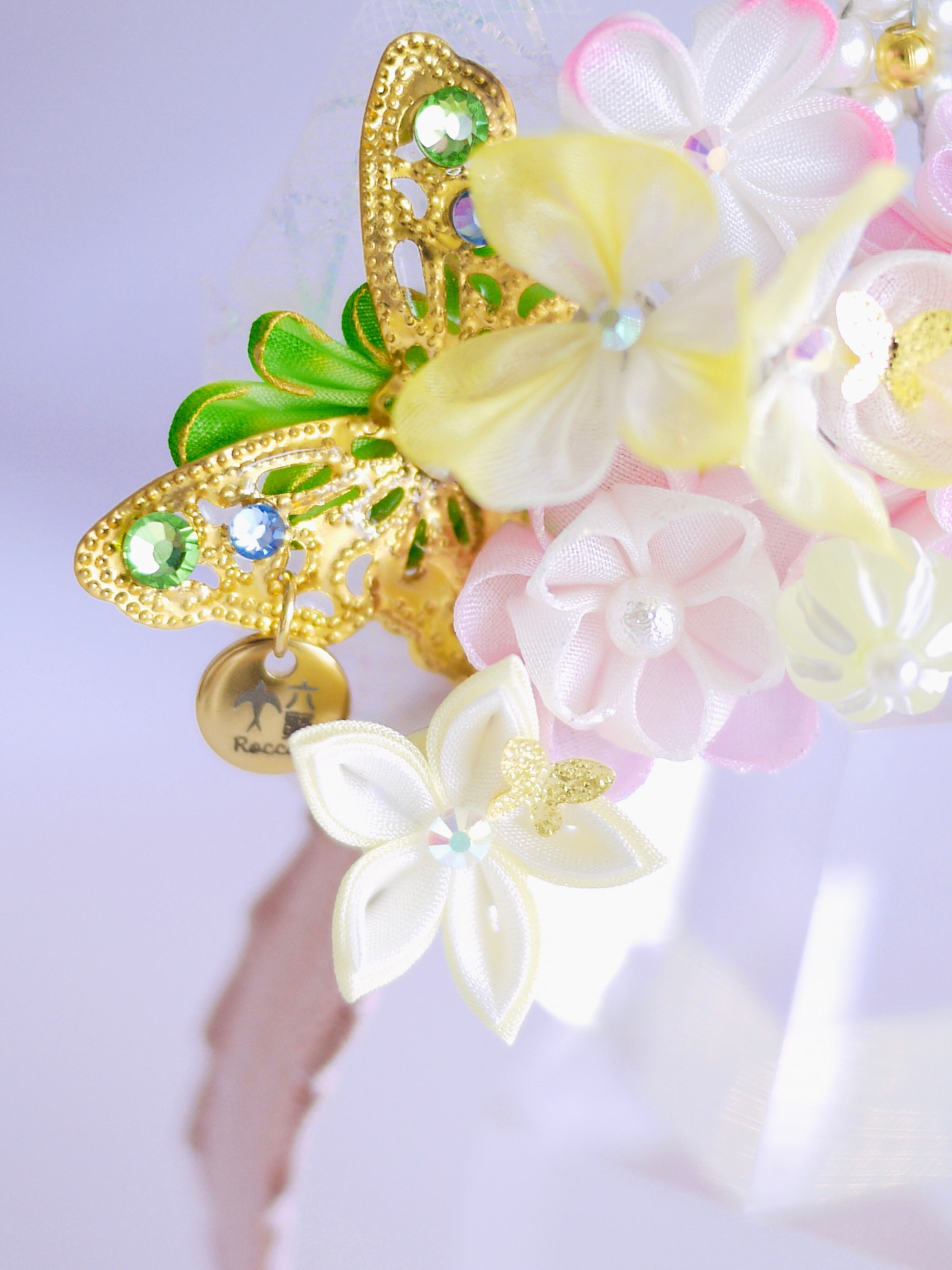 小さなリボンでおめかししたようなピンクの半くすがキュートな印象ですがスワロを纏った金色の蝶々でクラス感UP、古典柄のお着物CDでも浮きません☆