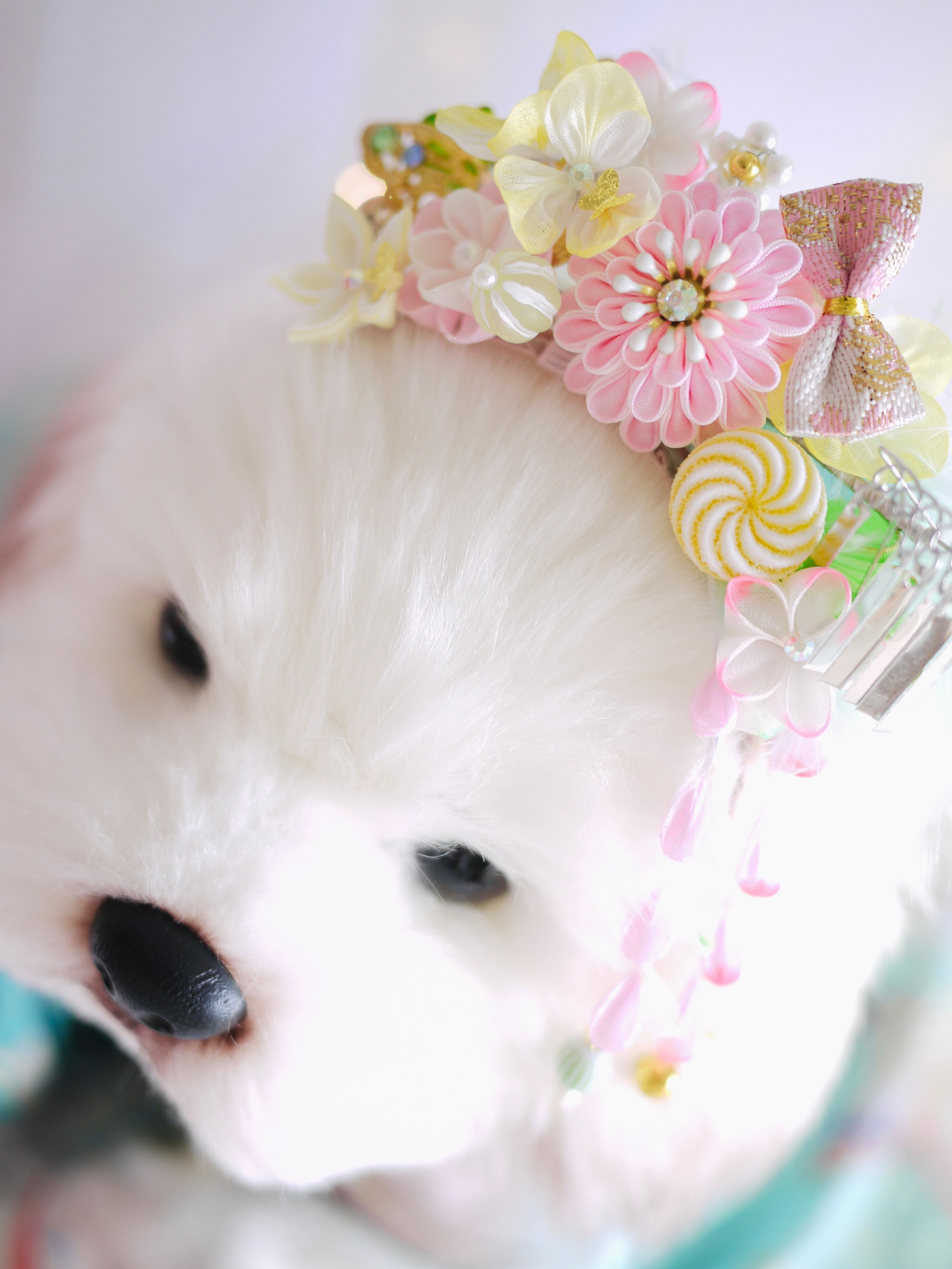 つまみ細工は専用の糊のみで制作しております、水に濡れると糊が溶けて型崩れしたり、正絹地が変形・変色する原因になることがございます。 雨や水濡れ・湿気には十分お気をつけください。 濃色のものは特に色移りする場合がございます