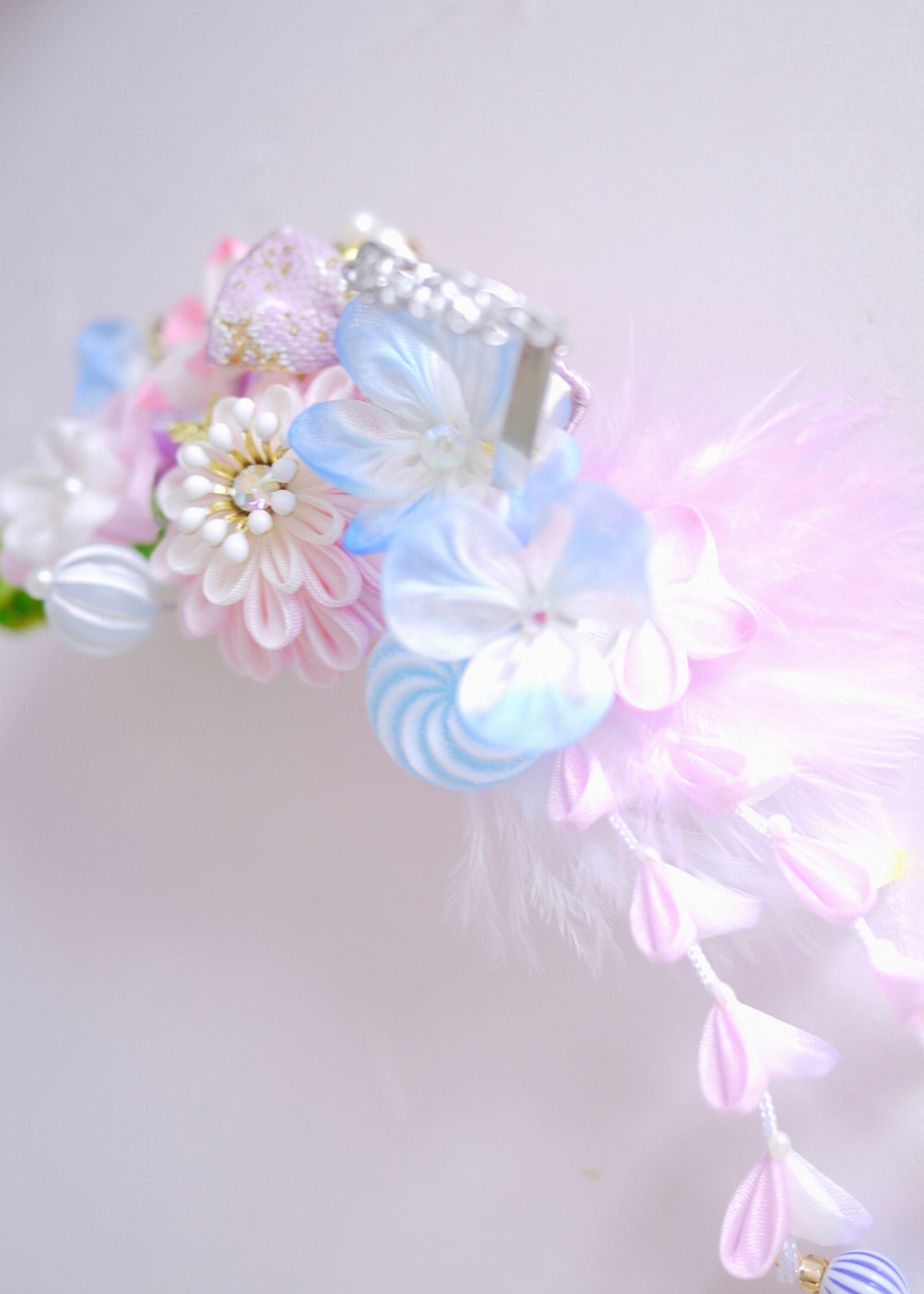 つまみ細工は専用の糊のみで制作しております、水に濡れると糊が溶けて型崩れしたり、正絹地が変形・変色する原因になることがございます。 雨や水濡れ・湿気には十分お気をつけください。 濃色のものは特に色移りする場合がございます