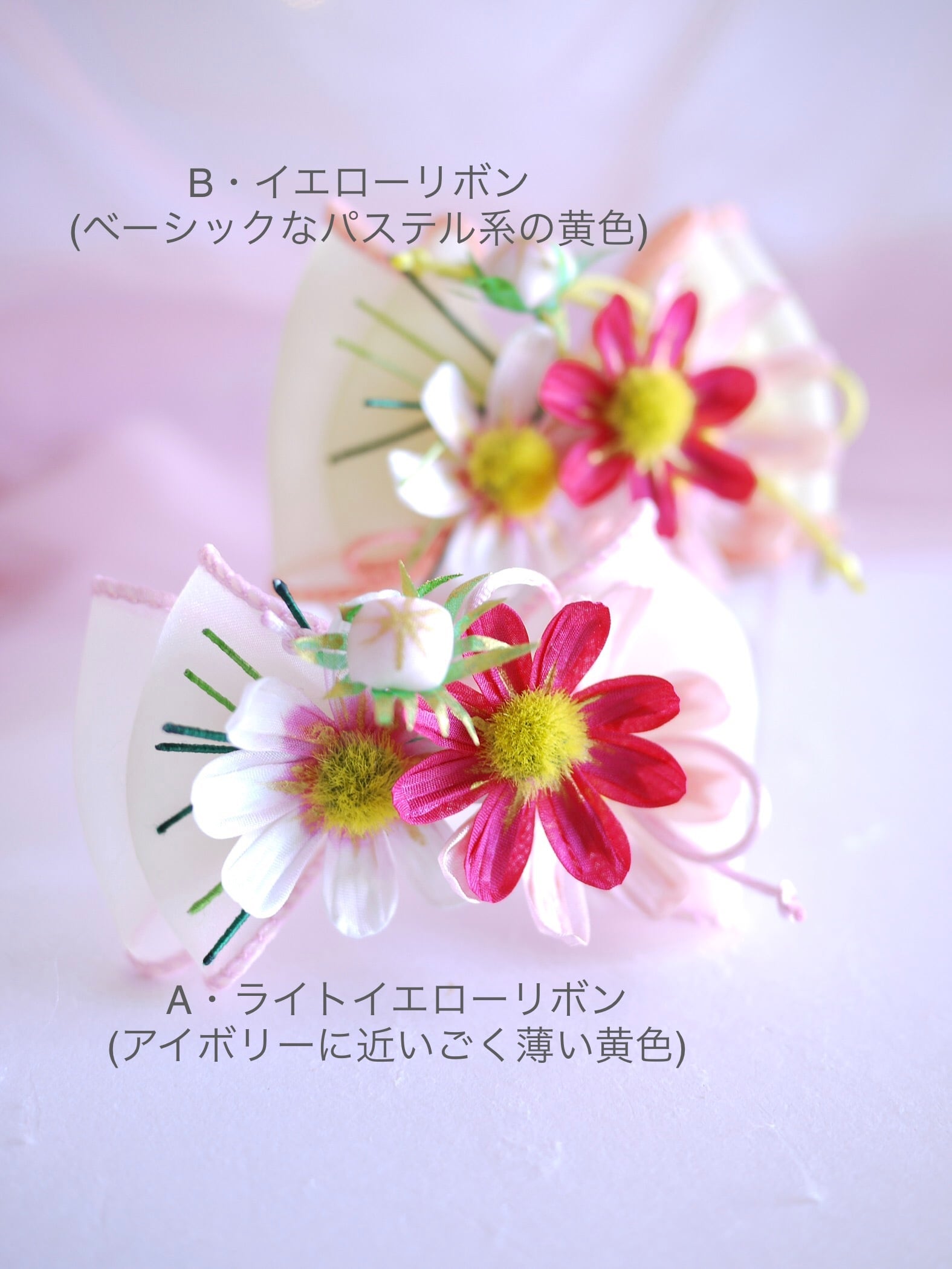 お洋服にも合わせやすいようオーガンジーのパイピングリボンで軽やかに可愛らしく仕上げました