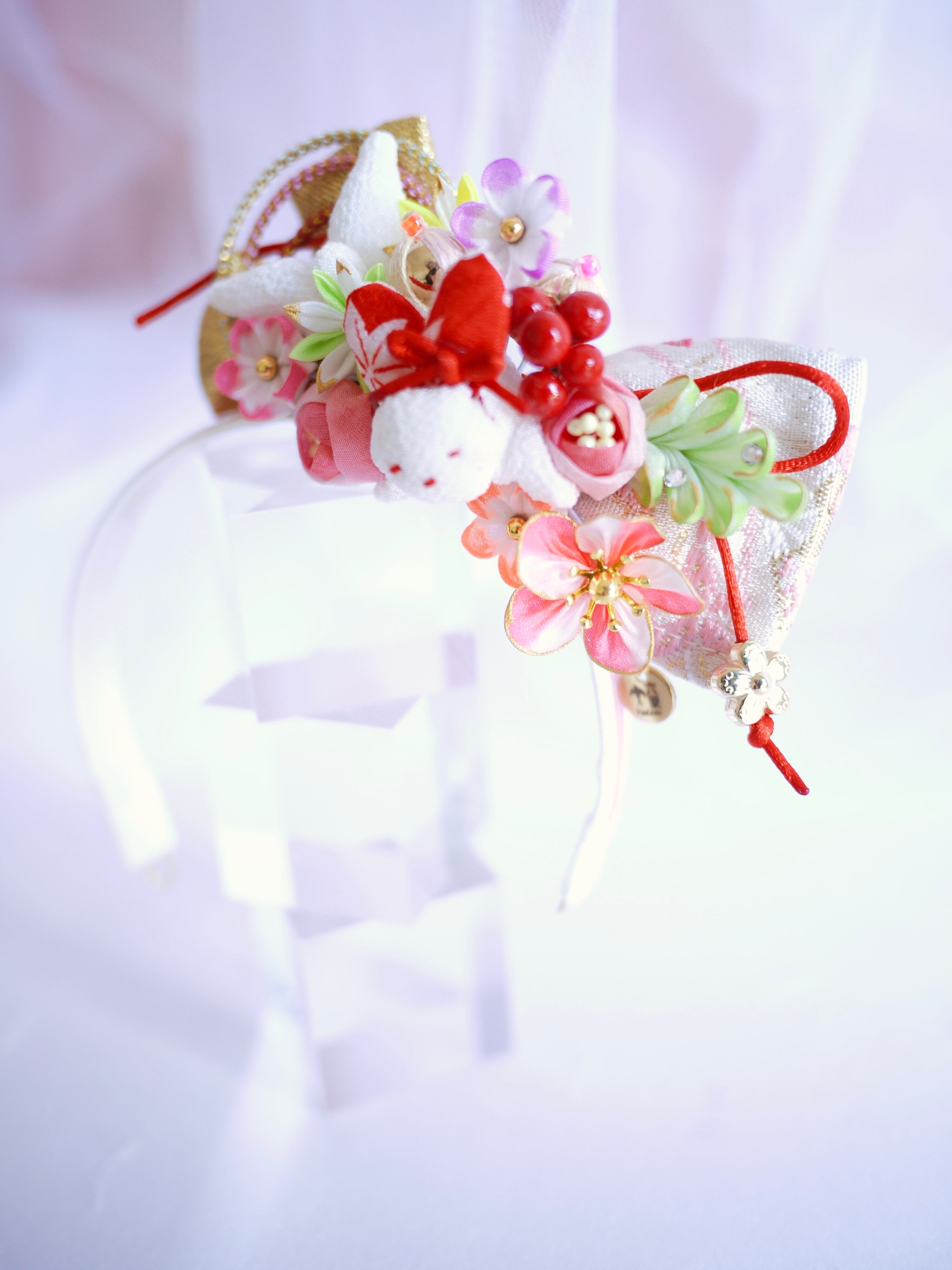 ちりめん素材が入ると羽二重つまみ細工オンリーのお飾りより少々重さが出てしまいますが、頑張ってをうさぎさんを豆サイズに仕上げて軽減していますのでご了承ください☺︎