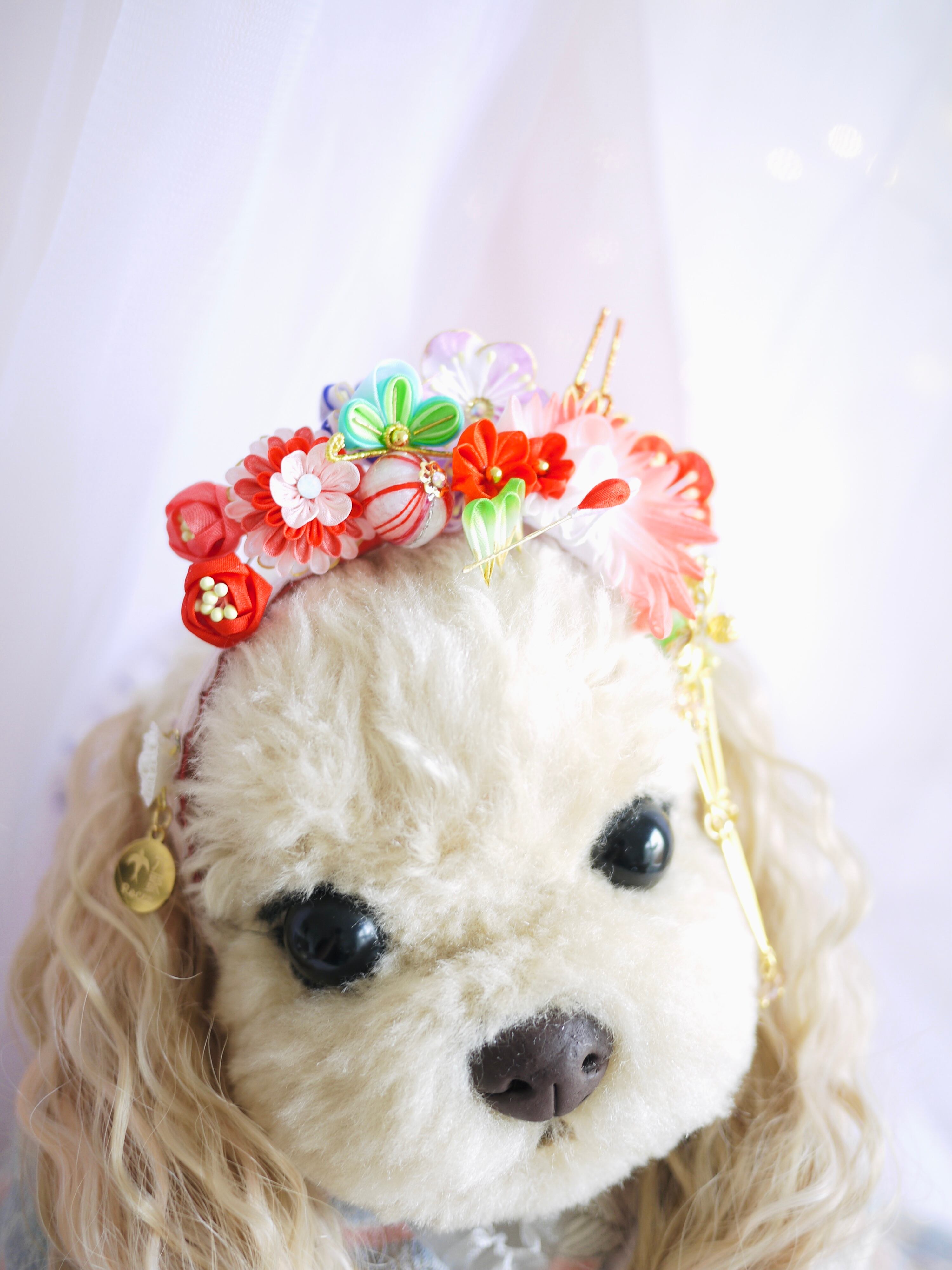 つまみ細工は専用の糊のみで制作しております、水に濡れると糊が溶けて型崩れしたり、正絹地が変形・変色する原因になることがございます。 雨や水濡れ・湿気には十分お気をつけください。 濃色のものは特に色移りする場合がございます