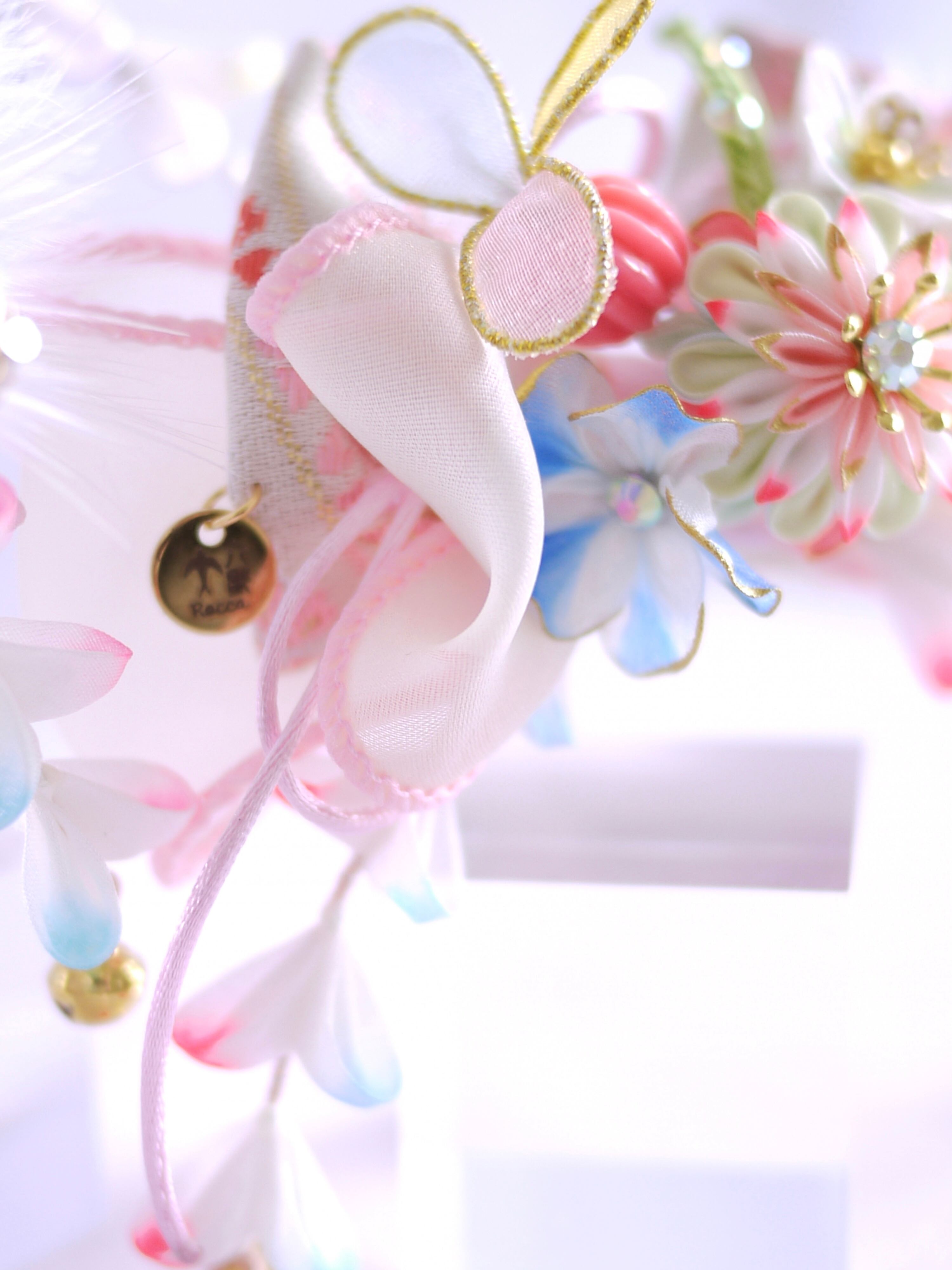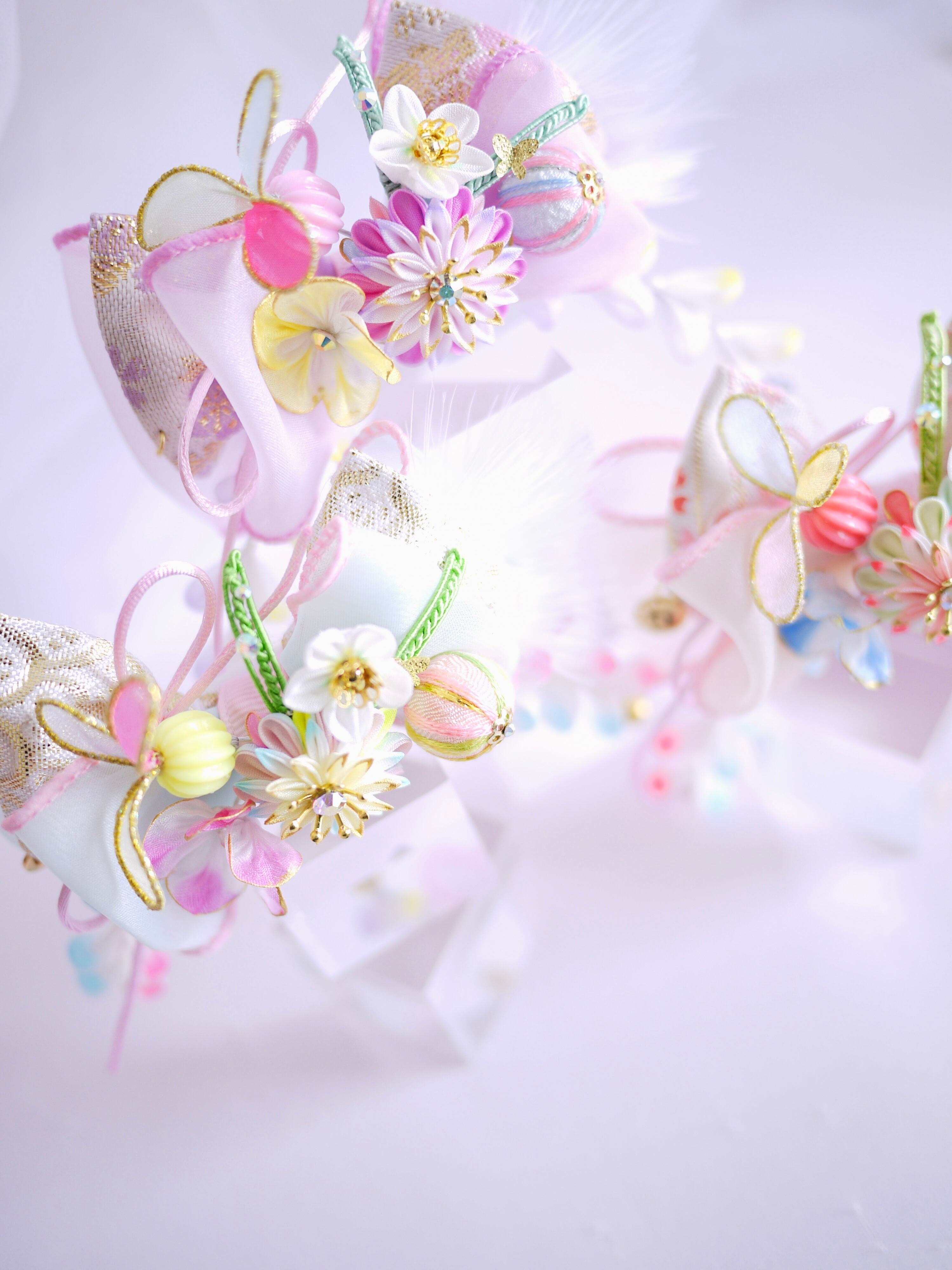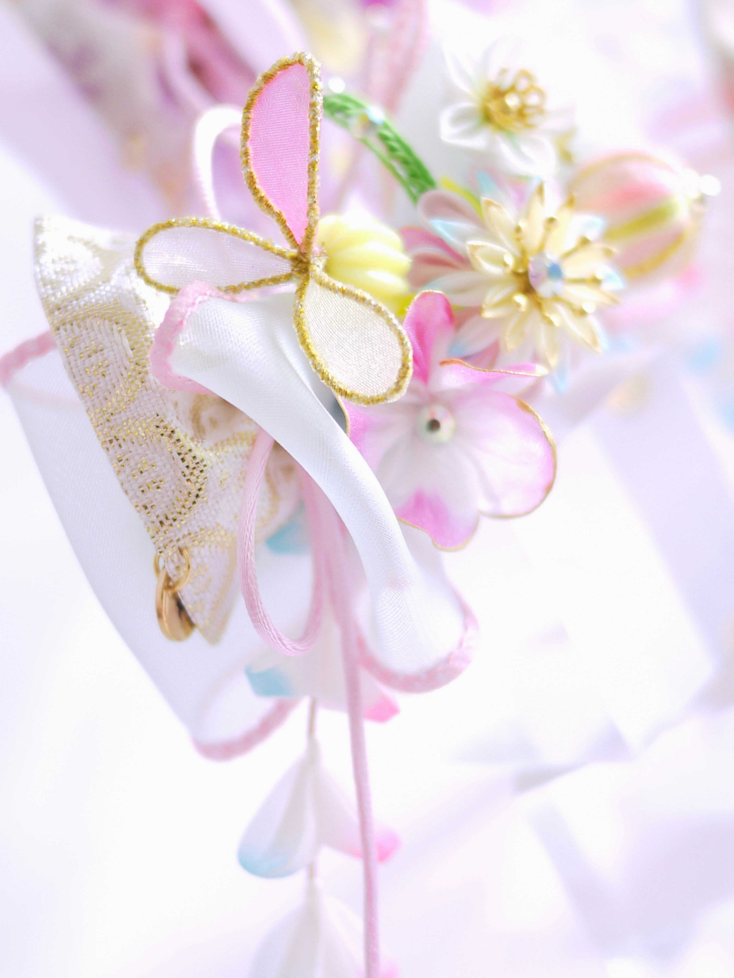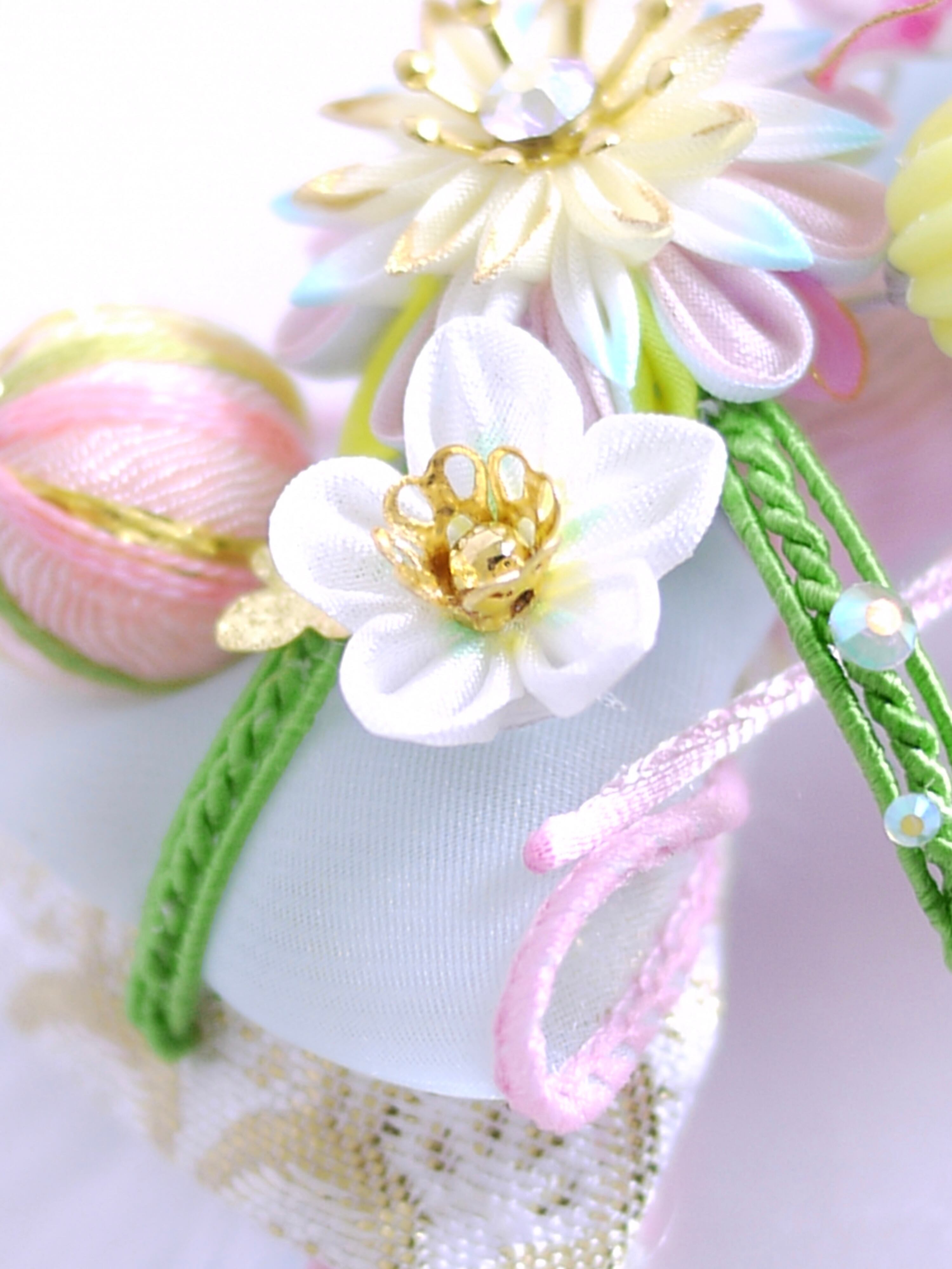 つまみ細工は専用の糊のみで制作しております、水に濡れると糊が溶けて型崩れしたり、正絹地が変形・変色する原因になることがございます。 雨や水濡れ・湿気には十分お気をつけください。 濃色のものは特に色移りする場合がございます