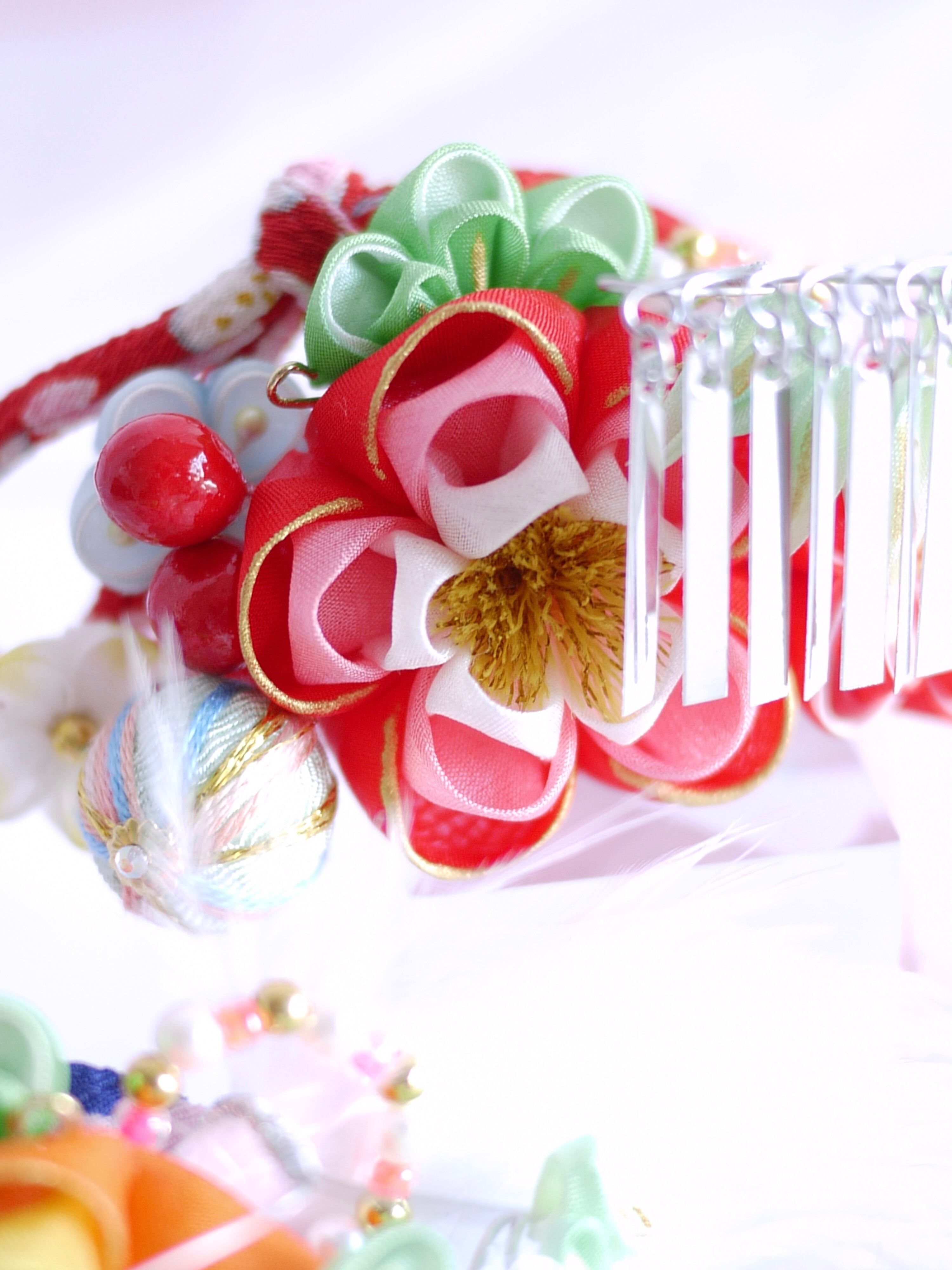 つまみ細工は専用の糊のみで制作しております、水に濡れると糊が溶けて型崩れしたり、正絹地が変形・変色する原因になることがございます。 雨や水濡れ・湿気には十分お気をつけください。 濃色のものは特に色移りする場合がございます