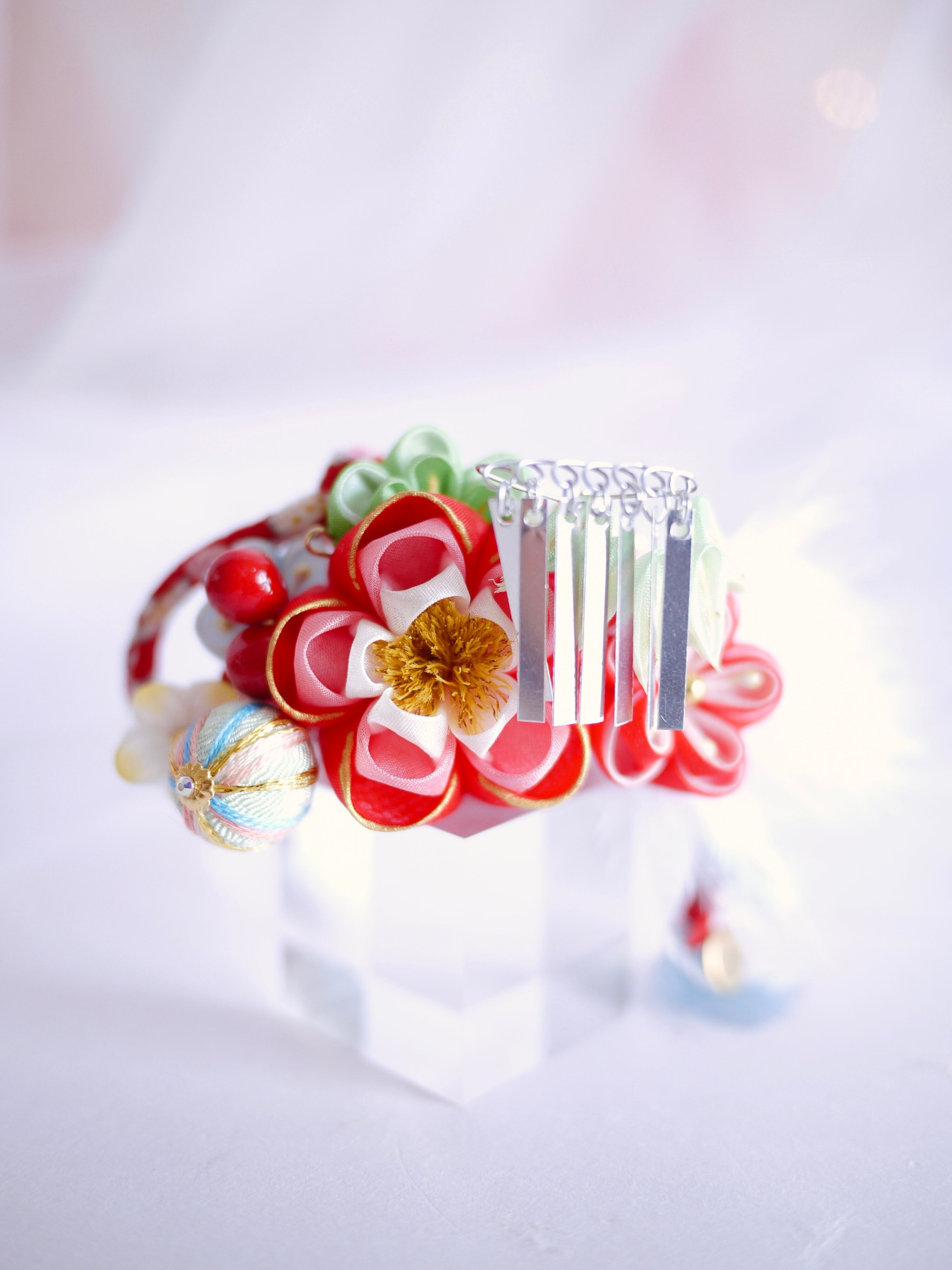 おめでたいふっくら重ね梅とビーズの輪飾りでちょっぴりレトロな雰囲気で人気の『つぐみ』にお正月モチーフの竹と松を入れたSPバージョン
