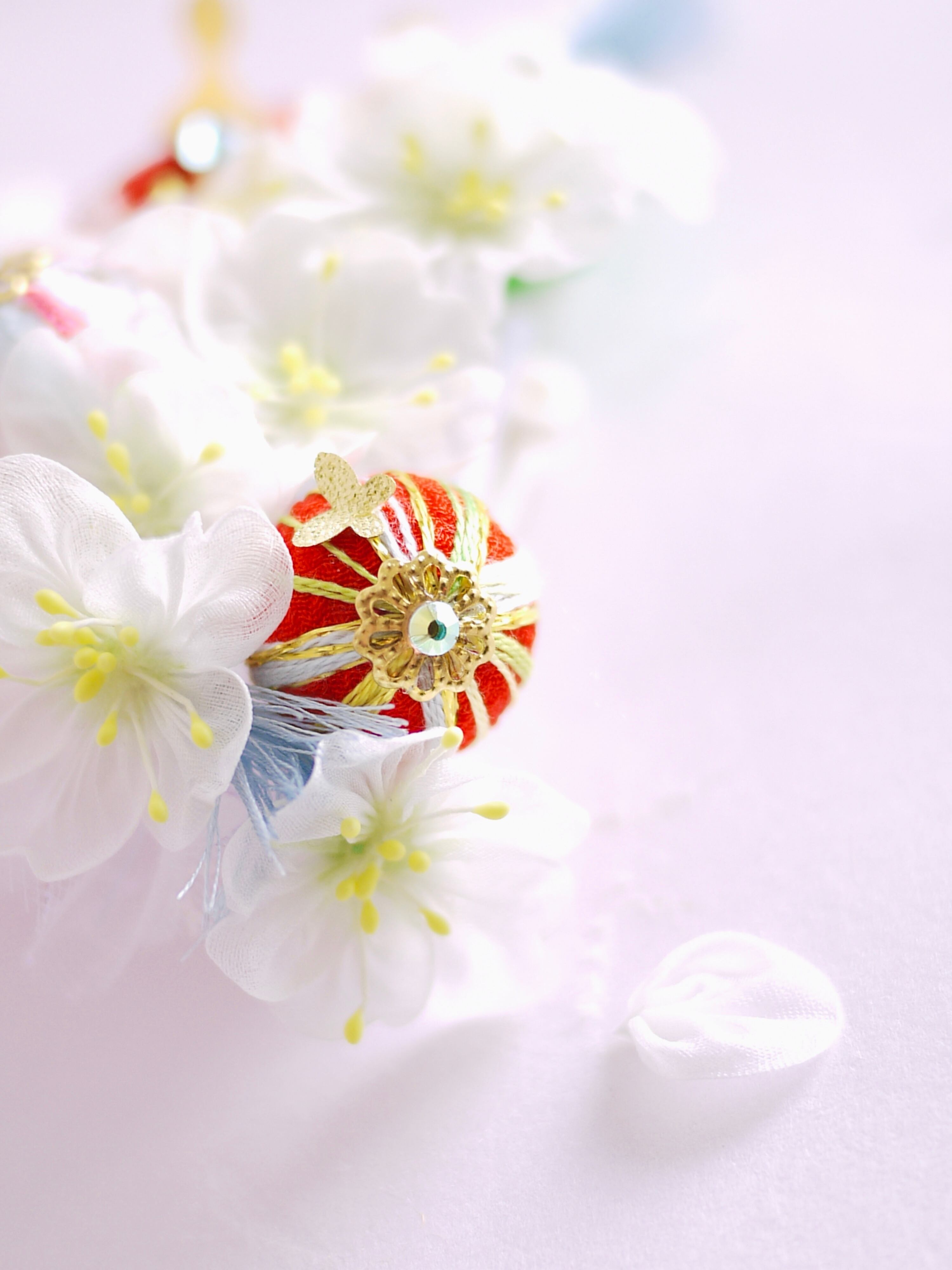 つまみ細工は専用の糊のみで制作しております、水に濡れると糊が溶けて型崩れしたり、正絹地が変形・変色する原因になることがございます。 雨や水濡れ・湿気には十分お気をつけください。 濃色のものは特に色移りする場合がございます