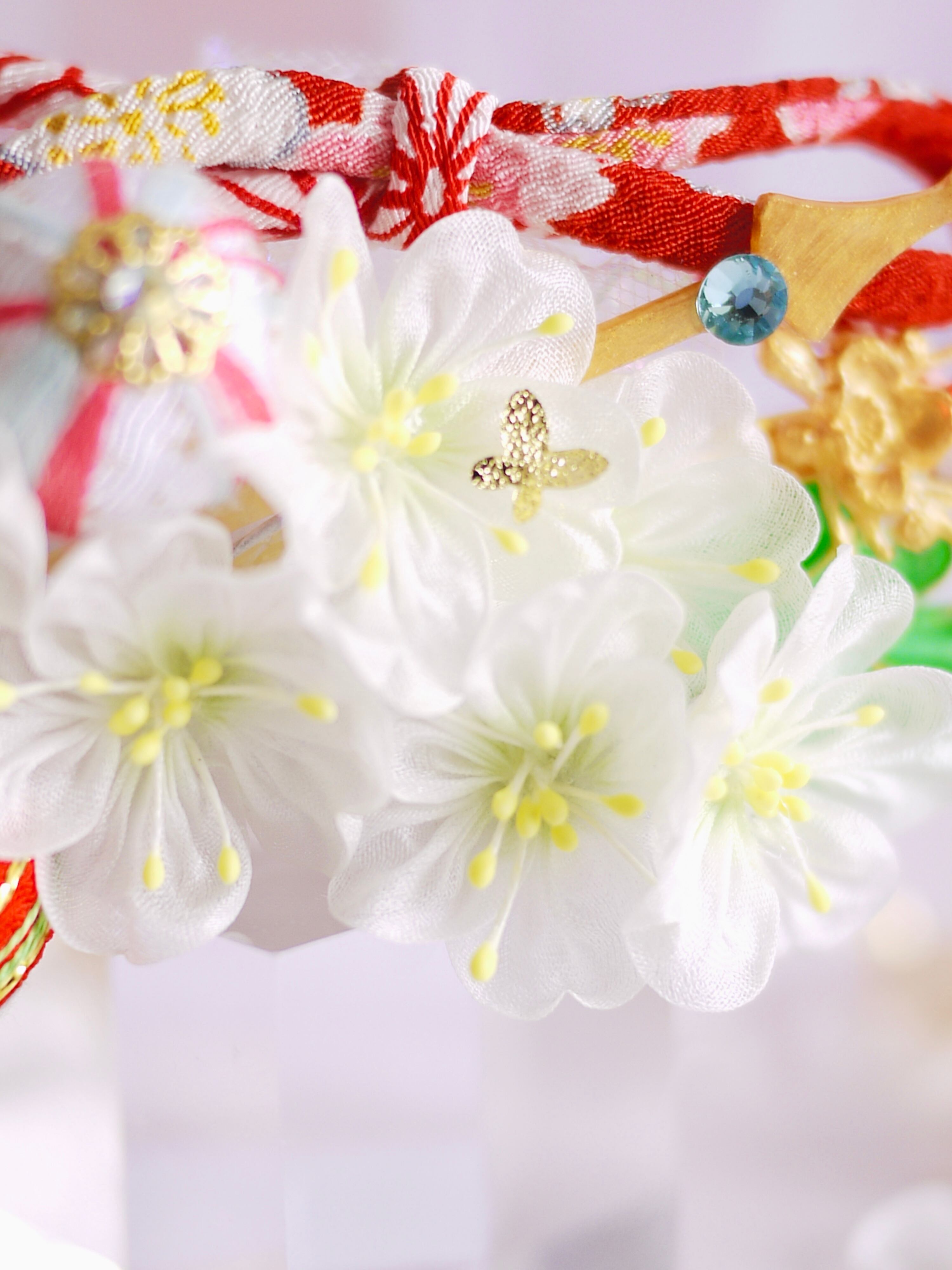 白い桜というと開花期によって色変わりする品種が多いですが、散り際に淡墨色になる前の最も絢爛に咲き誇る満開時の純白の桜を簪に閉じ込めました