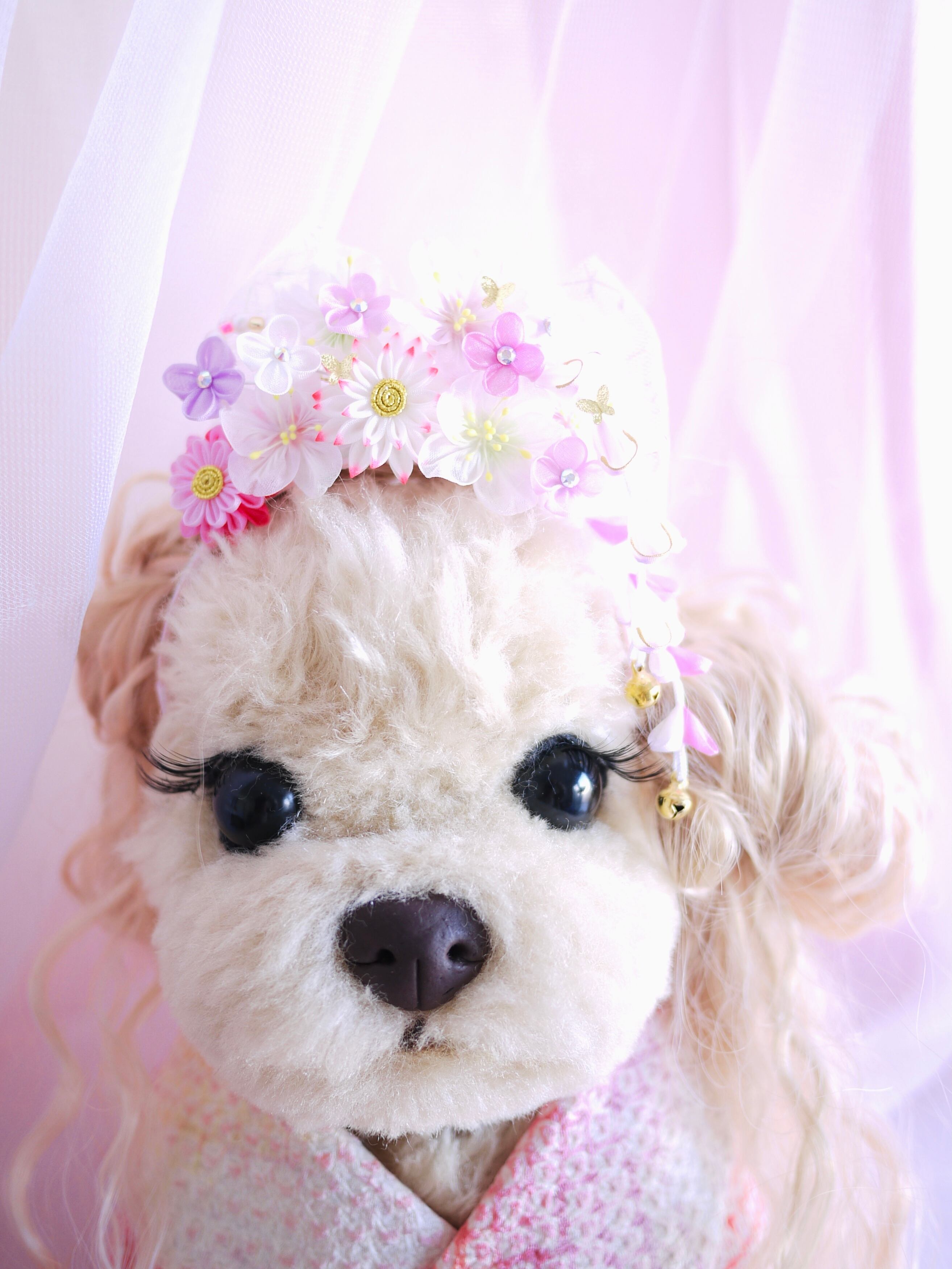 桜とピンポンマムに見立てた半くすをMIXした春の花かんざし、小花をふんわり盛りました。リボンを添えていますが、お花が主役のデザインですのでクリアなチュールリボンで軽やか仕上げ