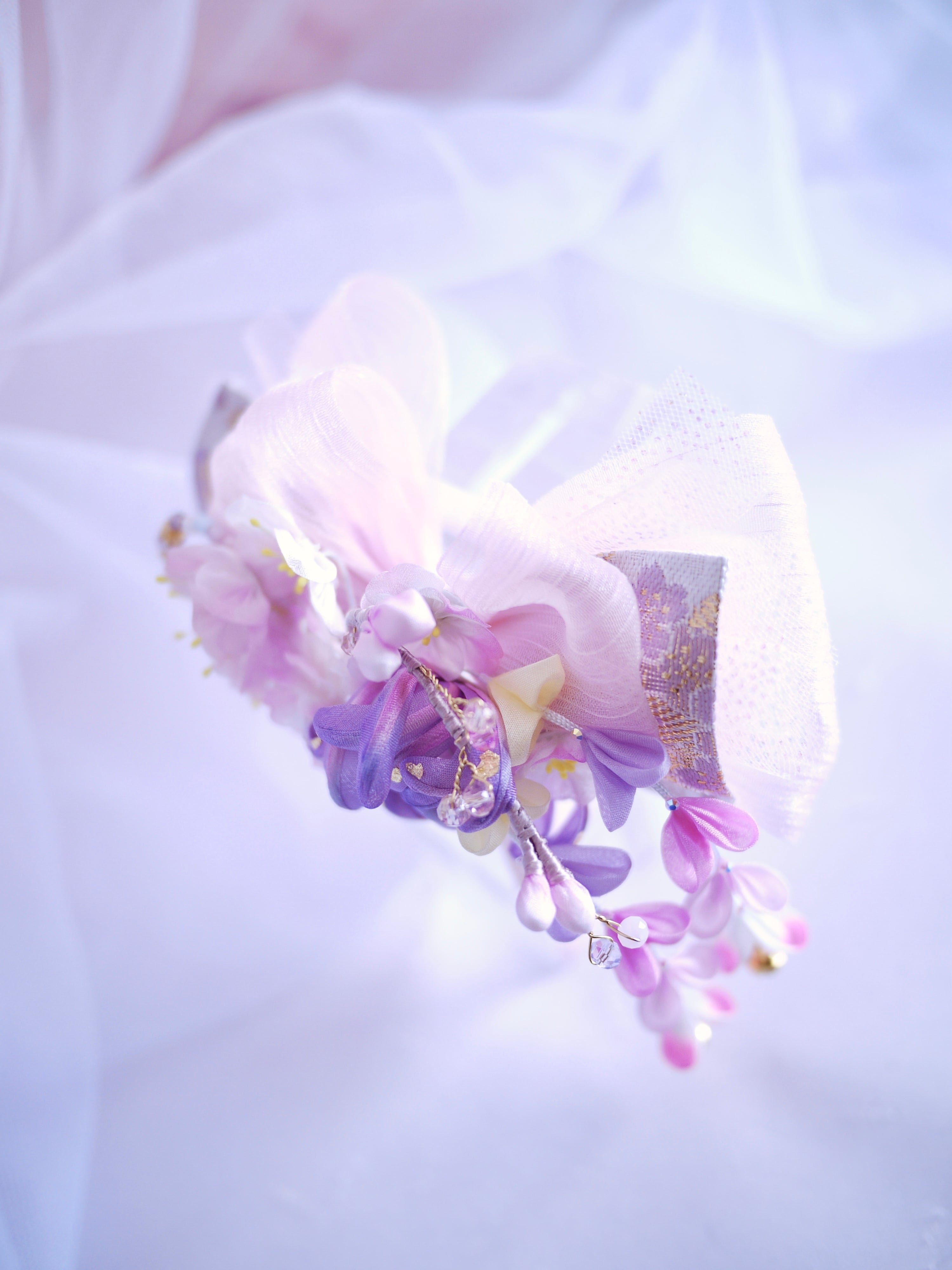 つまみ細工は専用の糊のみで制作しております、水に濡れると糊が溶けて型崩れしたり、正絹地が変形・変色する原因になることがございます。 雨や水濡れ・湿気には十分お気をつけください。 濃色のものは特に色移りする場合がございます