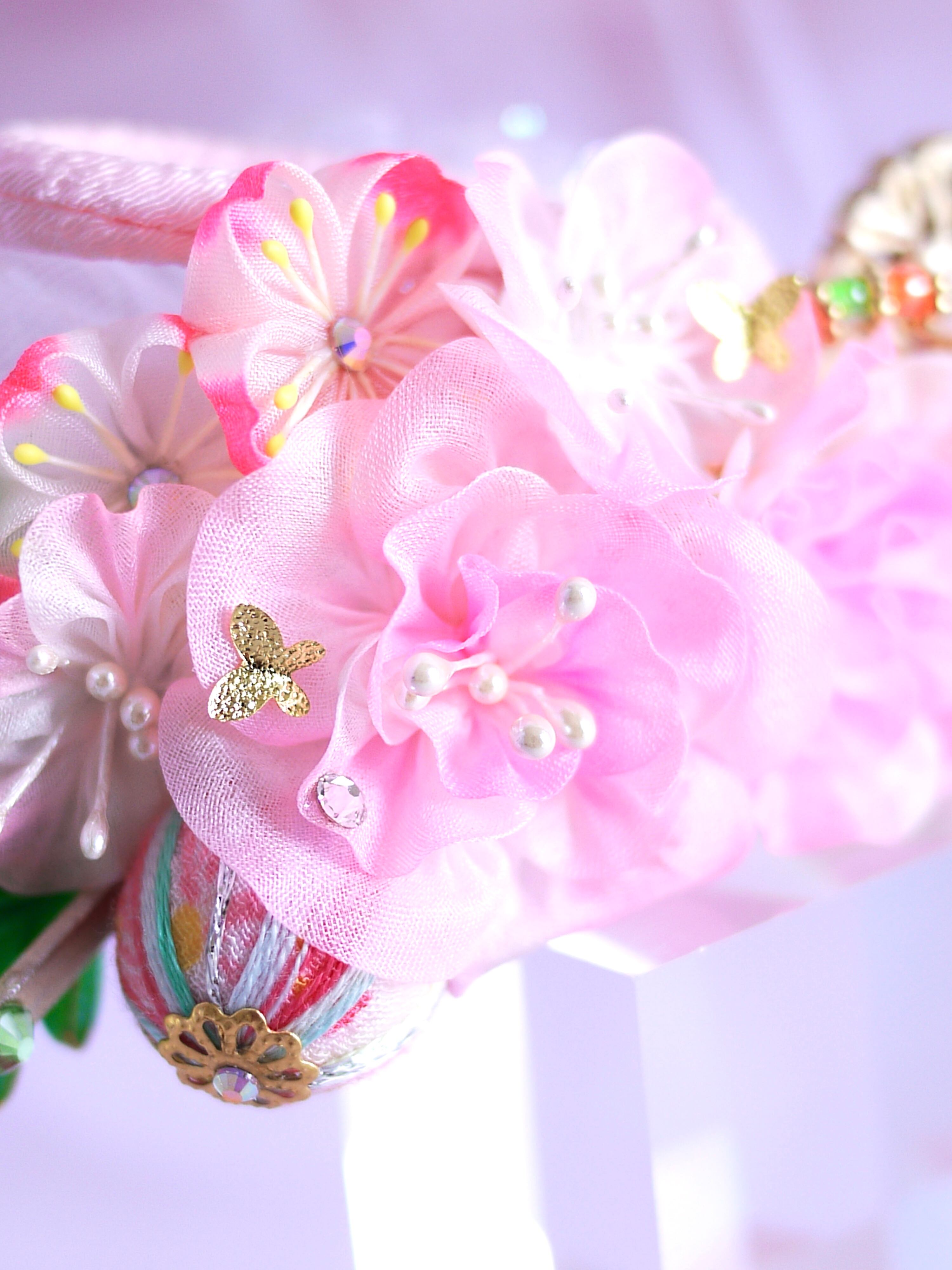 つまみ細工は専用の糊のみで制作しております、水に濡れると糊が溶けて型崩れしたり、正絹地が変形・変色する原因になることがございます。 雨や水濡れ・湿気には十分お気をつけください。 濃色のものは特に色移りする場合がございます