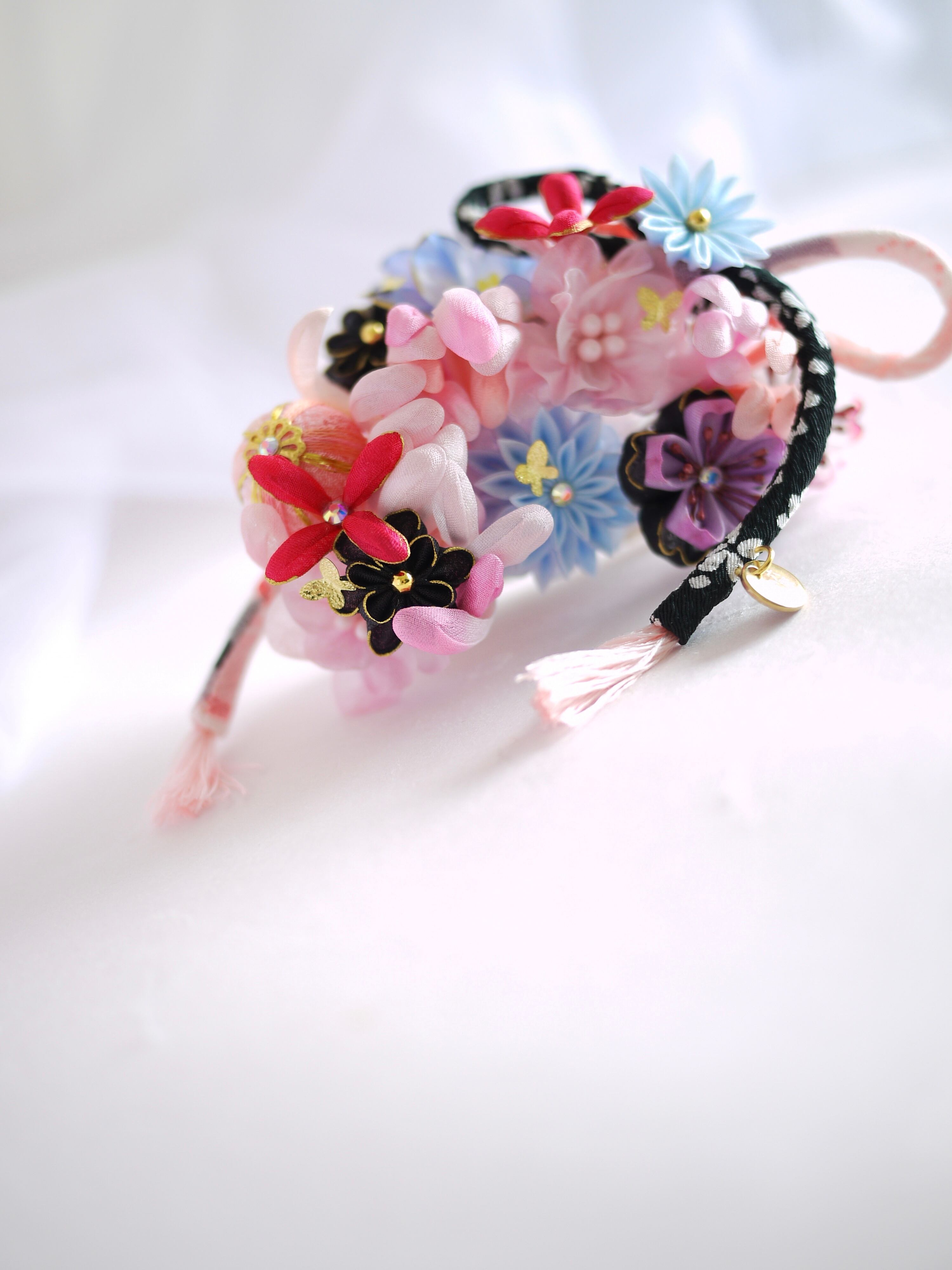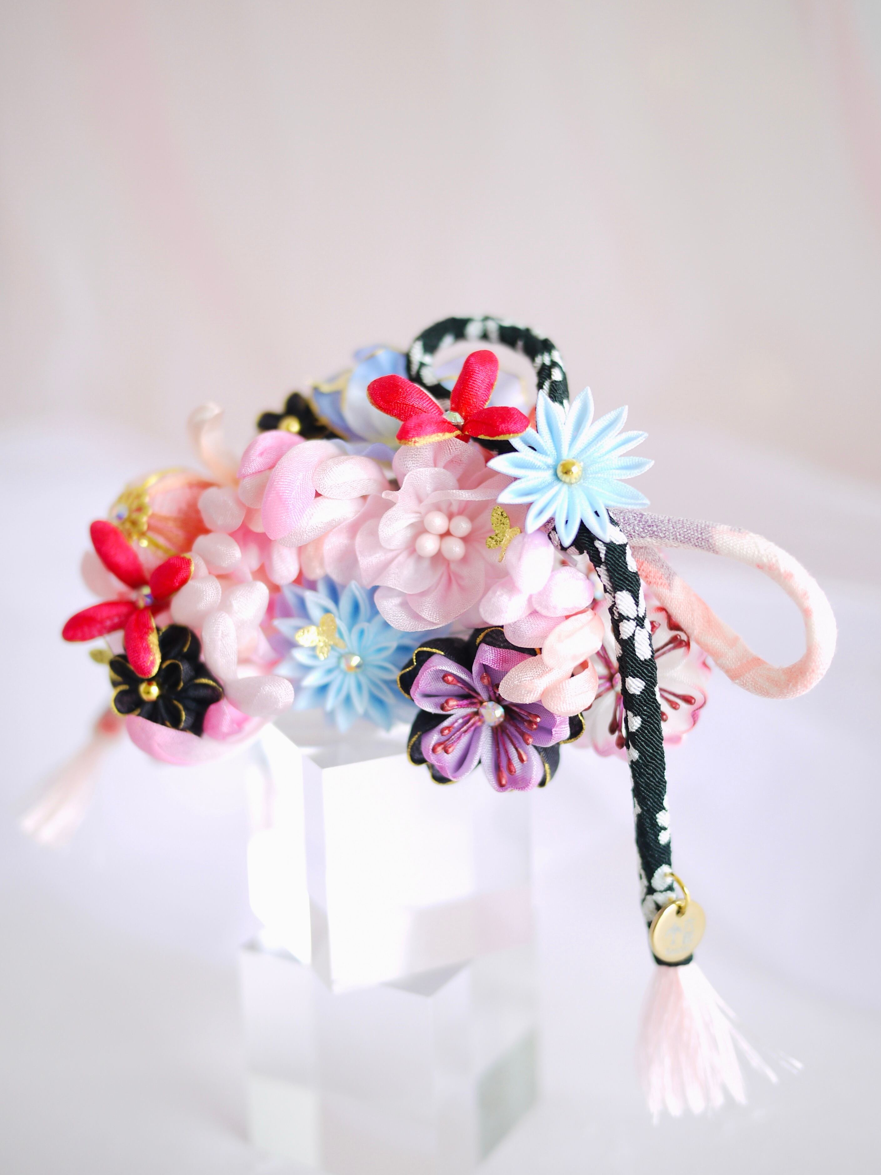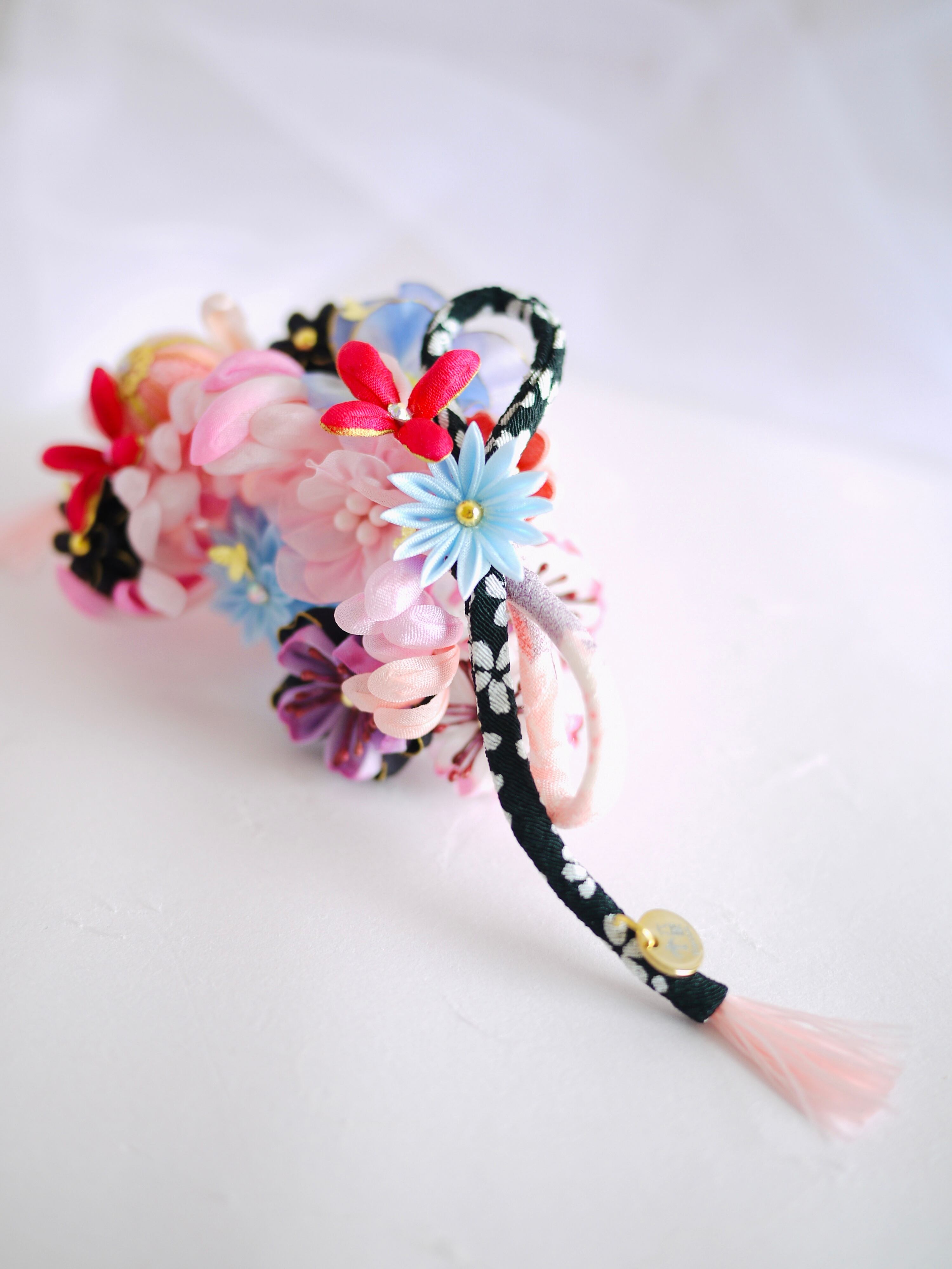 2.3着目に黒地のお着物選ぶ方も多いと思うのですが、意外とこういう配色のお飾りは少ないかなー?とご用意しました☆