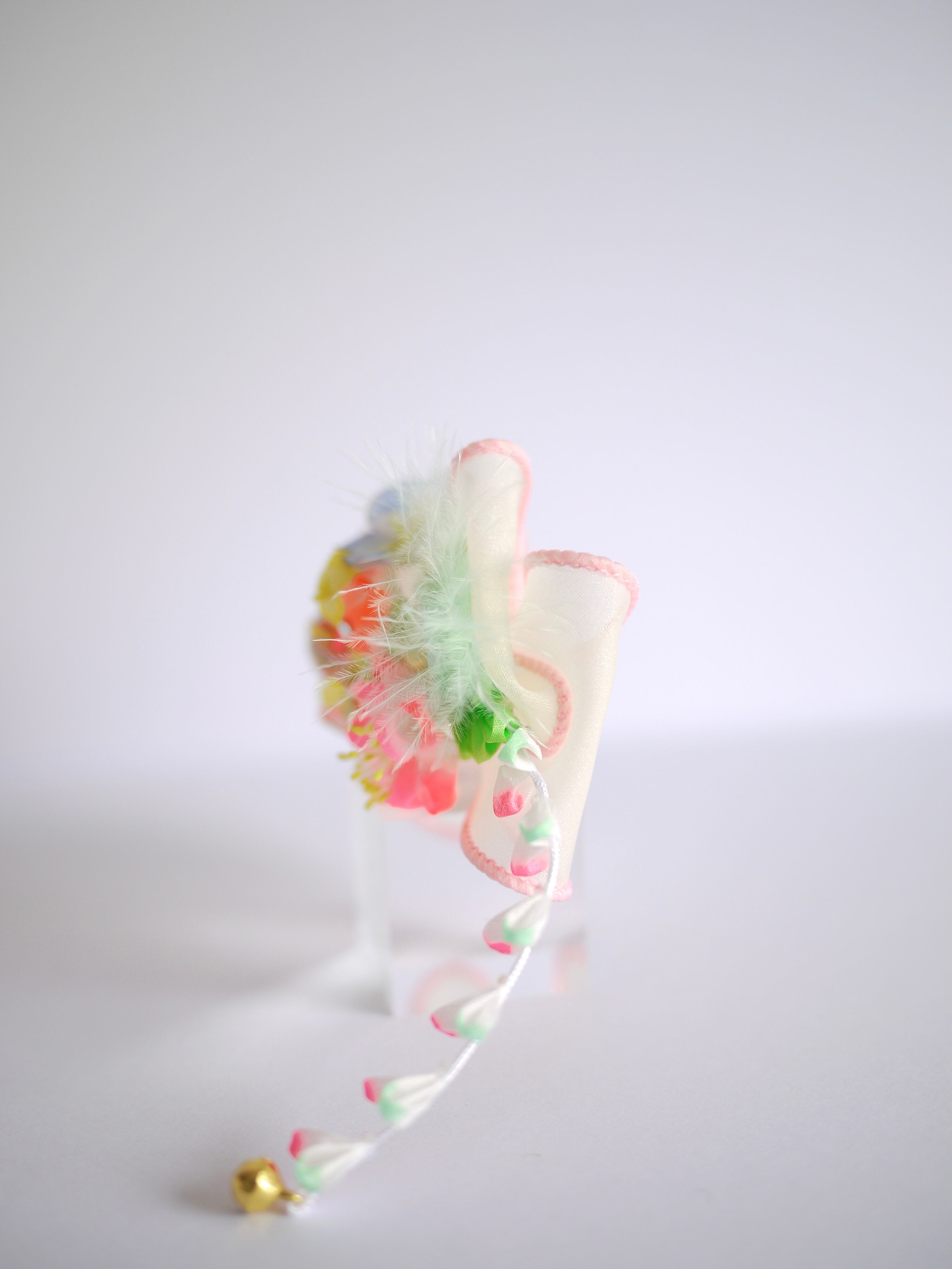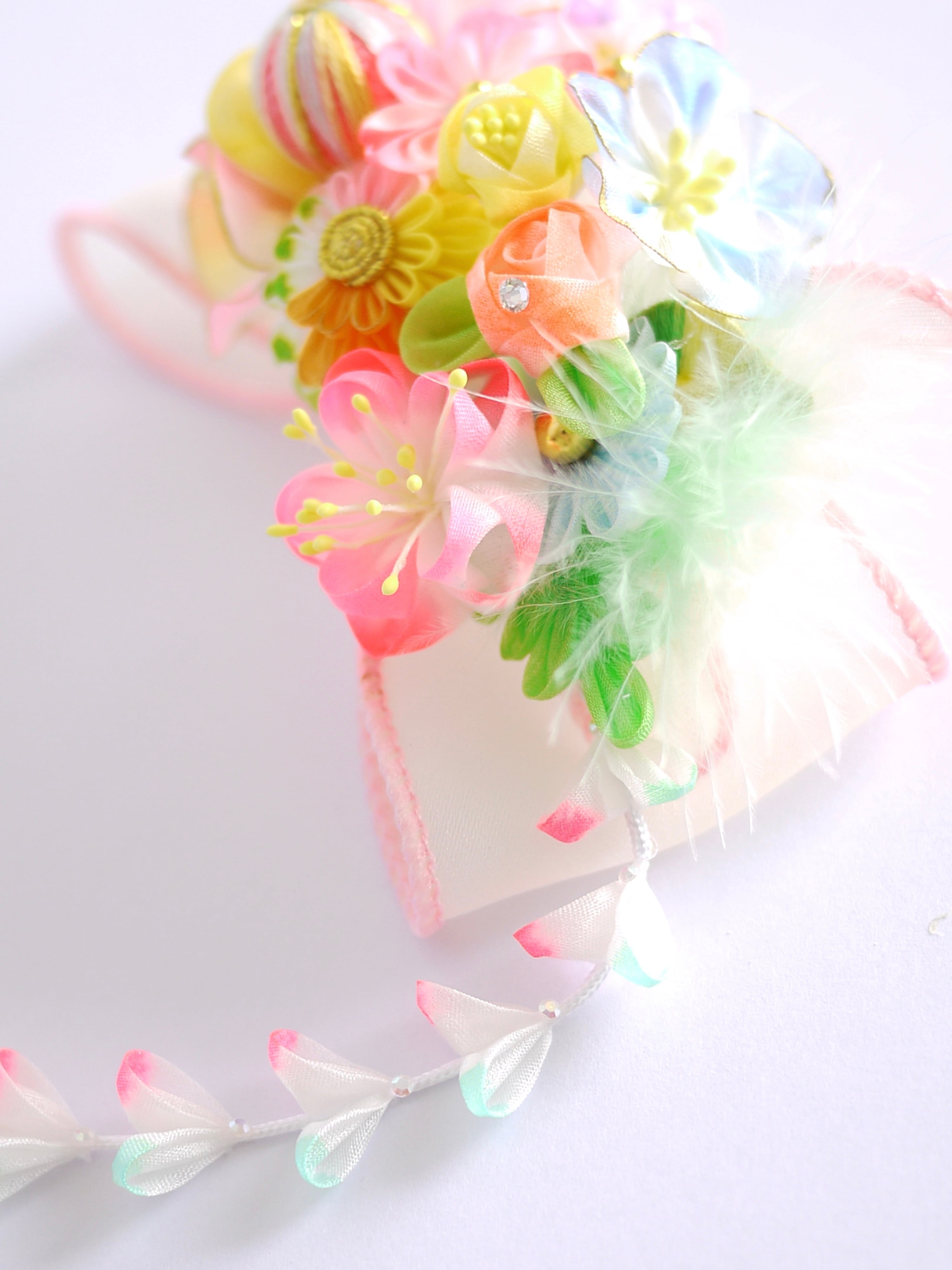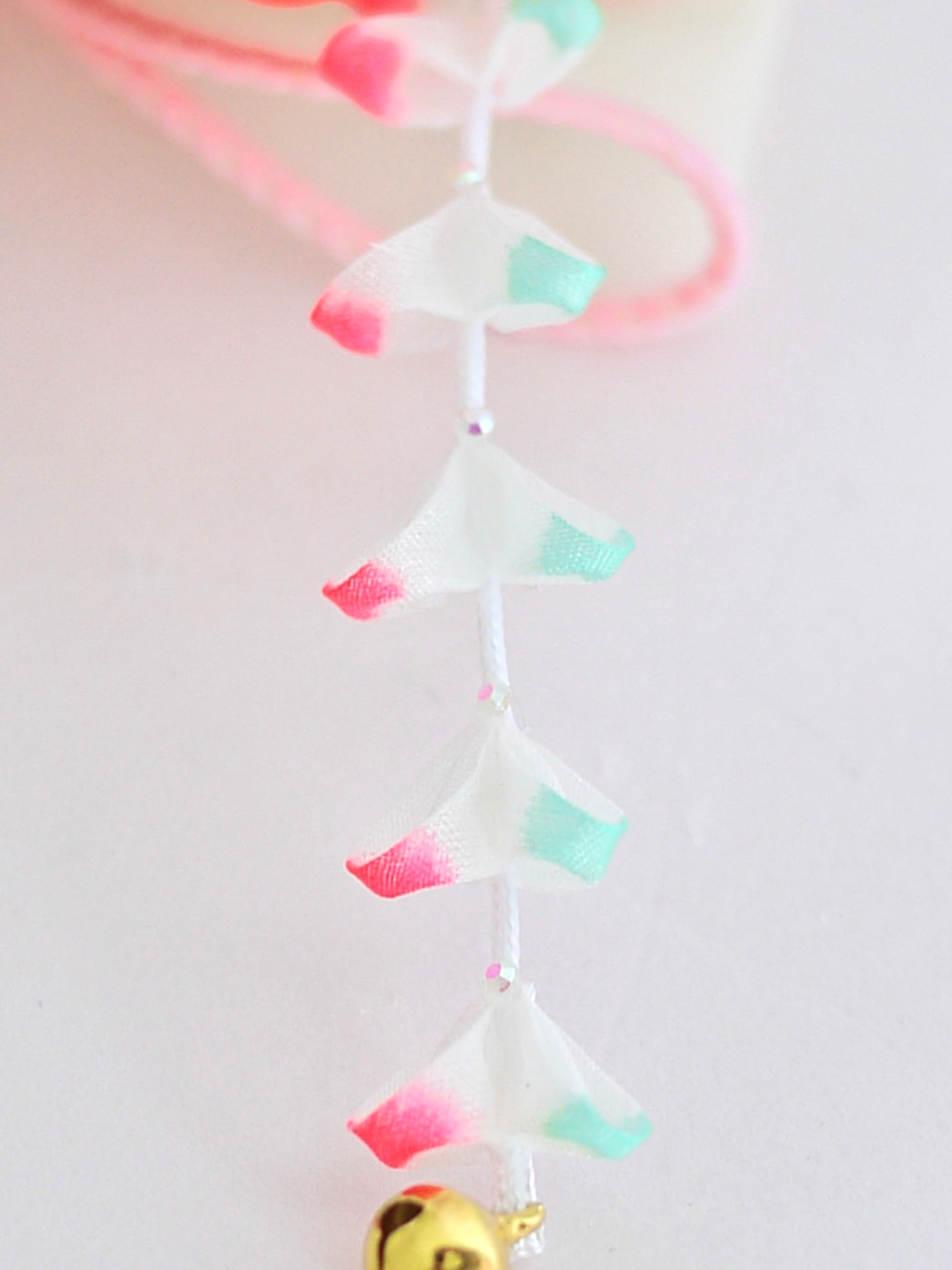 つまみ細工は専用の糊のみで制作しております、水に濡れると糊が溶けて型崩れしたり、正絹地が変形・変色する原因になることがございます。 雨や水濡れ・湿気には十分お気をつけください。 濃色のものは特に色移りする場合がございます