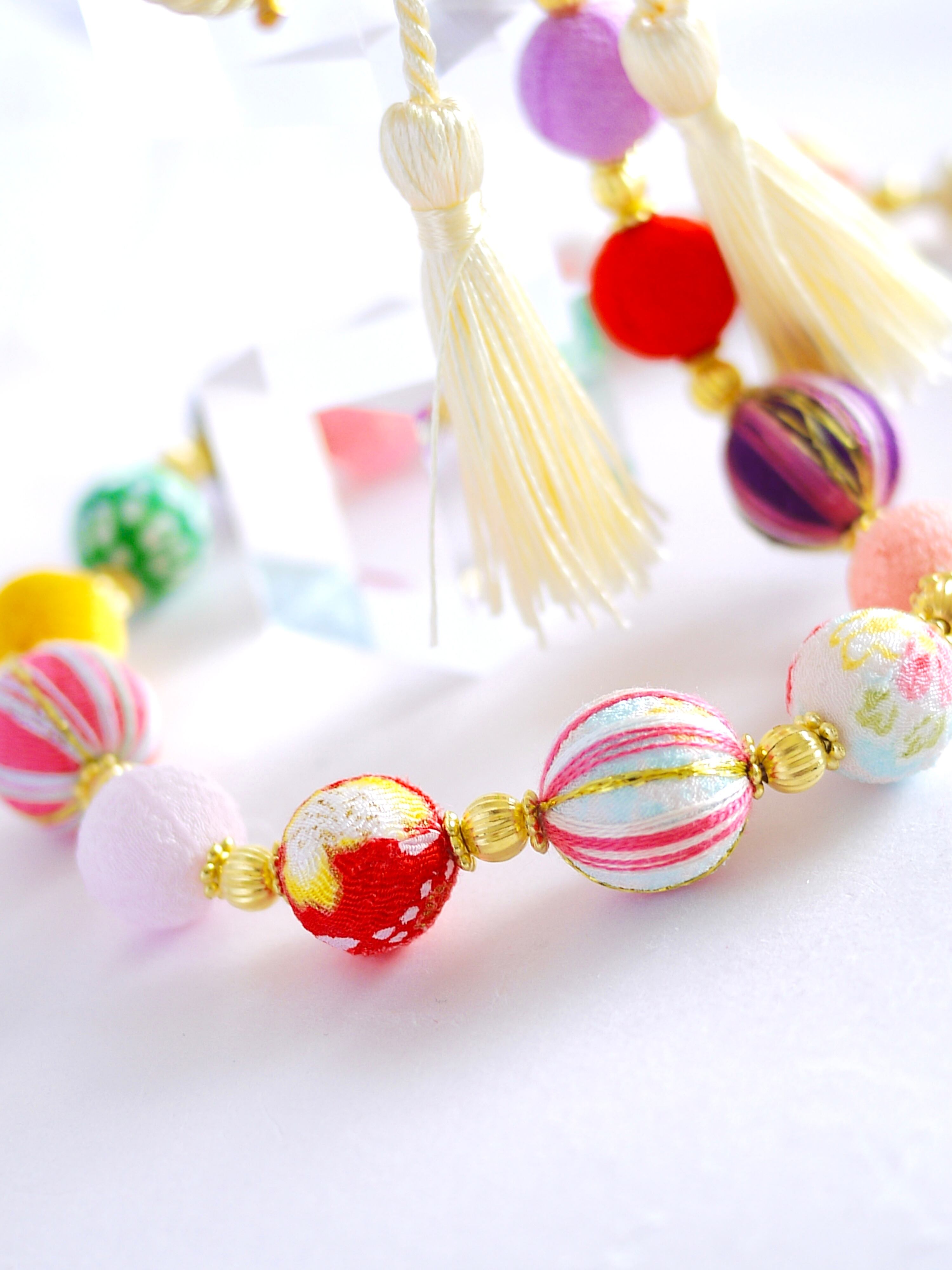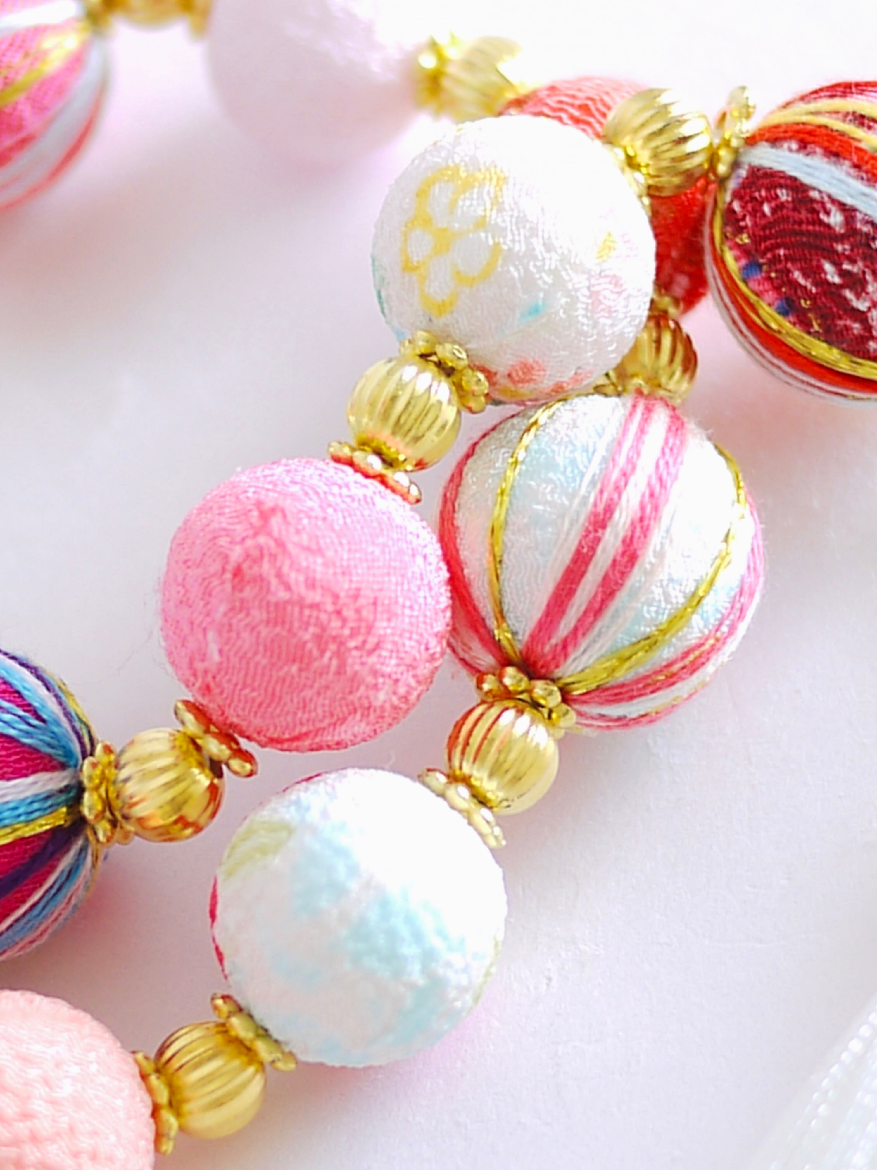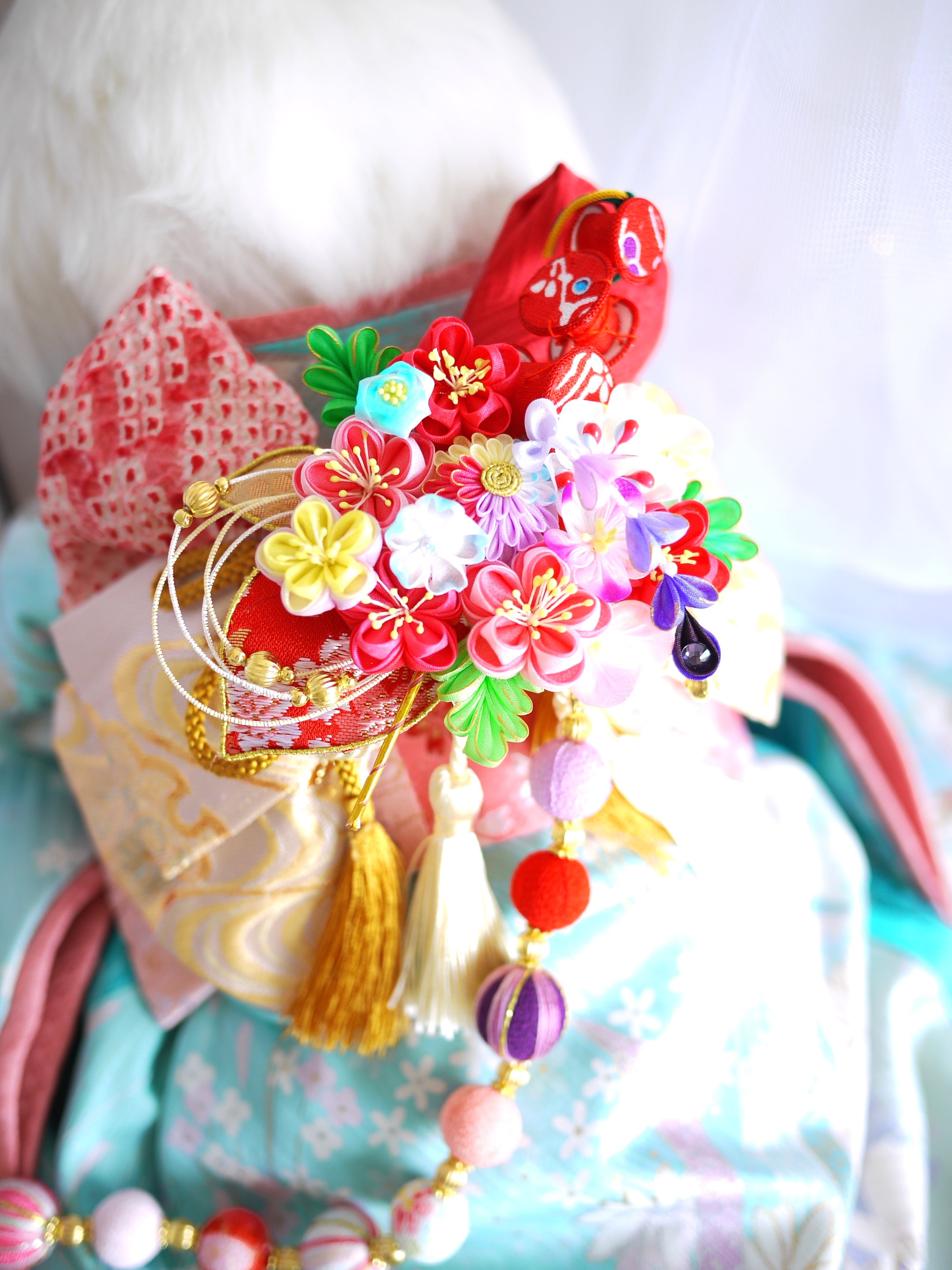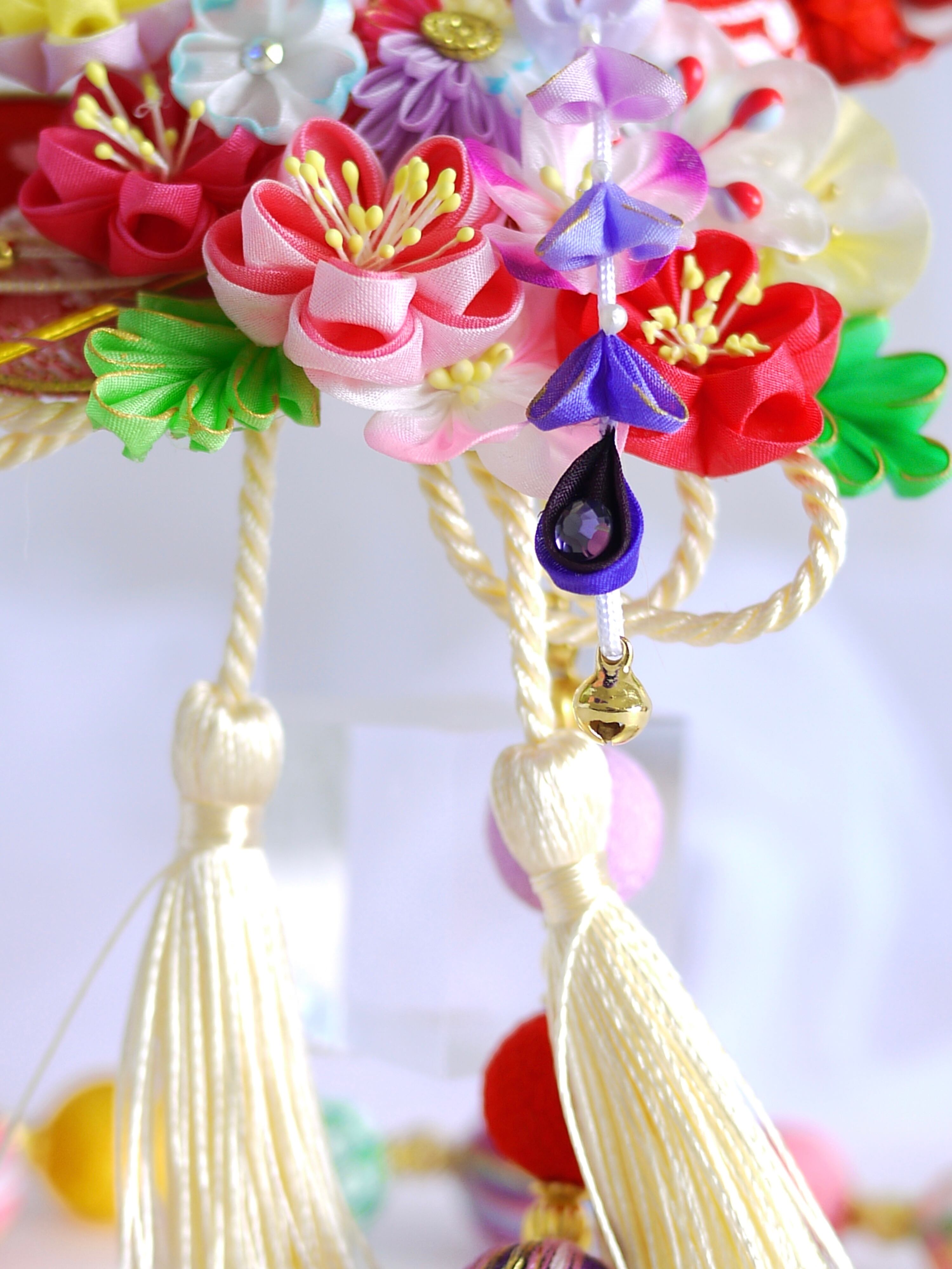 つまみ細工は専用の糊のみで制作しております、水に濡れると糊が溶けて型崩れしたり、正絹地が変形・変色する原因になることがございます。 雨や水濡れ・湿気には十分お気をつけください。 濃色のものは特に色移りする場合がございます