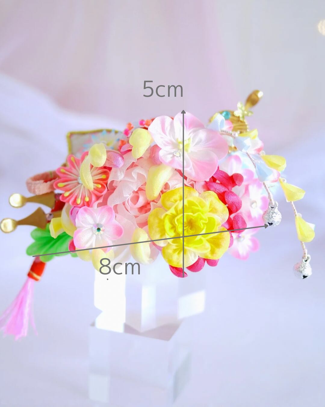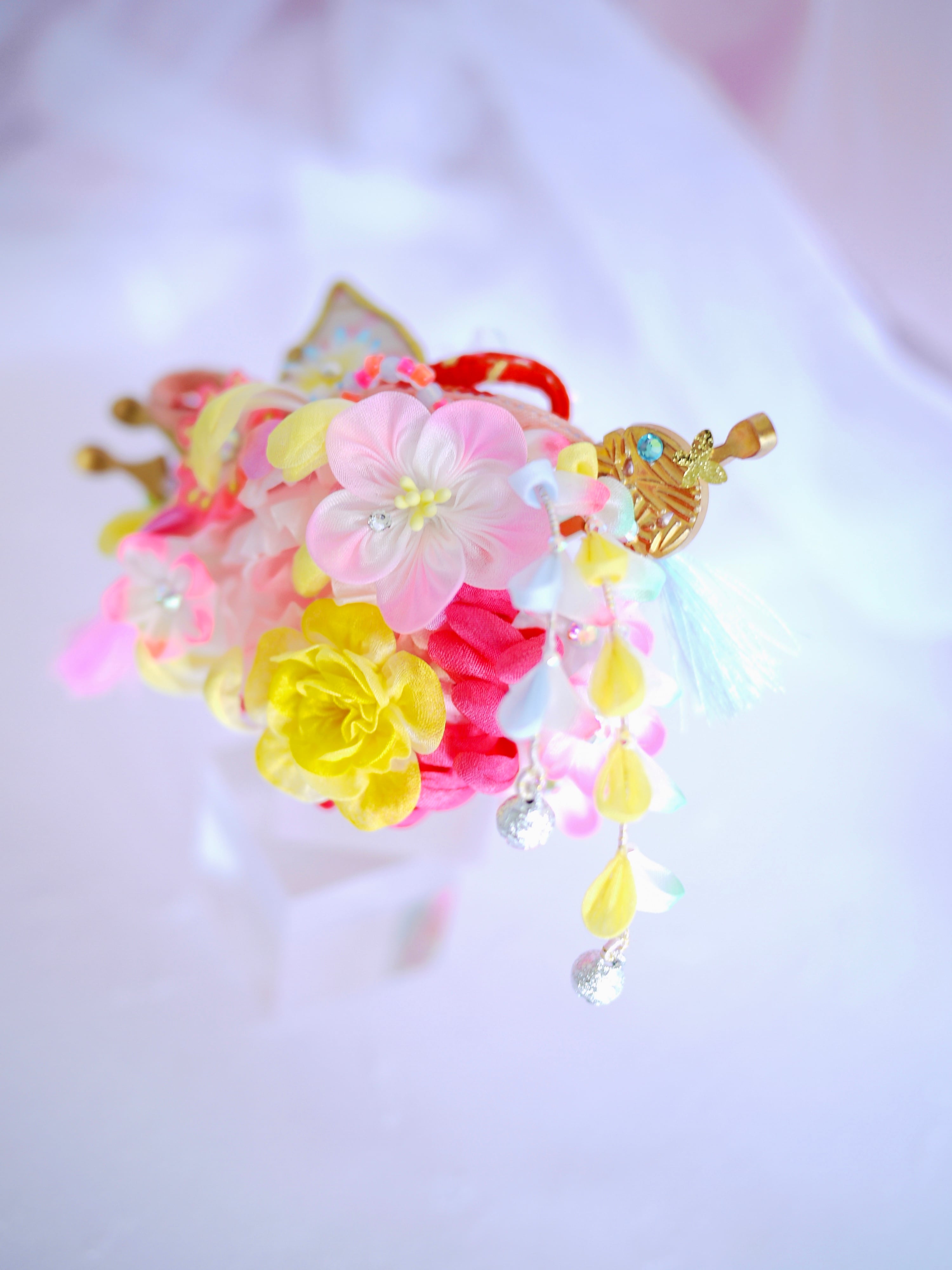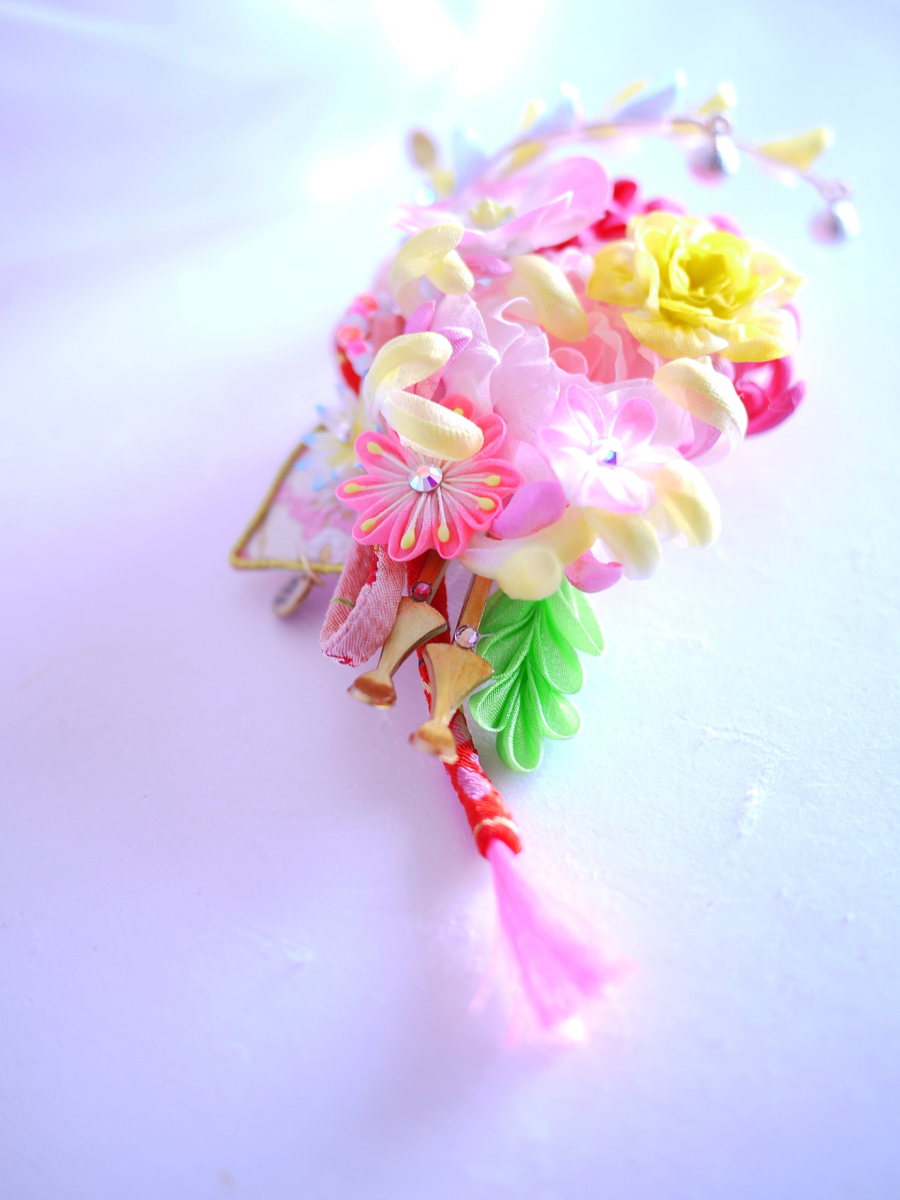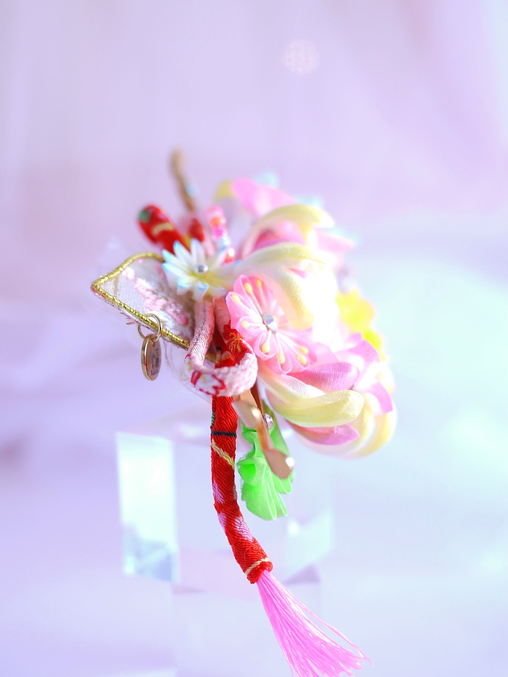 つまみ細工は専用の糊のみで制作しております、水に濡れると糊が溶けて型崩れしたり、正絹地が変形・変色する原因になることがございます。 雨や水濡れ・湿気には十分お気をつけください。 濃色のものは特に色移りする場合がございます