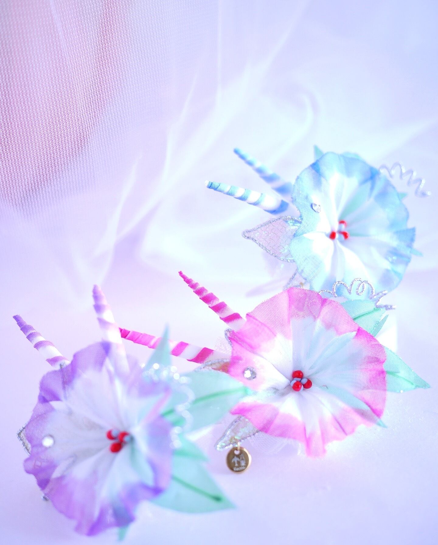 朝露に濡れて凛と咲く朝顔をそのまま髪飾りにしたような、透明感のある一重仕立てのお飾りです
