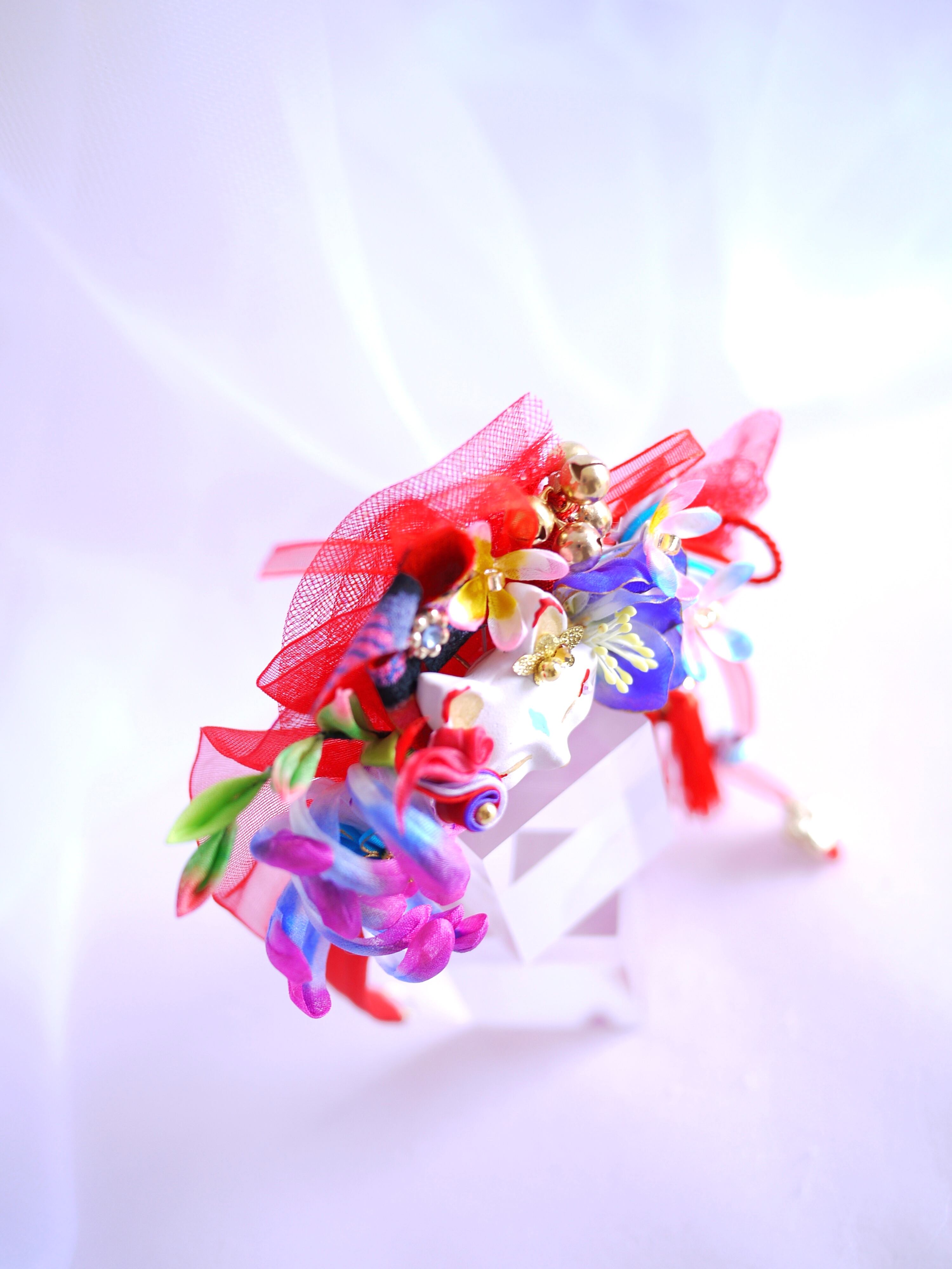 バレッタタイプはスワロの花火モチーフをポイント使いしましたが、こちらはタイニーサイズということで軽さ重視のつまみ細工で豪奢な華やかさを出したデザイン