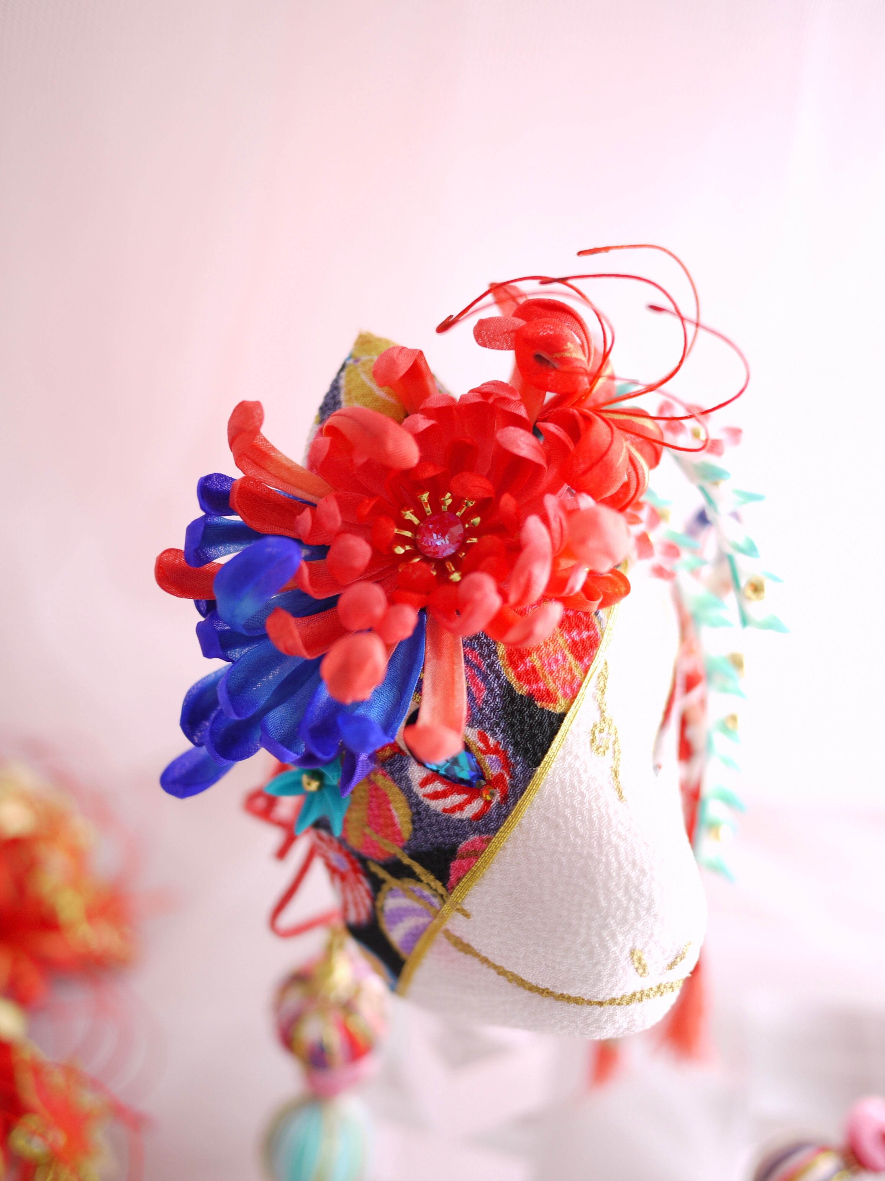 曼珠沙華のかんざしはもちろん、狐面の髪飾りをお持ちのお客様はセット使いもおすすめです