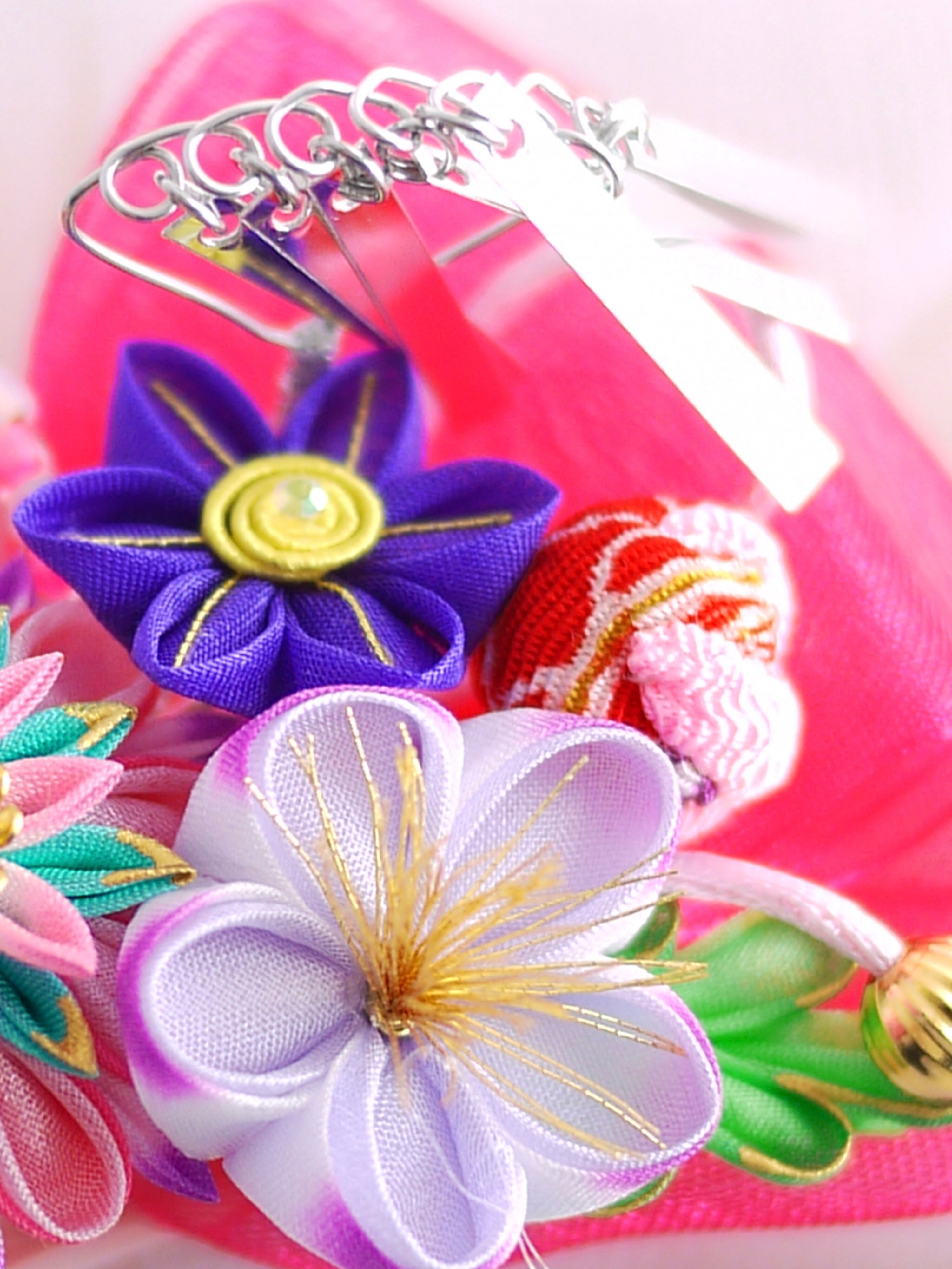 つまみ細工は専用の糊のみで制作しております、水に濡れると糊が溶けて型崩れしたり、正絹地が変形・変色する原因になることがございます。 雨や水濡れ・湿気には十分お気をつけください。 濃色のものは特に色移りする場合がございます