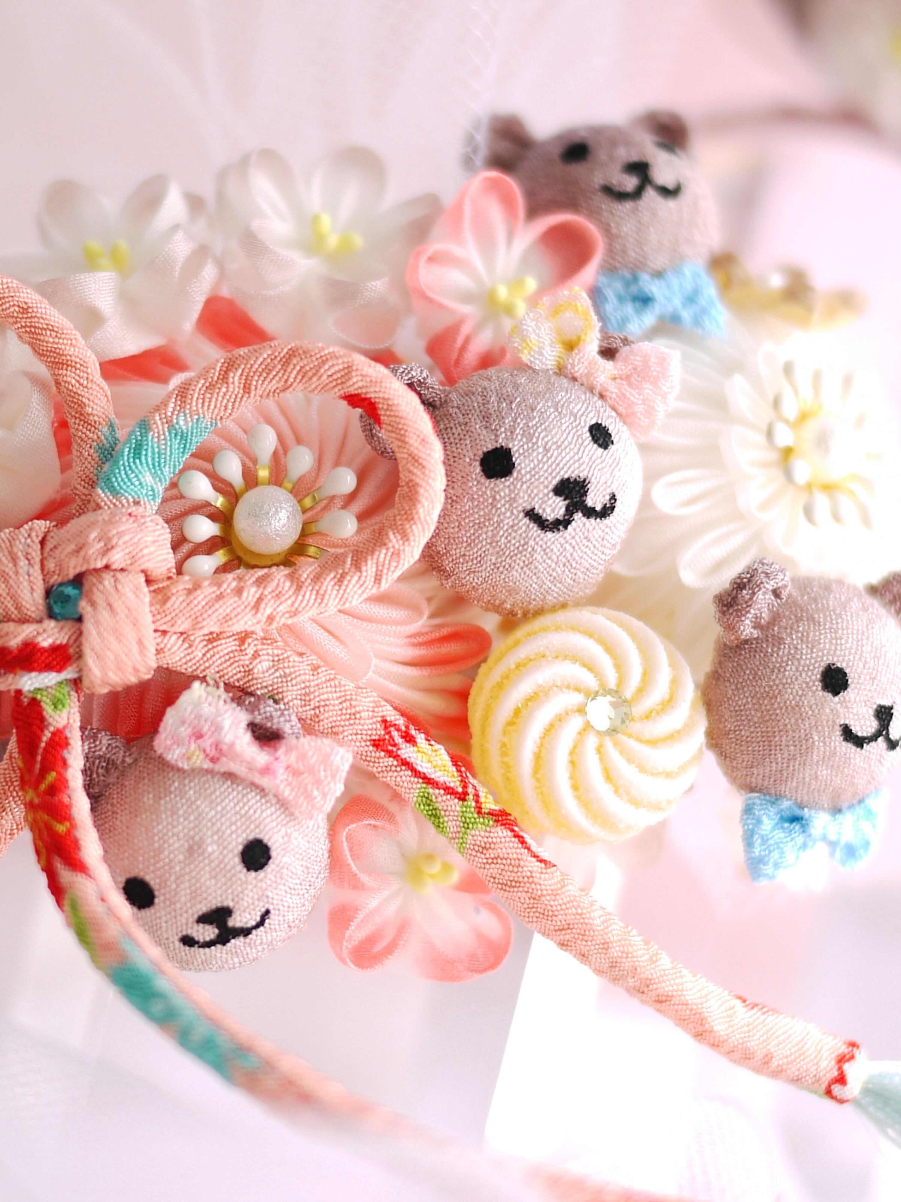 熊ちゃんベースは直径1cmくらいの発泡スチロール球ですので樹脂粘土パーツや大玉ビーズほどは重くないので小さいちゃんにも負担なく使っていただけます、帯飾りのチュールは横から見た時の隙間埋めにボリューム出してつけてますが、お好みでカットして調整いただいてもOK
