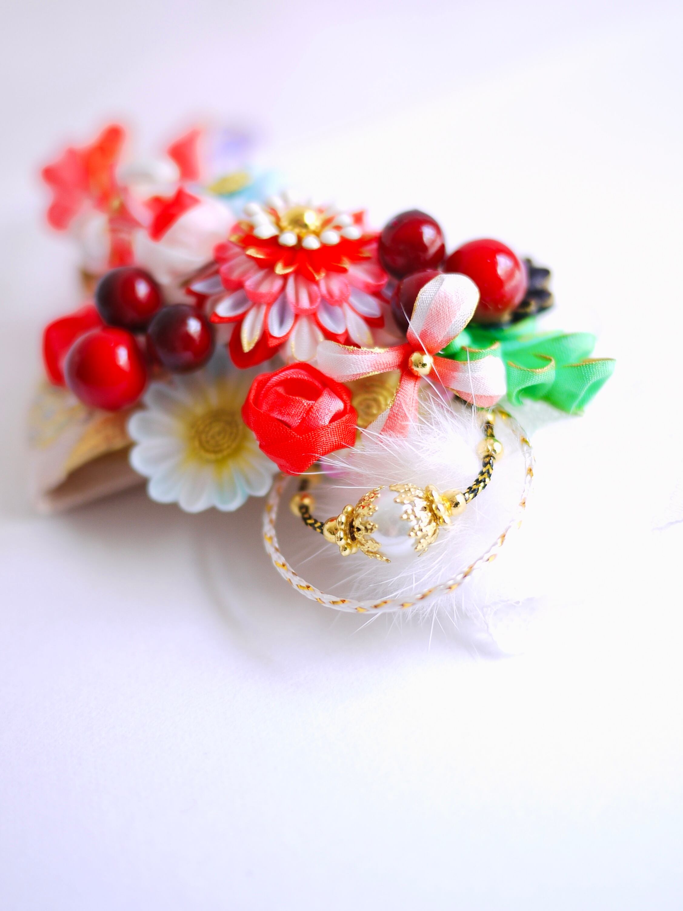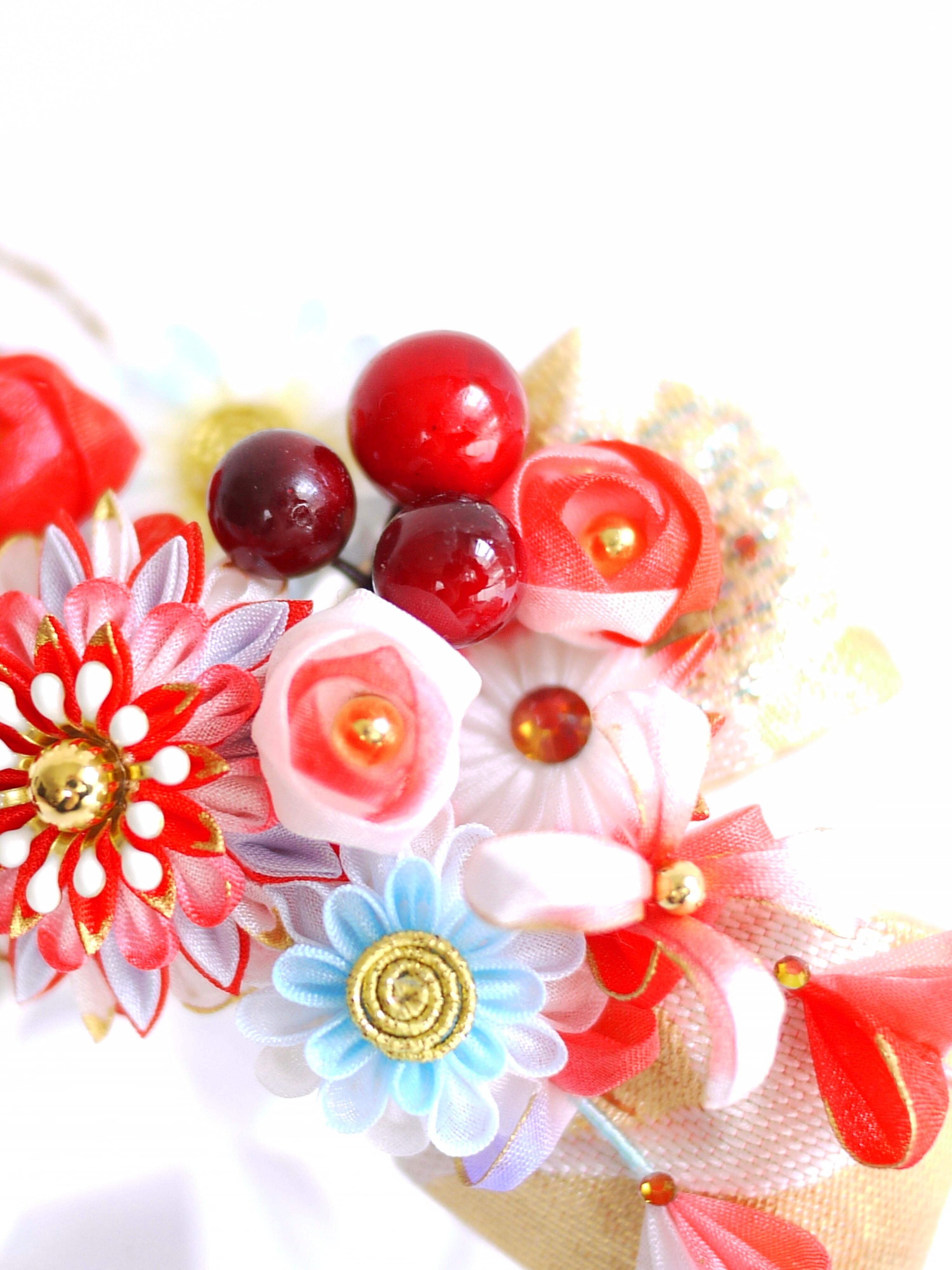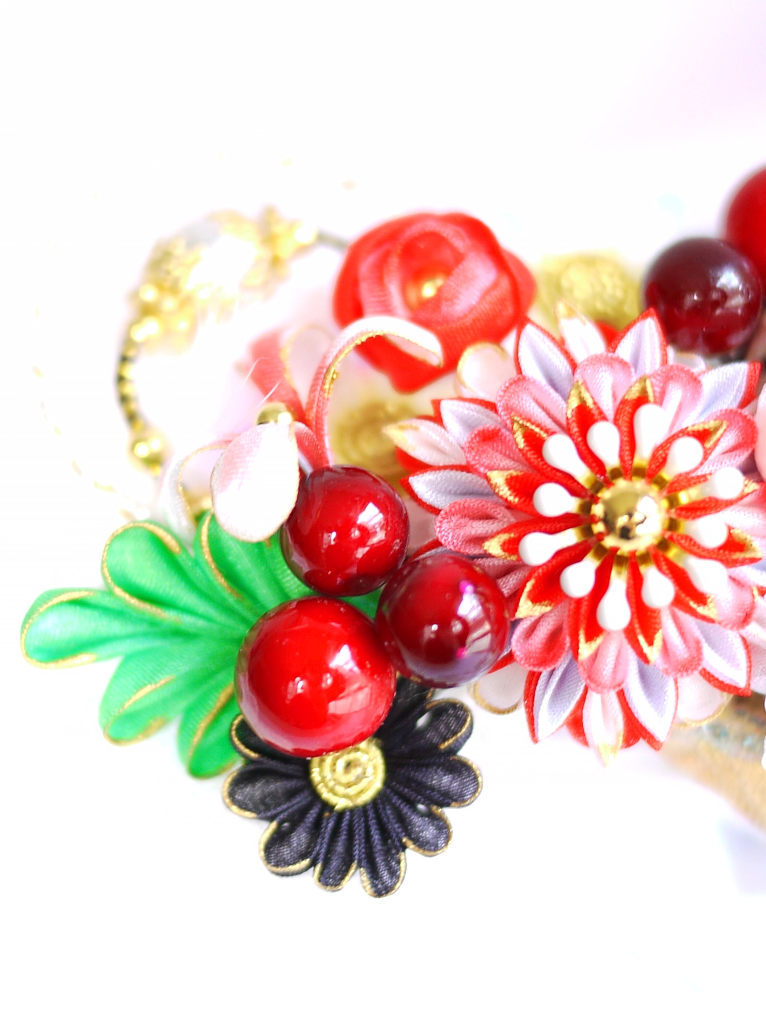 つまみ細工は専用の糊のみで制作しております、水に濡れると糊が溶けて型崩れしたり、正絹地が変形・変色する原因になることがございます。 雨や水濡れ・湿気には十分お気をつけください。 濃色のものは特に色移りする場合がございます