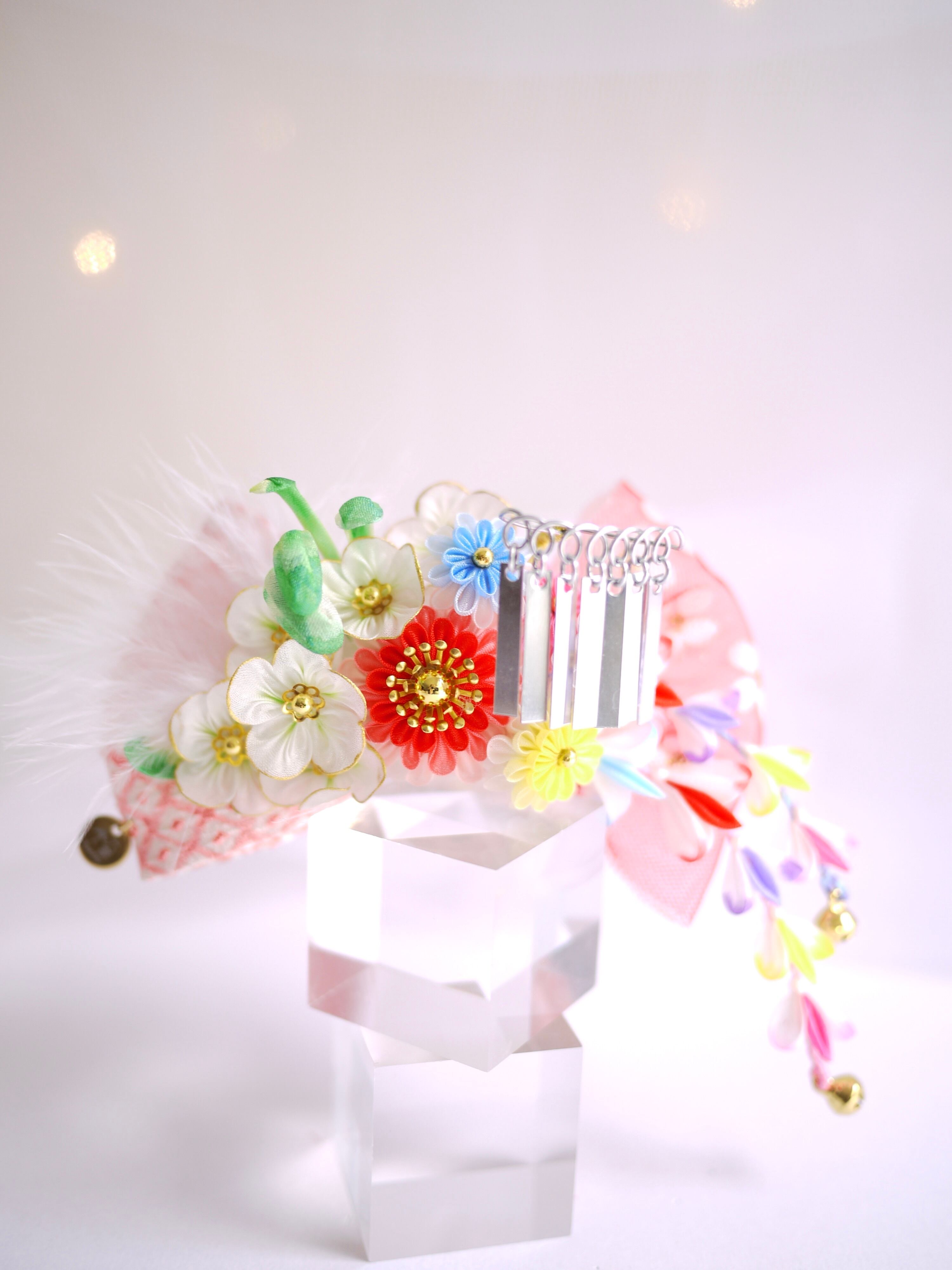 つまみ細工は専用の糊のみで制作しております、水に濡れると糊が溶けて型崩れしたり、正絹地が変形・変色する原因になることがございます。 雨や水濡れ・湿気には十分お気をつけください。 濃色のものは特に色移りする場合がございます