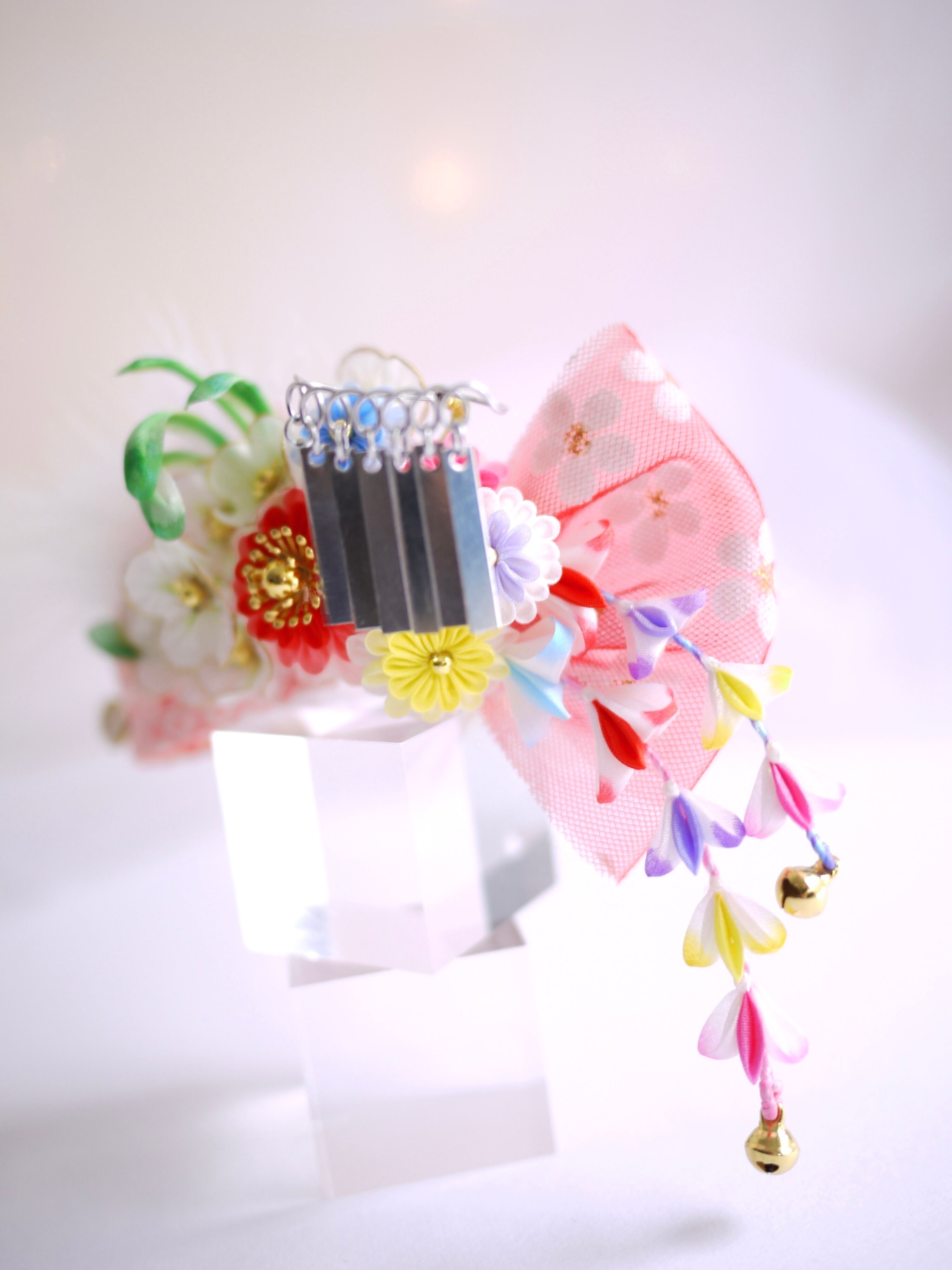 ベースリボンはふんわりピンク系の正絹かのこしぼり生地と重ねチュールのダブル使いで角度によって違う印象で楽しめますよ