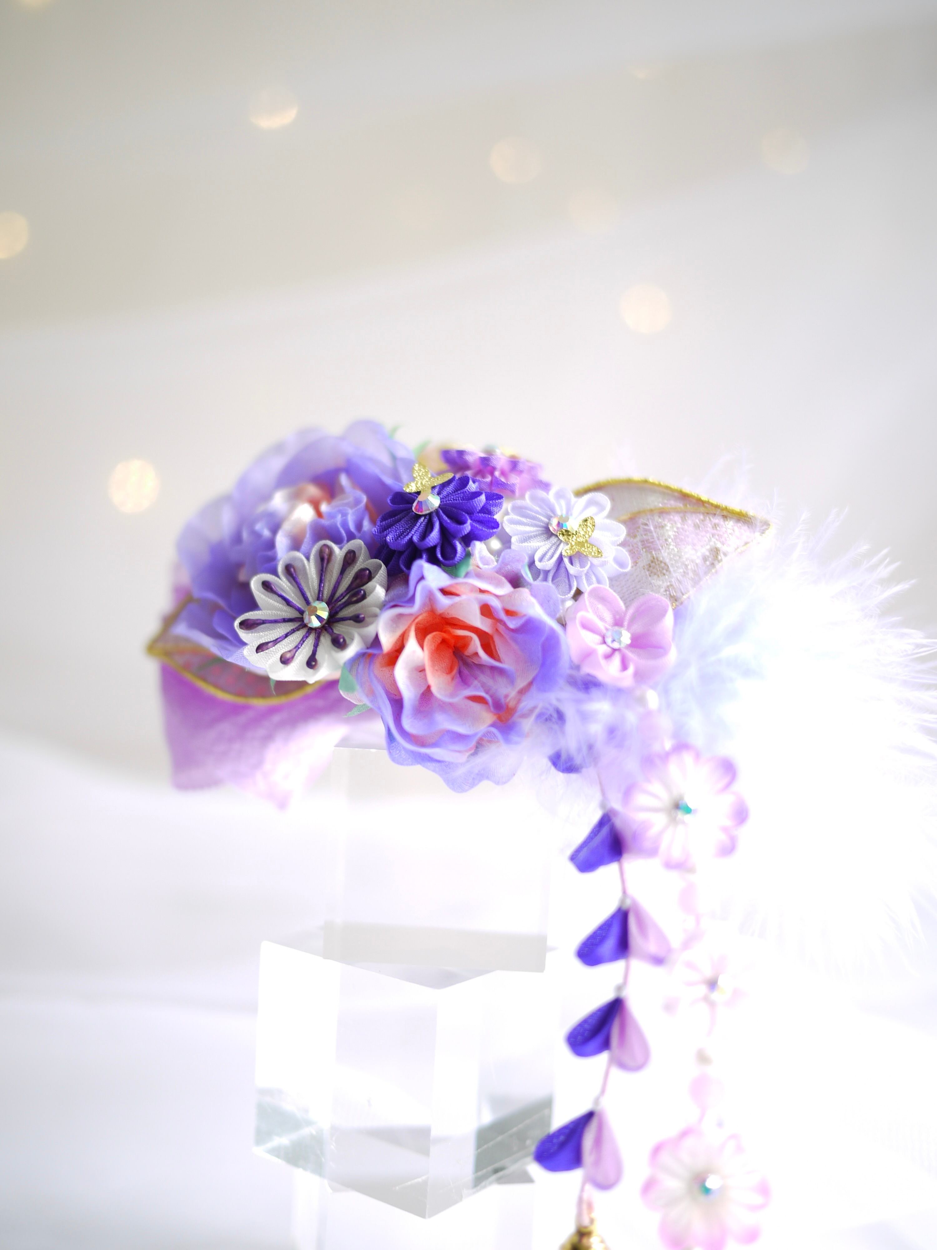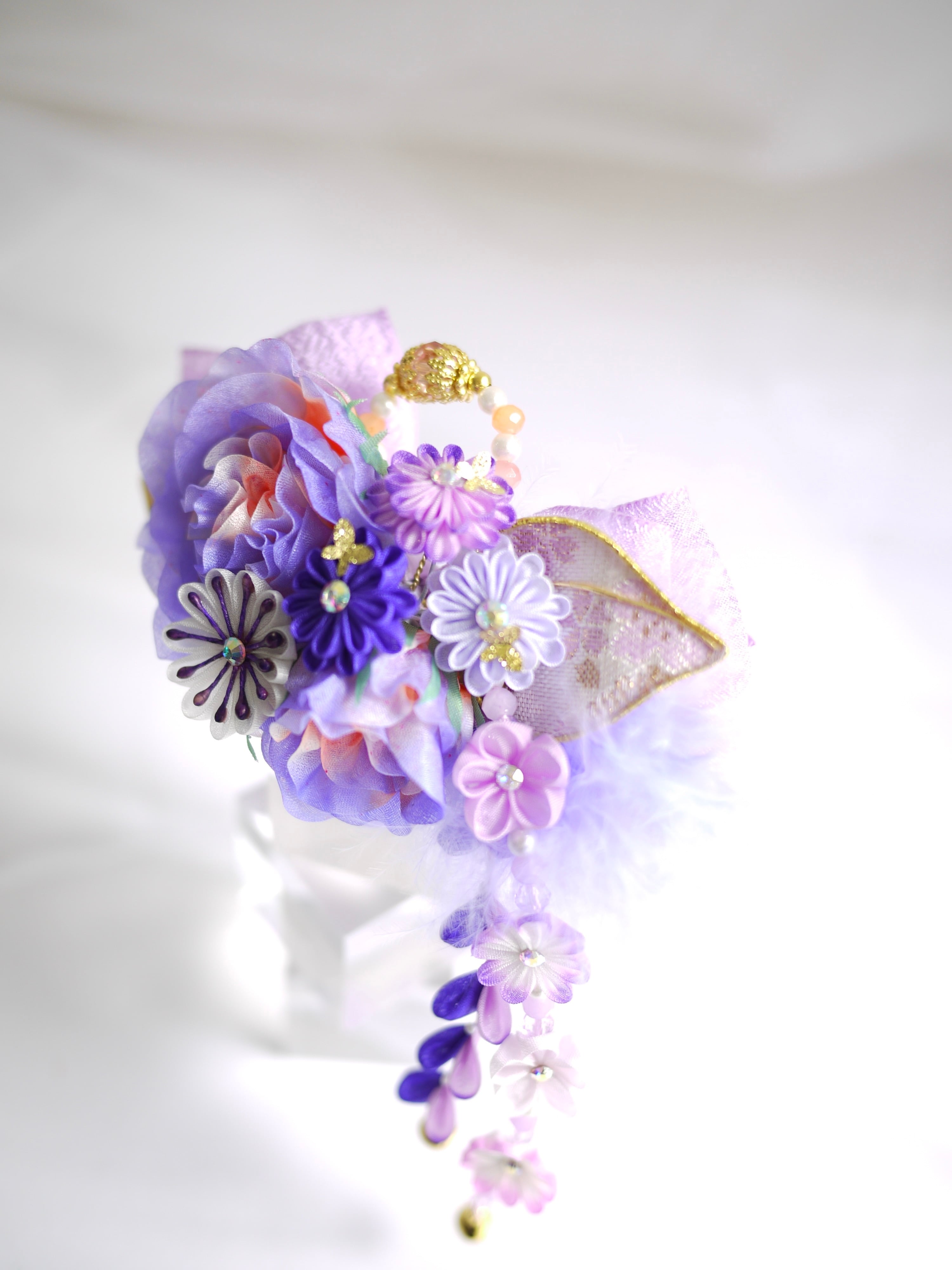 紫系のお飾りは落ち着いた雰囲気が地味に偏ってしまうことがありますが、キラキラカットグラスビーズをあしらった小花付き下がりやウォームカラーとの組み合わせで華やかで柔らかな趣きに