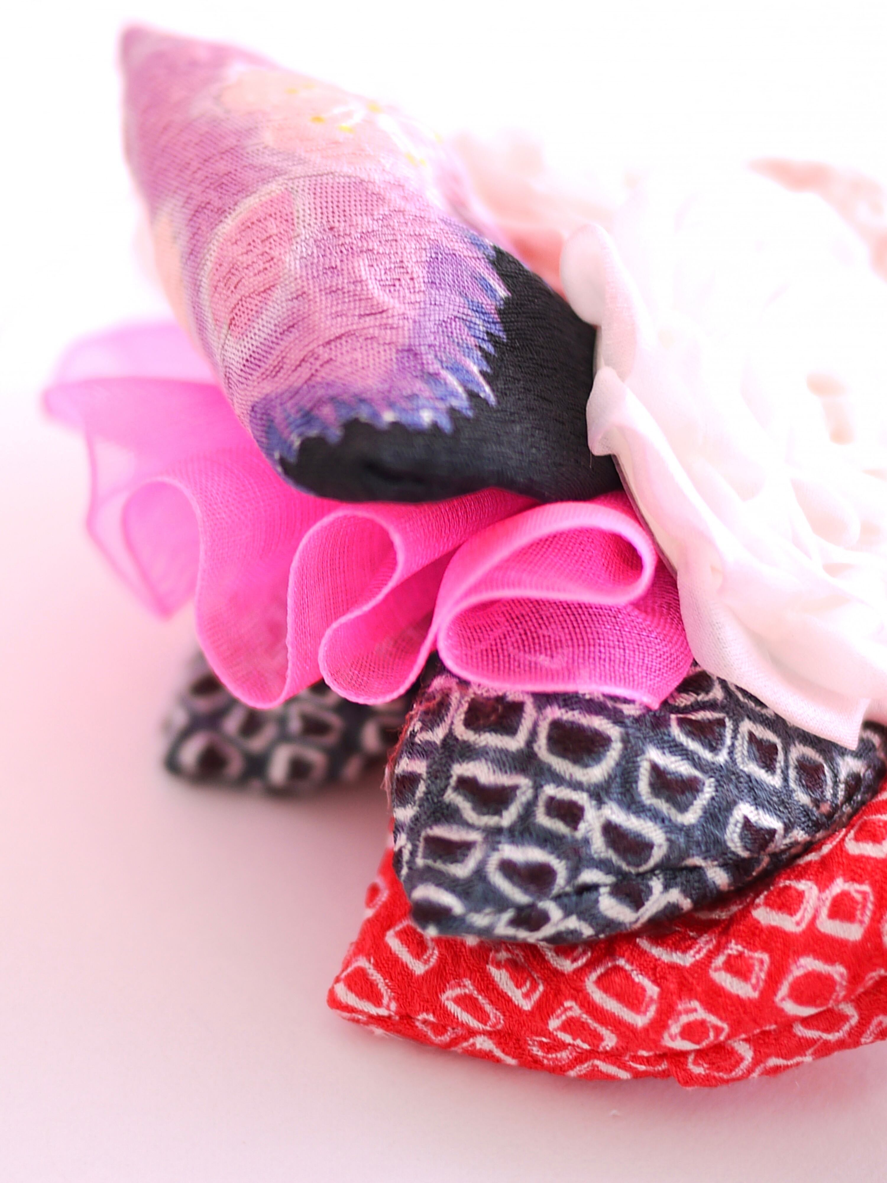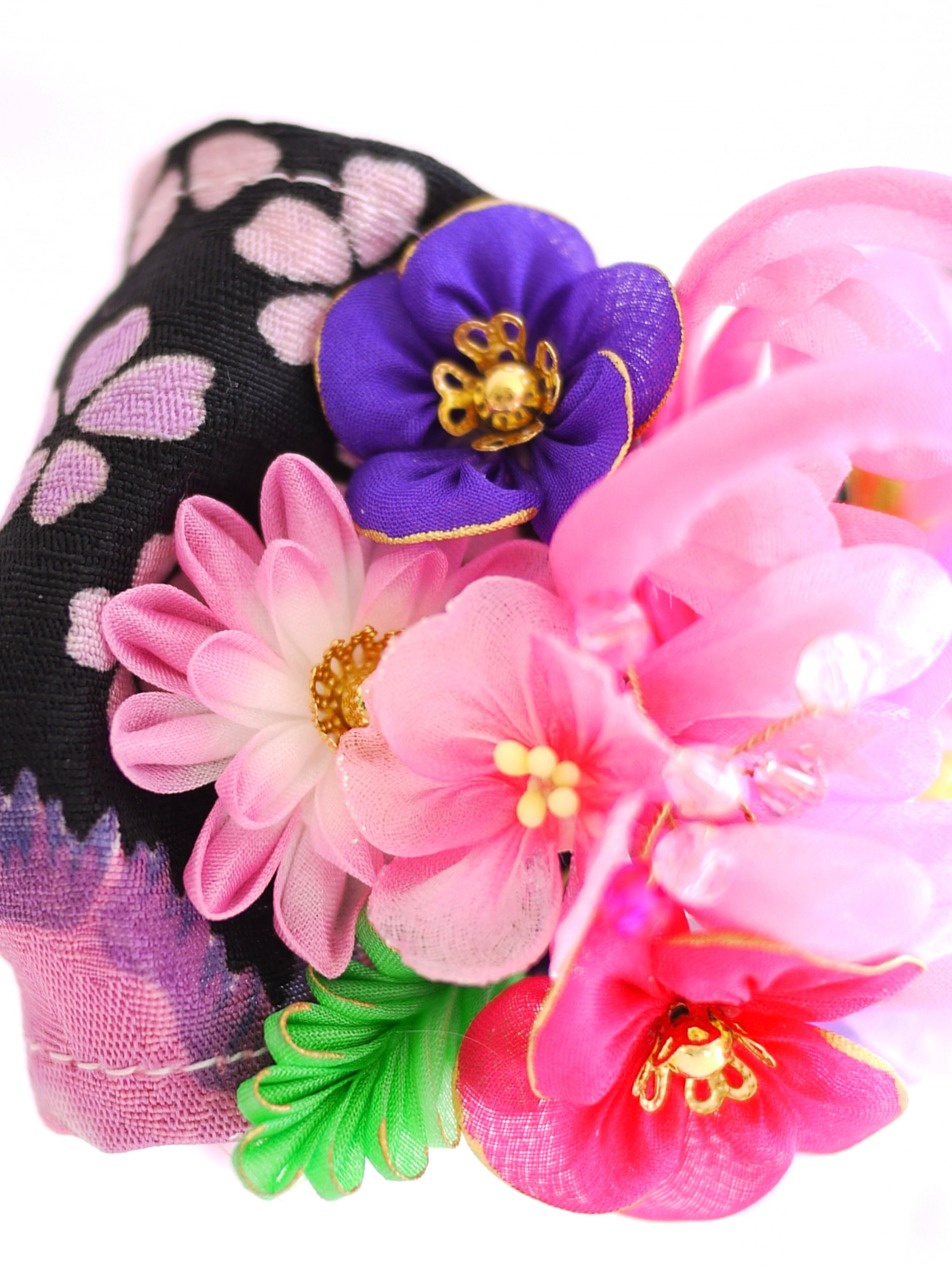 つまみ細工は専用の糊のみで制作しております、水に濡れると糊が溶けて型崩れしたり、正絹地が変形・変色する原因になることがございます。 雨や水濡れ・湿気には十分お気をつけください。 濃色のものは特に色移りする場合がございます