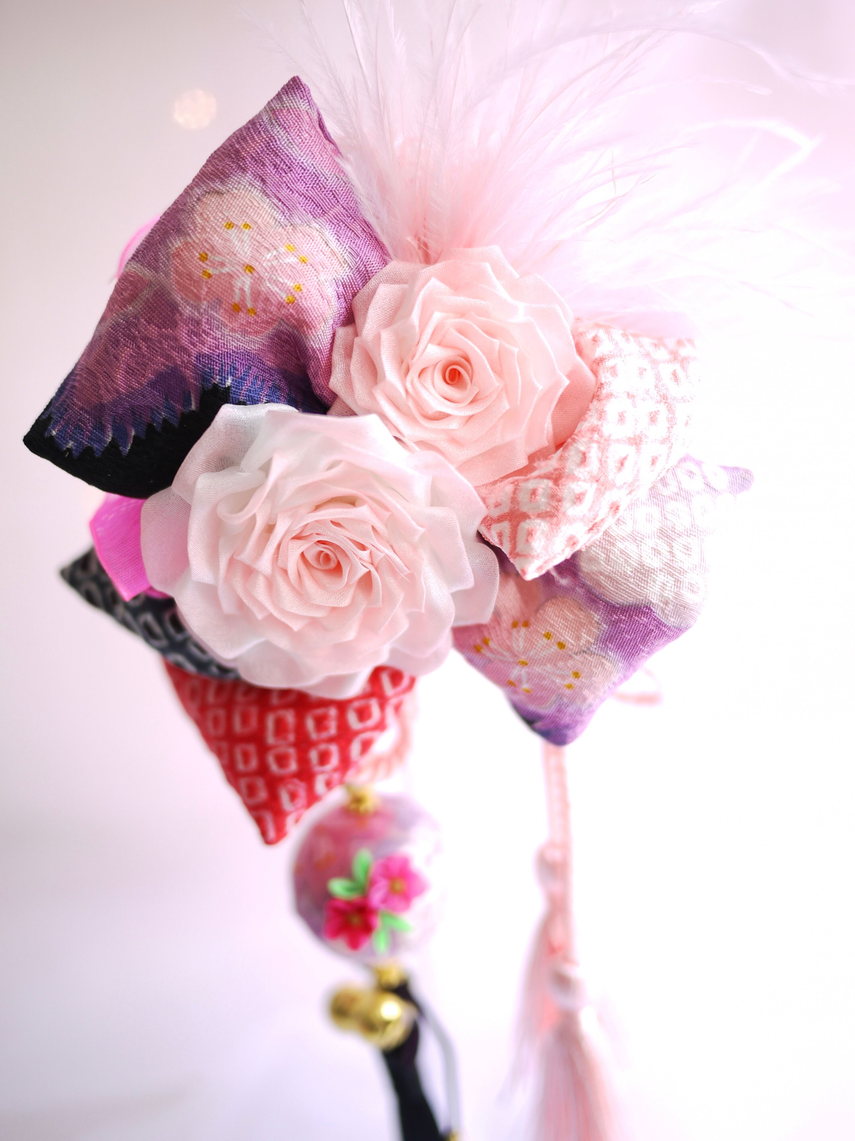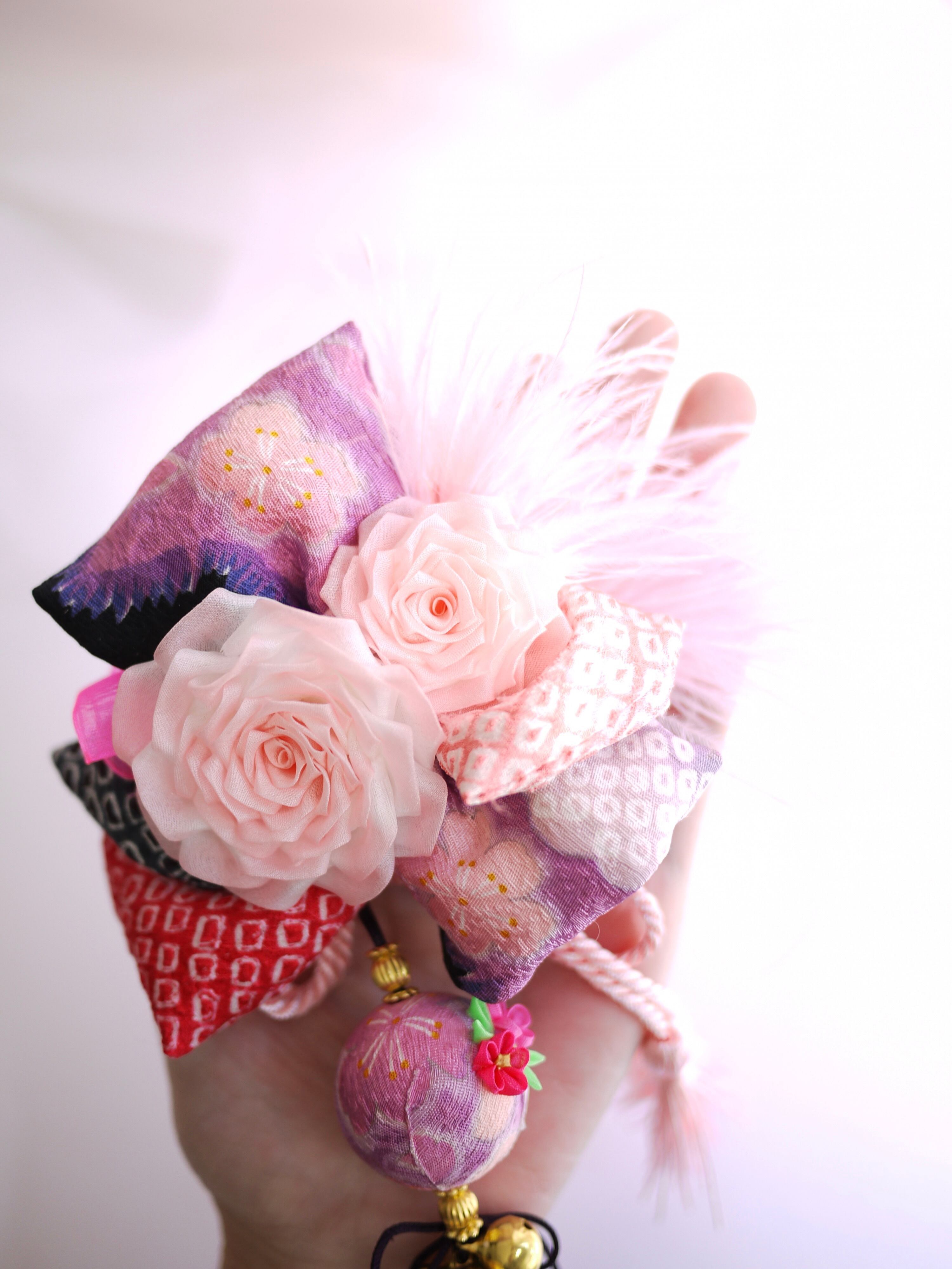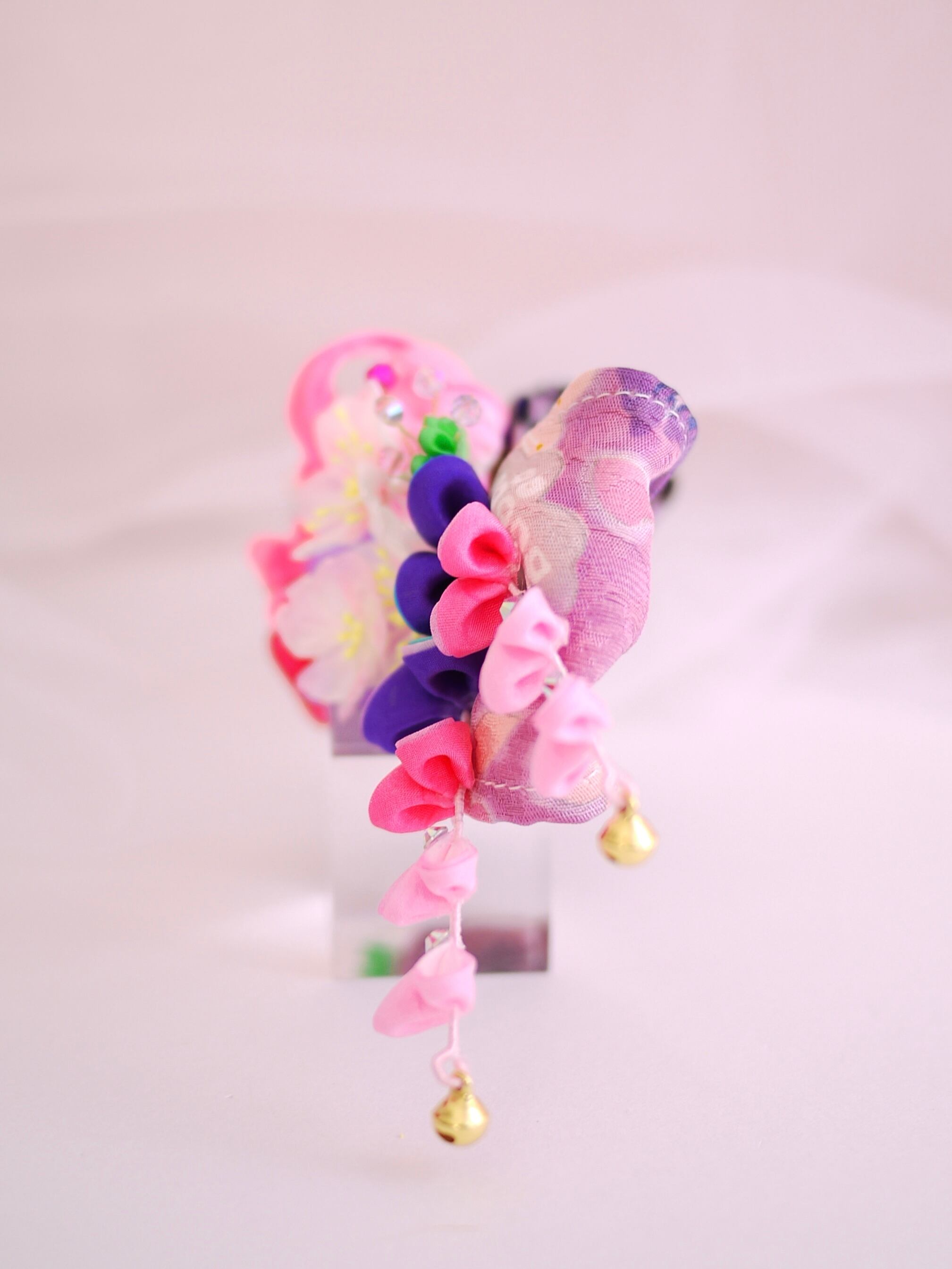 髪飾りのリボンは正絹着物生地、シルクの艶やか素材をワイヤー入りで空気感を持たせたボリュームタイプ、下がりもワイヤーショートタイプで撮影中もひっくり返る心配はありません