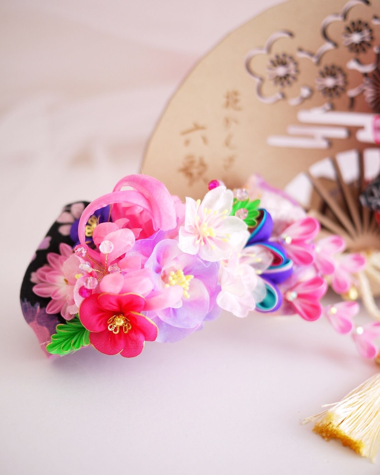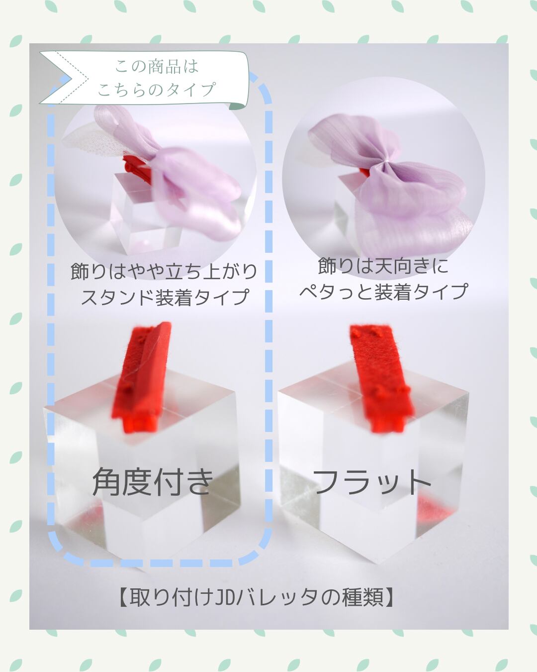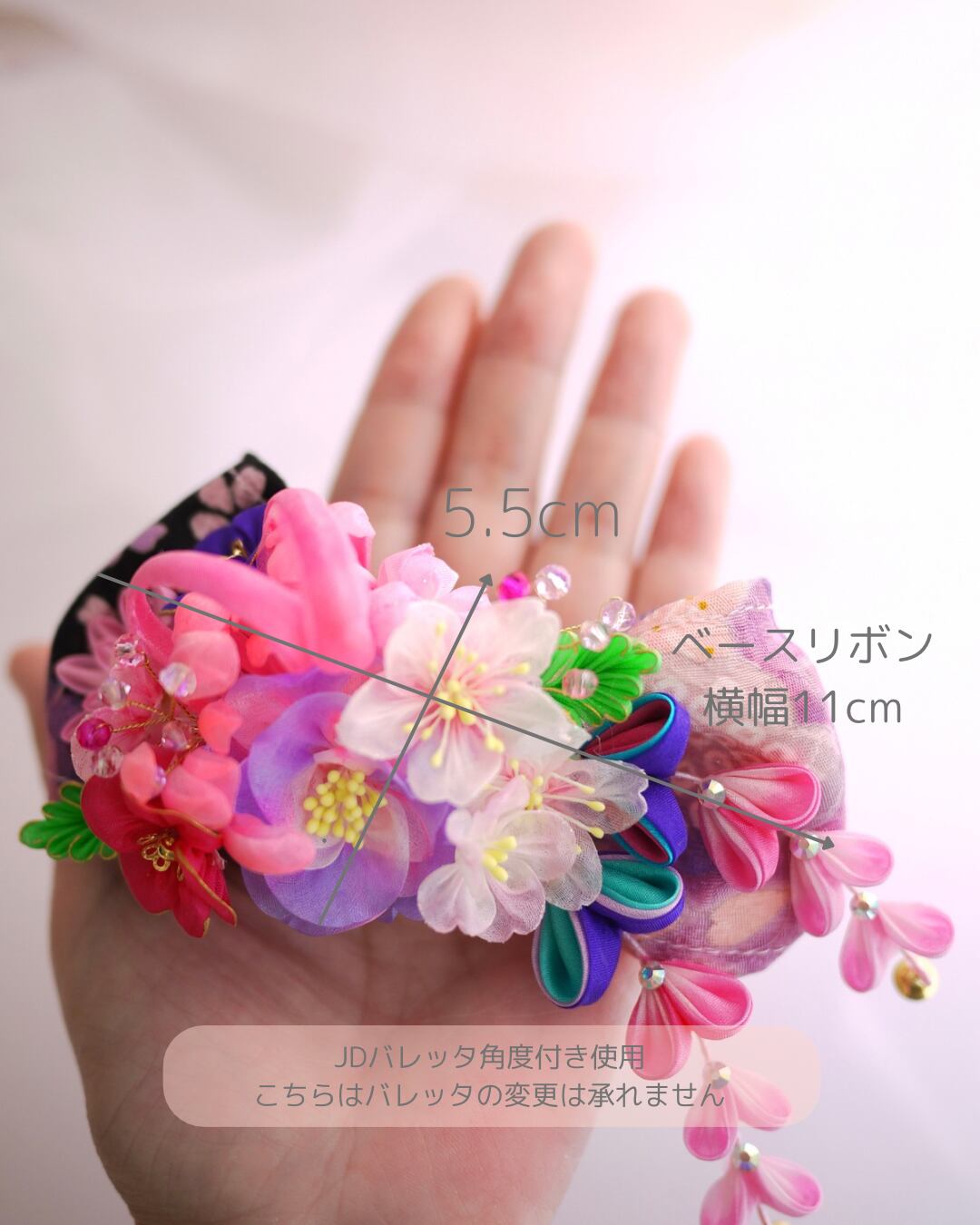 髪飾りのリボンは正絹着物生地、シルクの艶やか素材をワイヤー入りで空気感を持たせたボリュームタイプ、下がりもワイヤーショートタイプで撮影中もひっくり返る心配はありません
