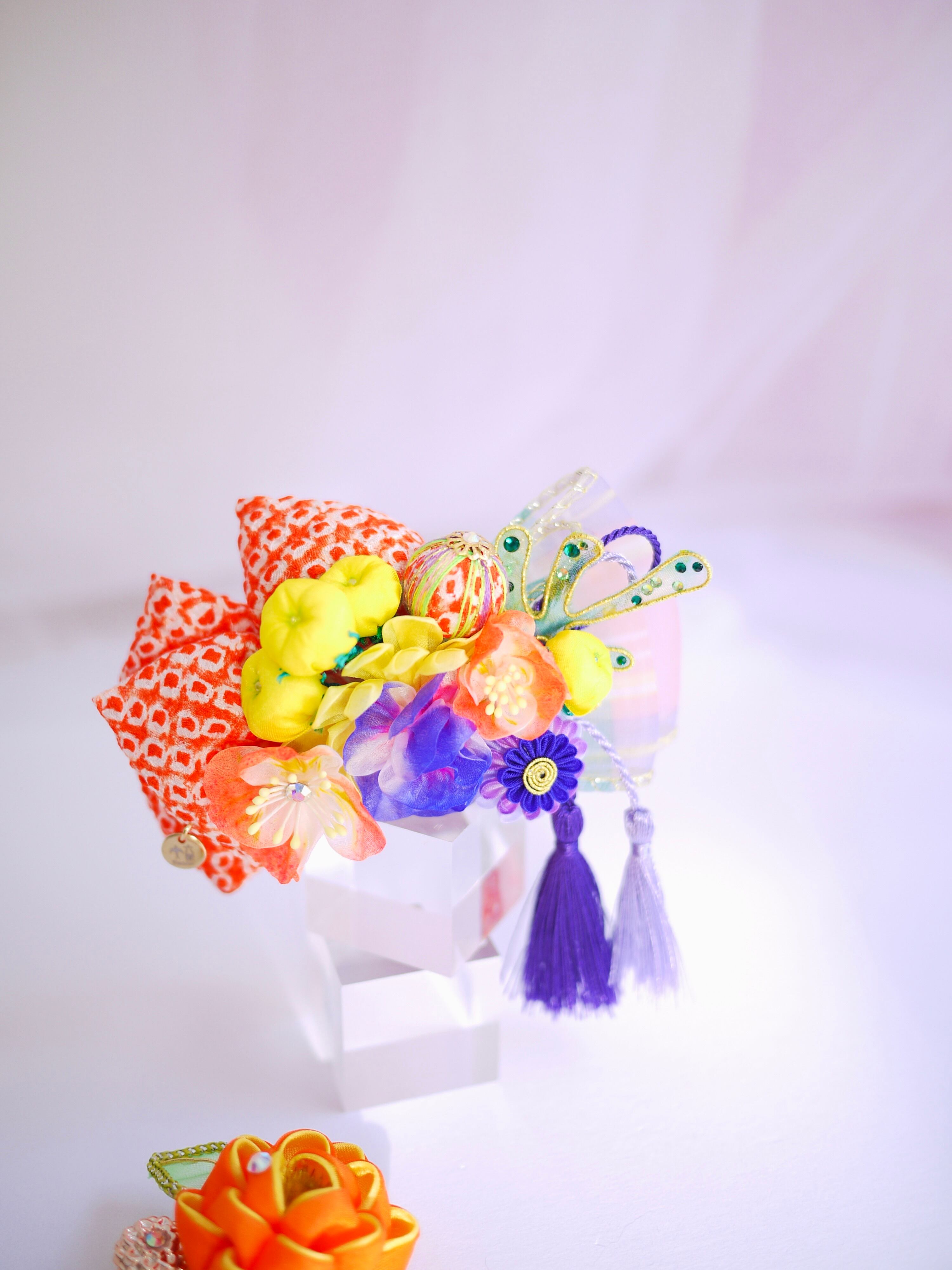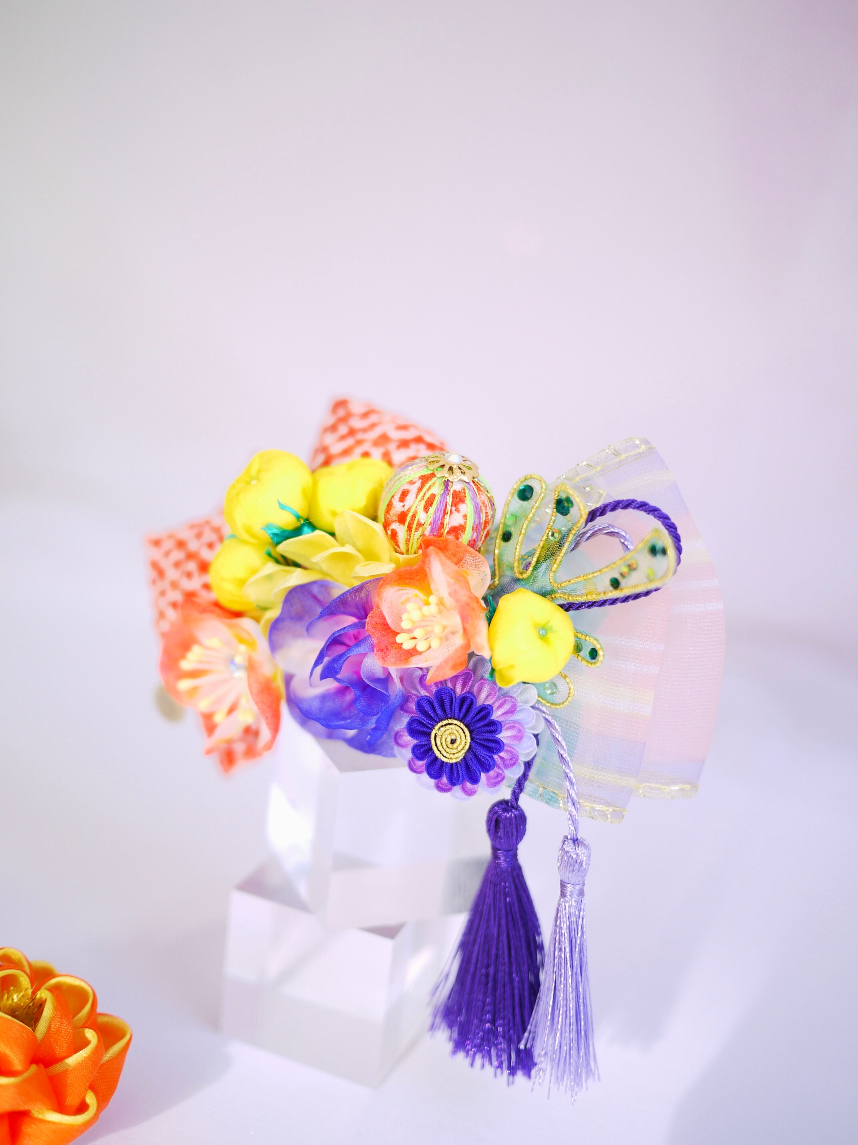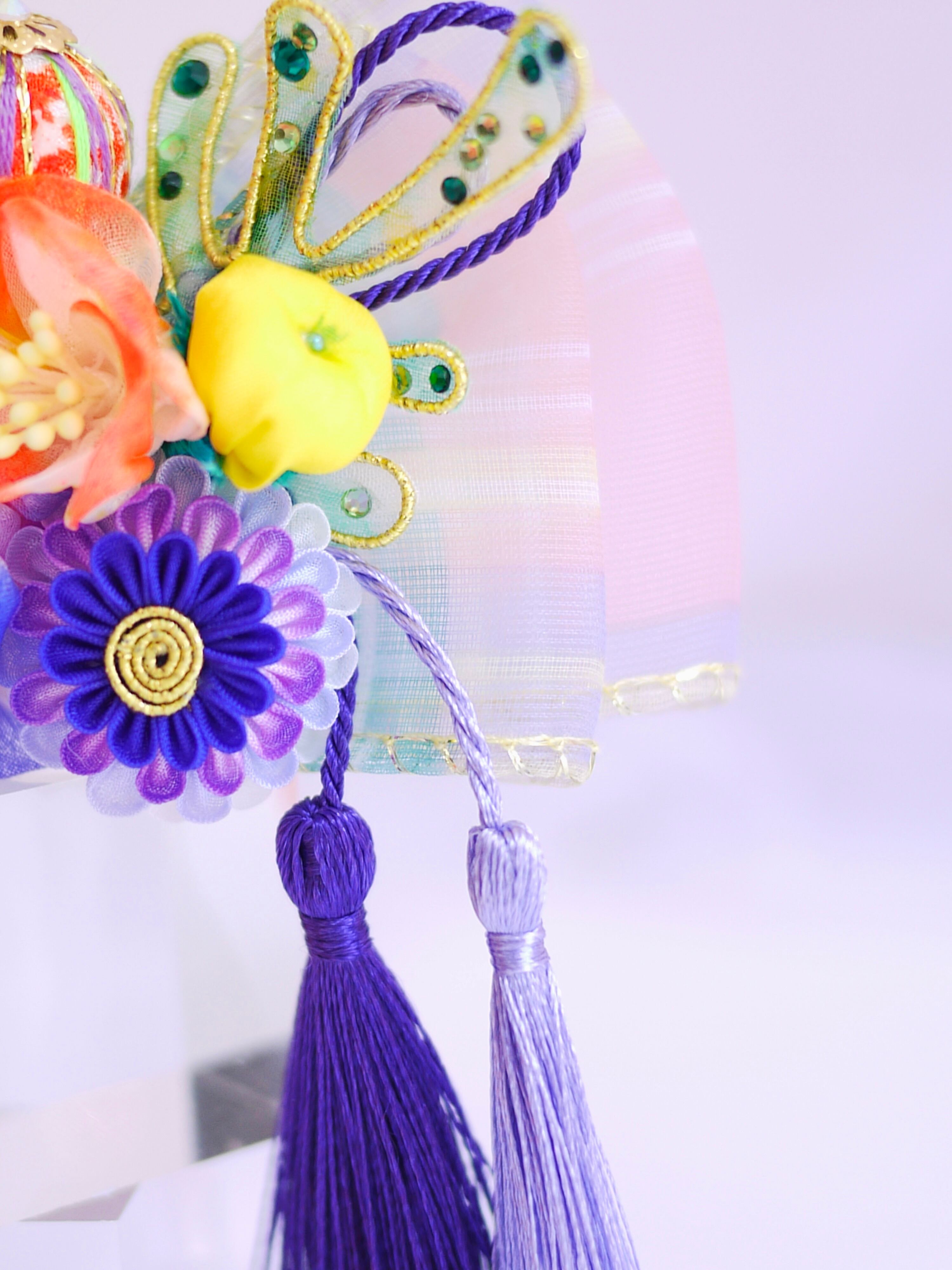 柑橘オレンジの鹿の子絞り生地とパープルの対比が鮮やかで、房飾り使いがちょっぴりお姉さん風の簪