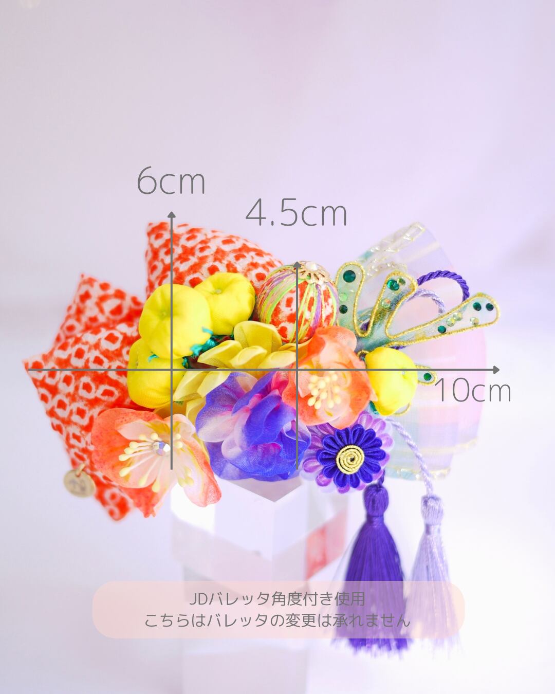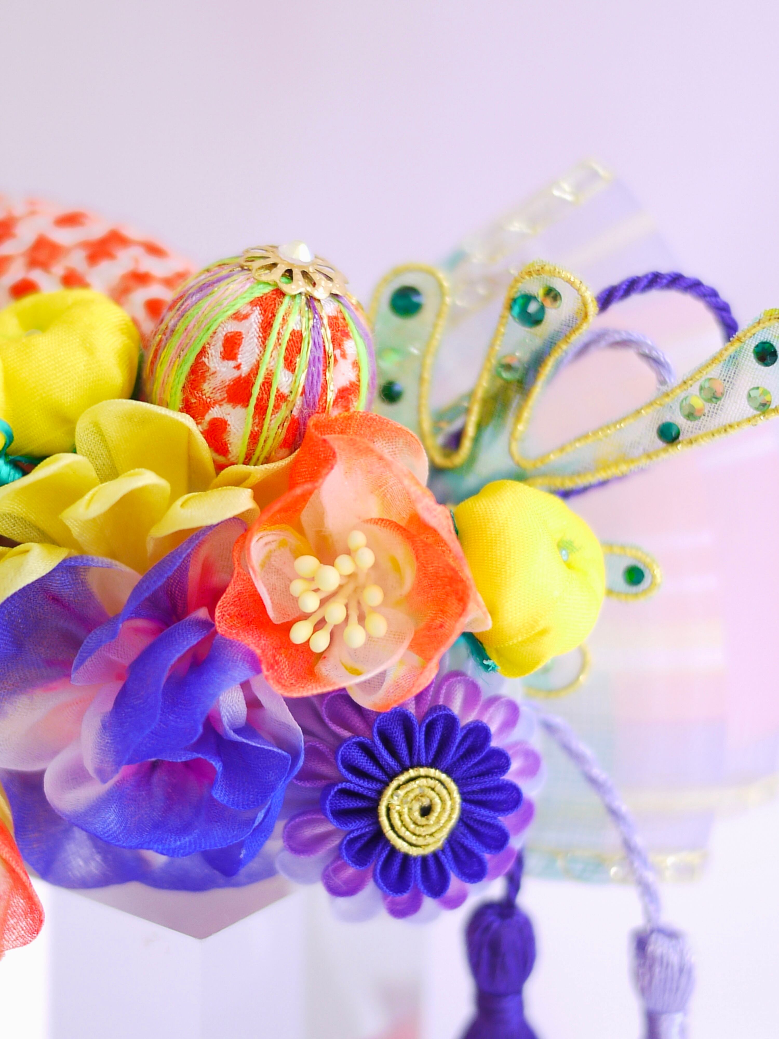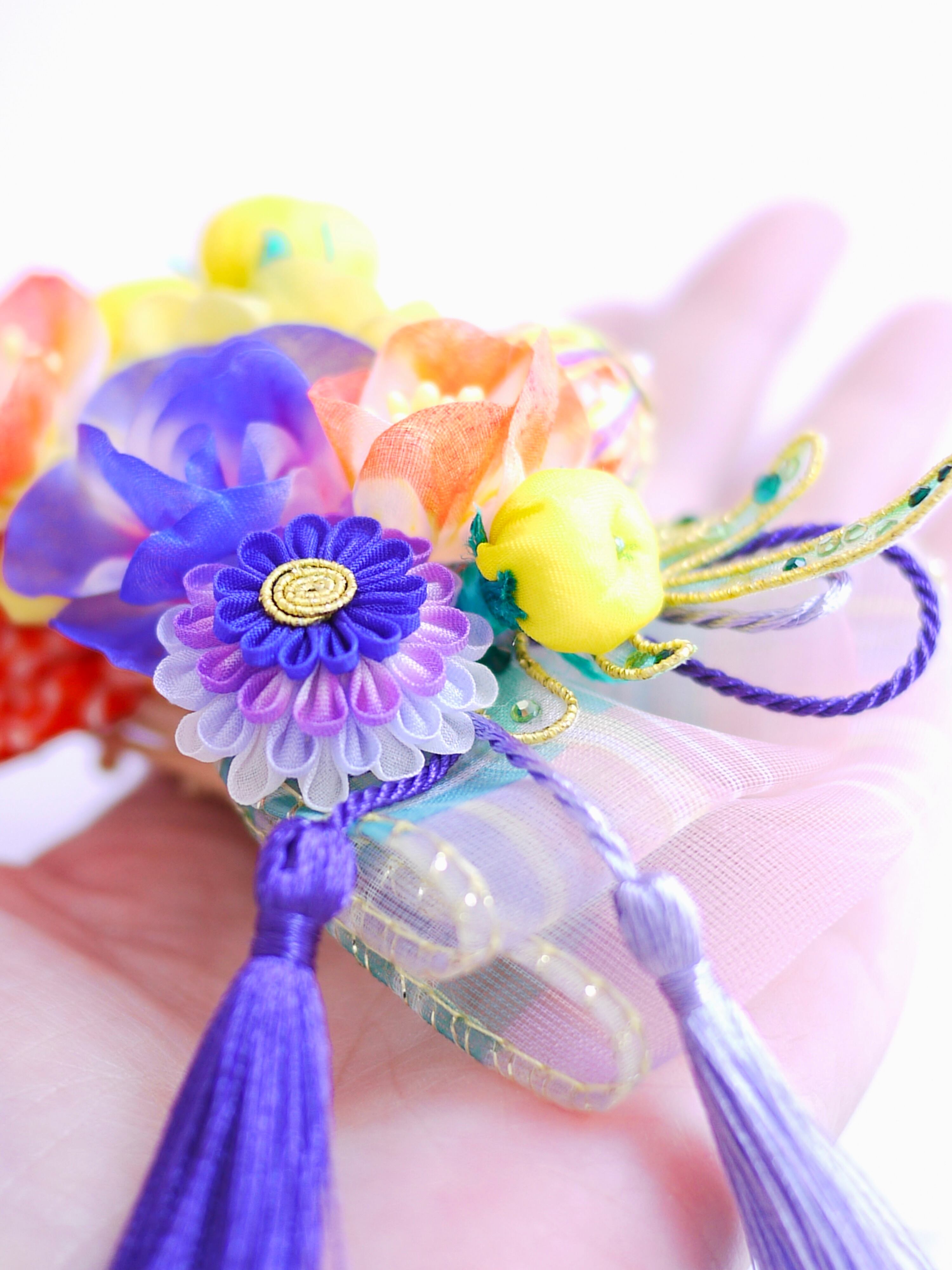 柑橘オレンジの鹿の子絞り生地とパープルの対比が鮮やかで、房飾り使いがちょっぴりお姉さん風の簪