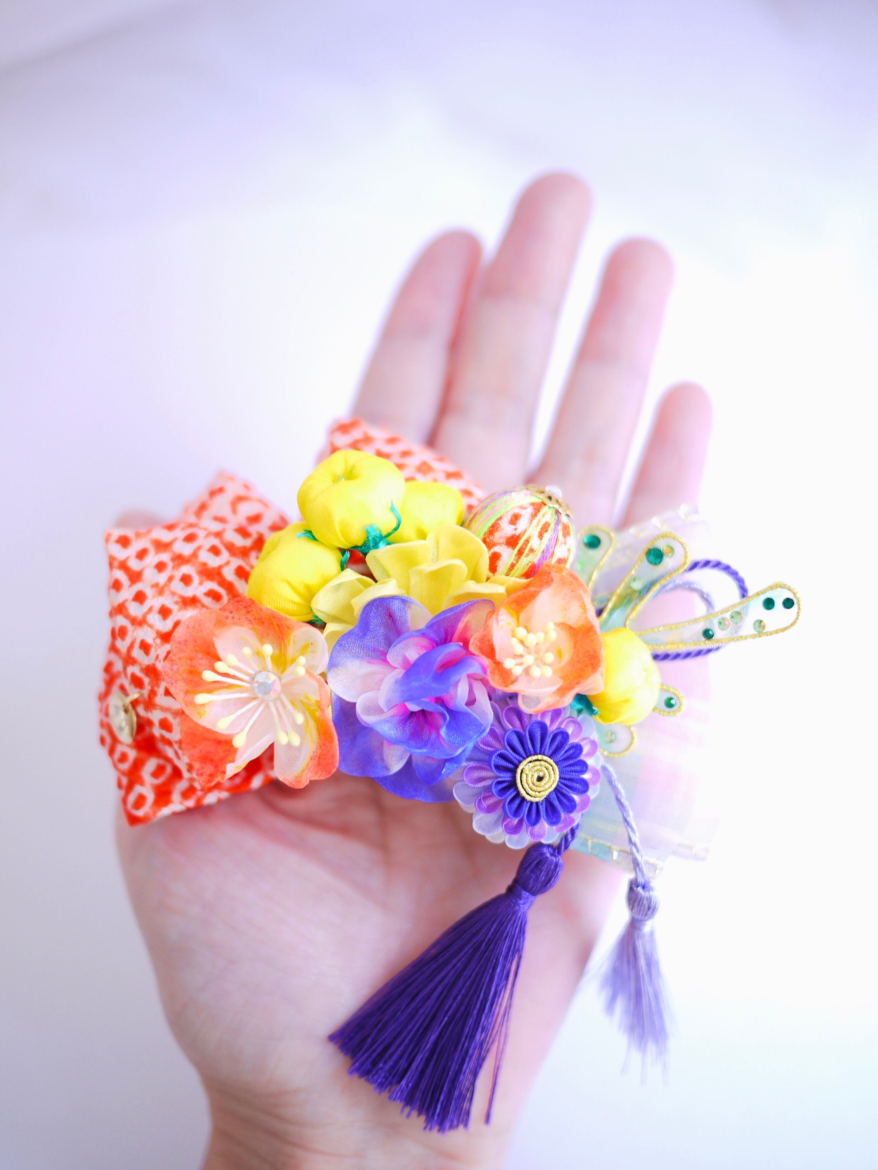 つまみ細工は専用の糊のみで制作しております、水に濡れると糊が溶けて型崩れしたり、正絹地が変形・変色する原因になることがございます。 雨や水濡れ・湿気には十分お気をつけください。 濃色のものは特に色移りする場合がございます