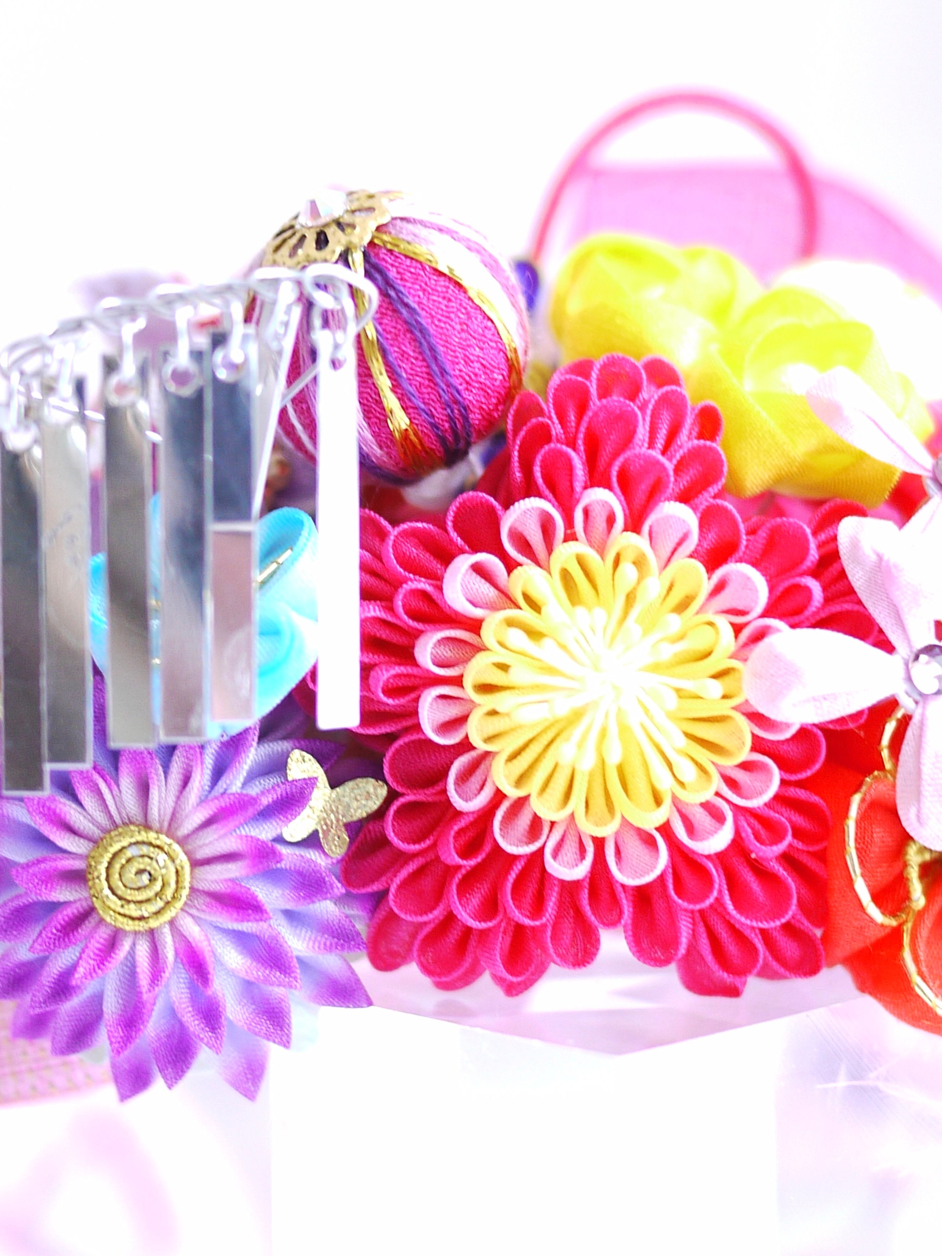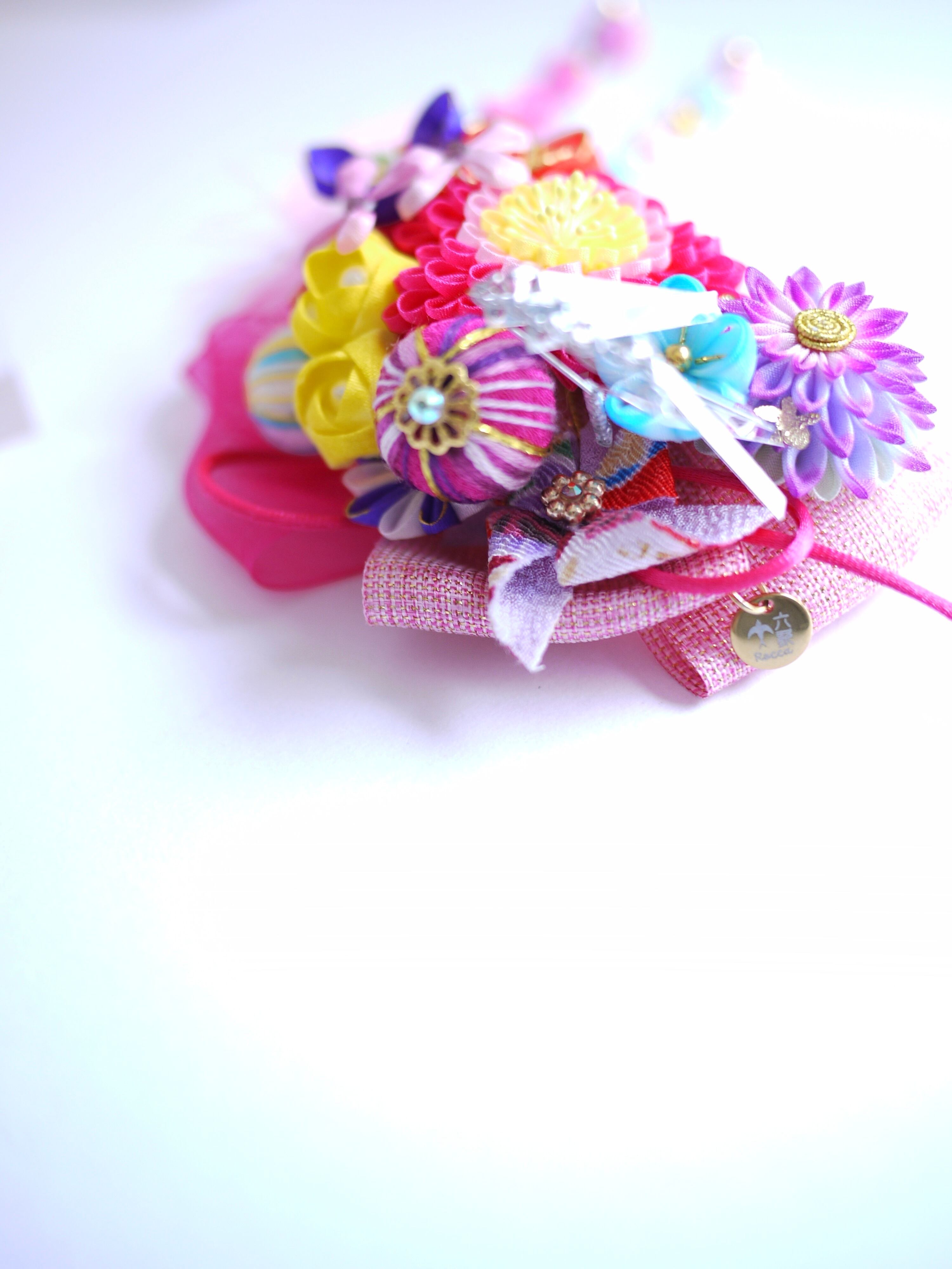 つまみ細工は専用の糊のみで制作しております、水に濡れると糊が溶けて型崩れしたり、正絹地が変形・変色する原因になることがございます。 雨や水濡れ・湿気には十分お気をつけください。 濃色のものは特に色移りする場合がございます