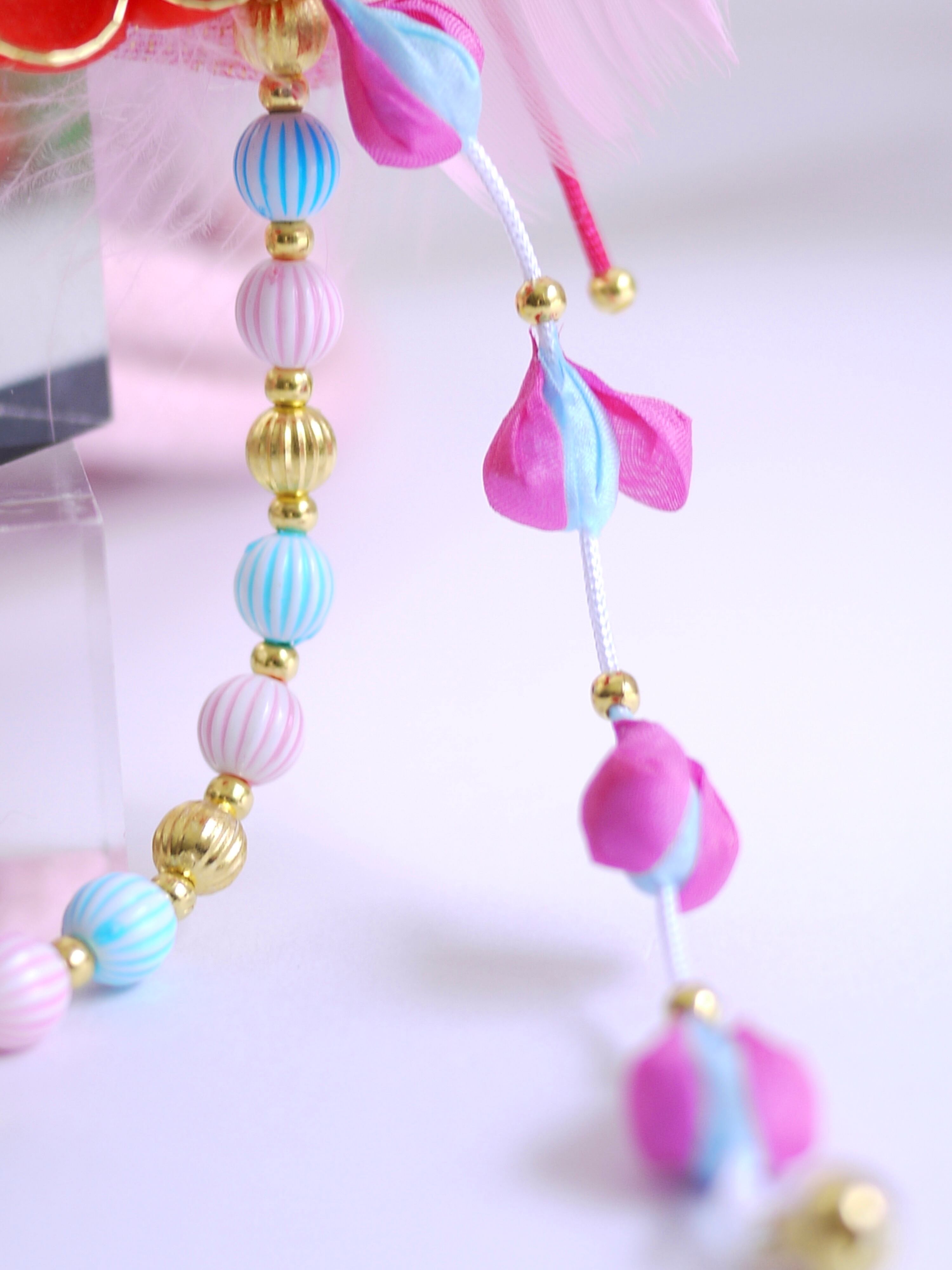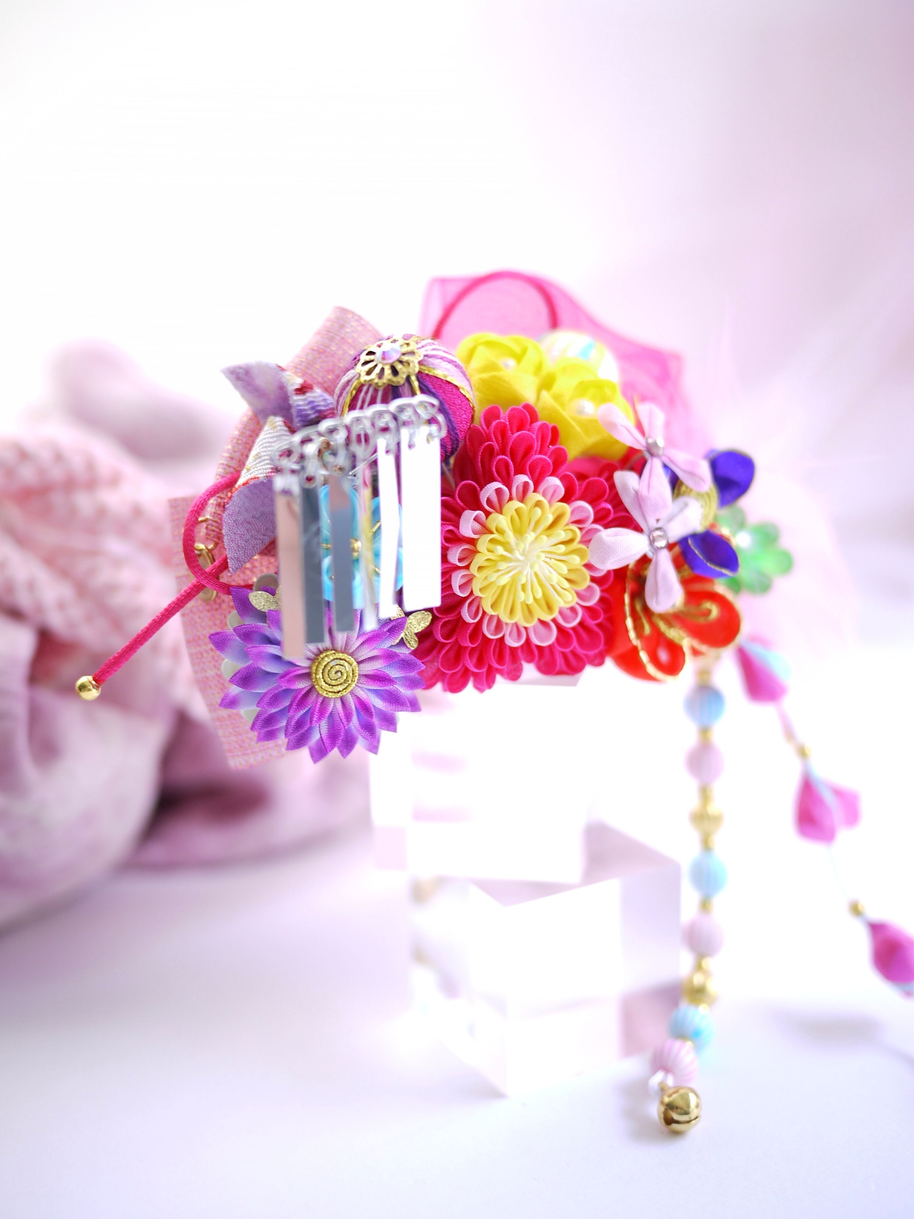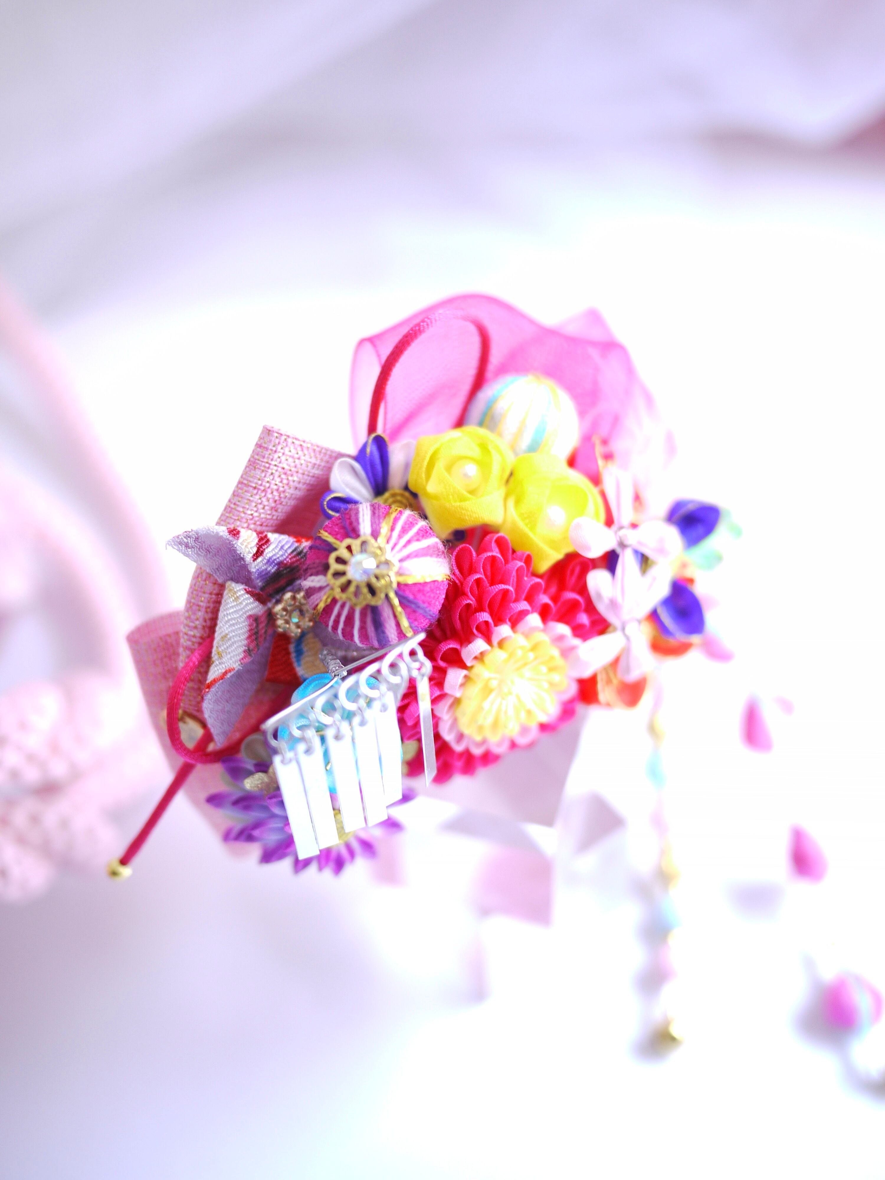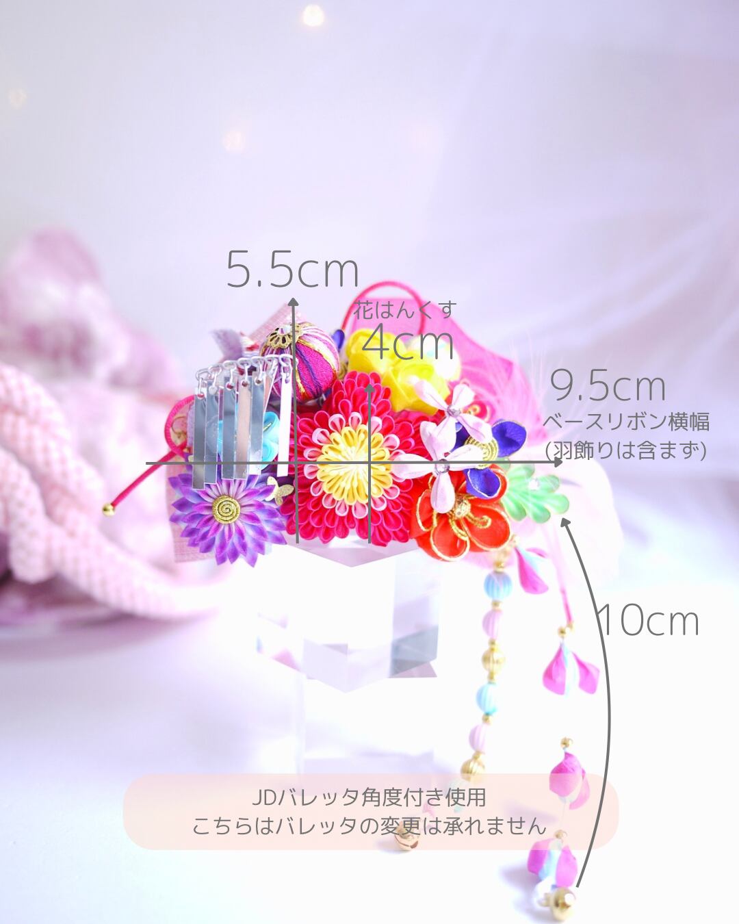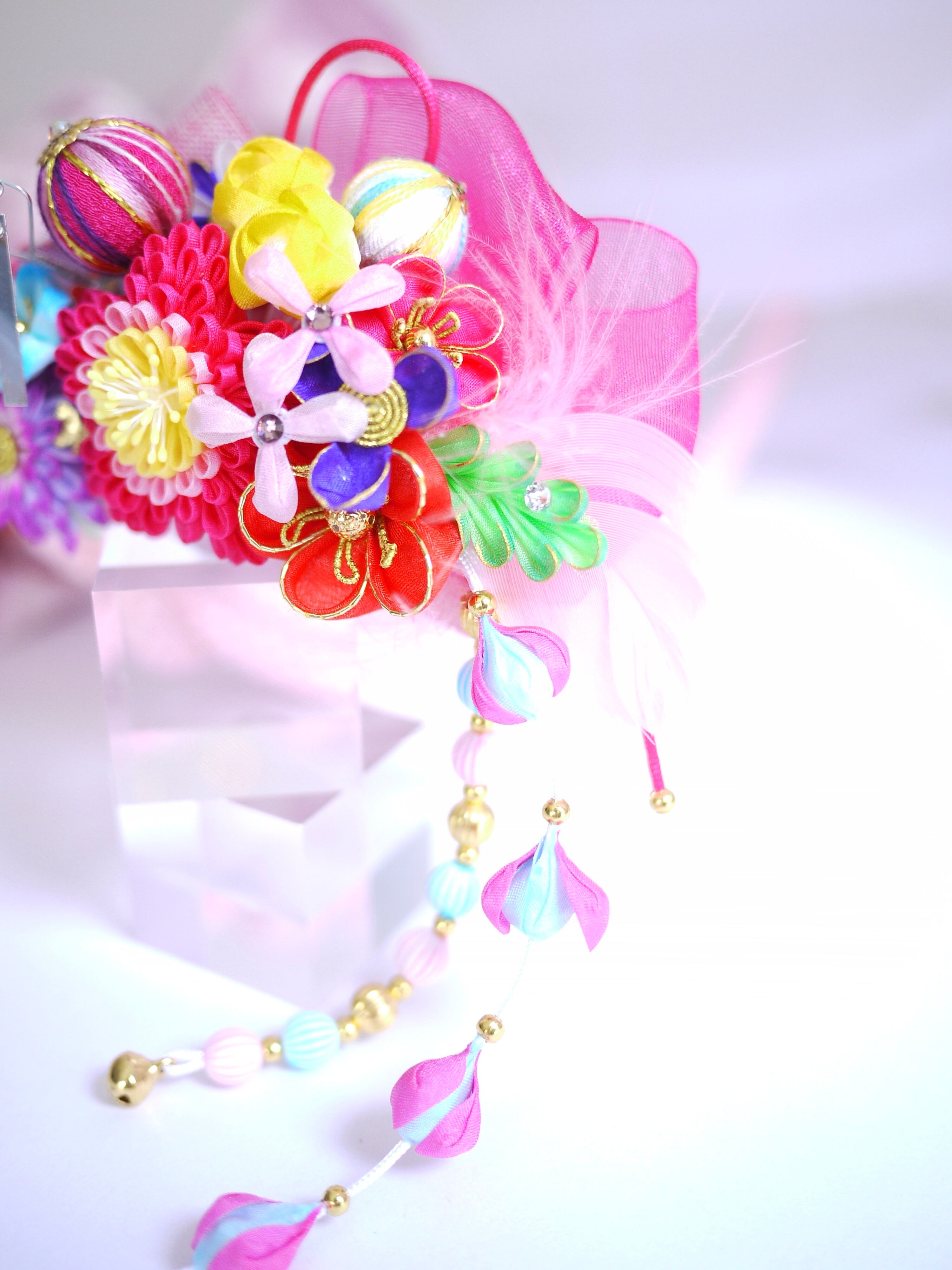 ピンクの羽飾りと小粒のちりめん玉で軽やか仕上げ