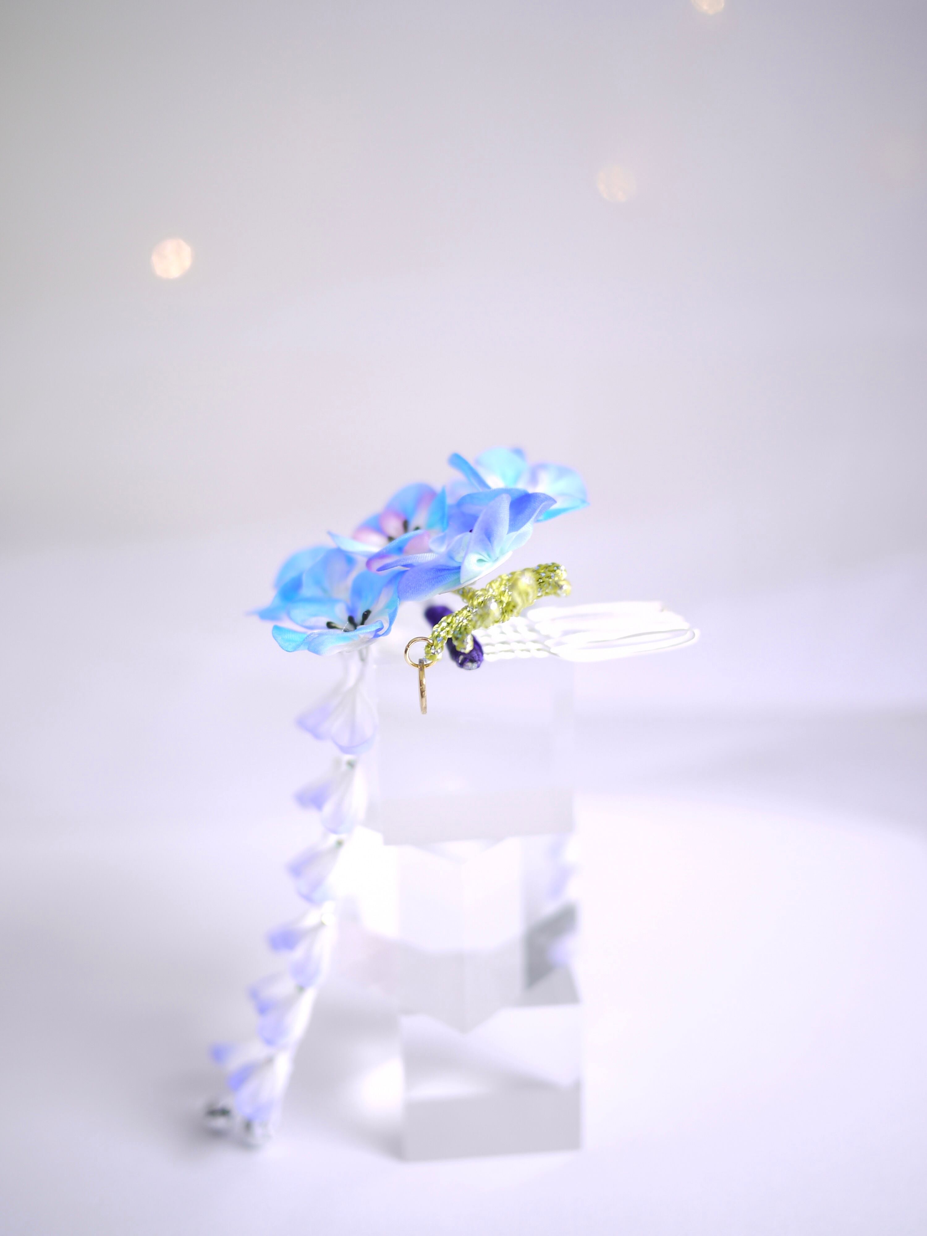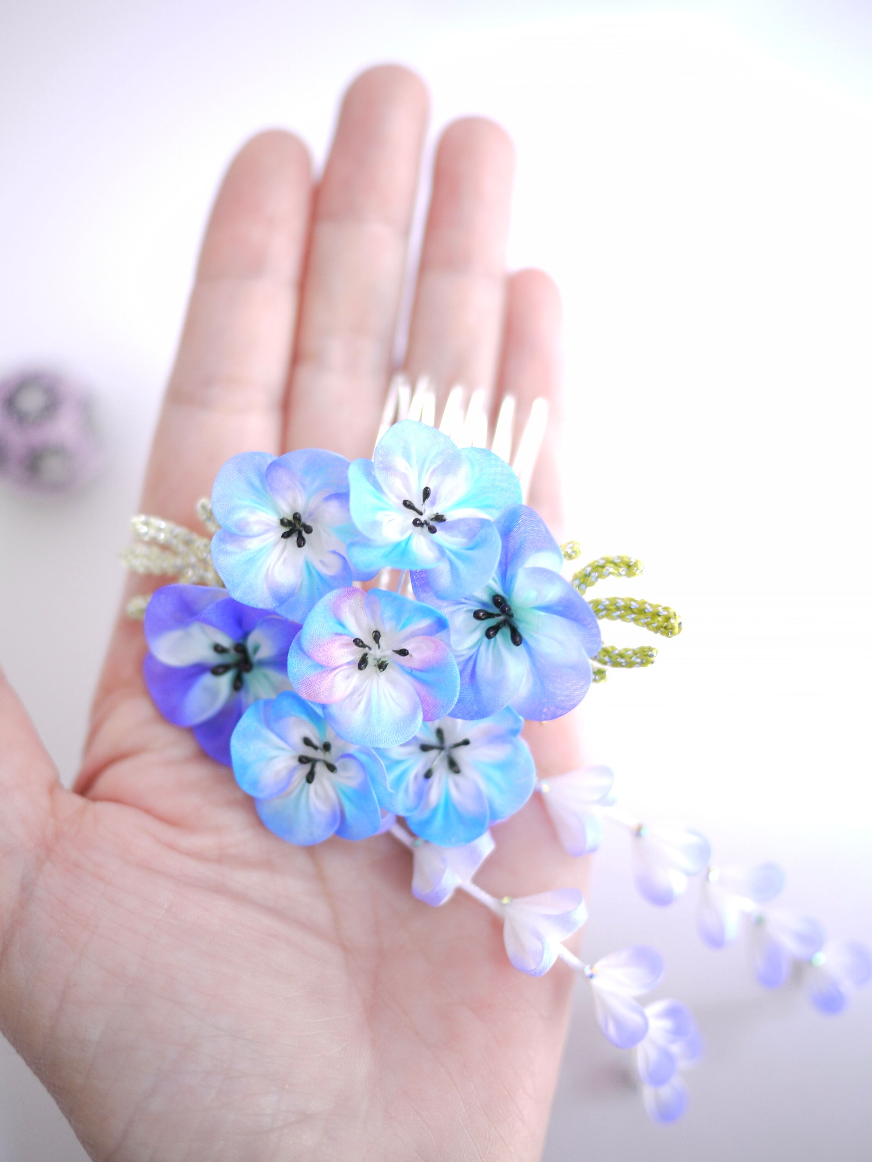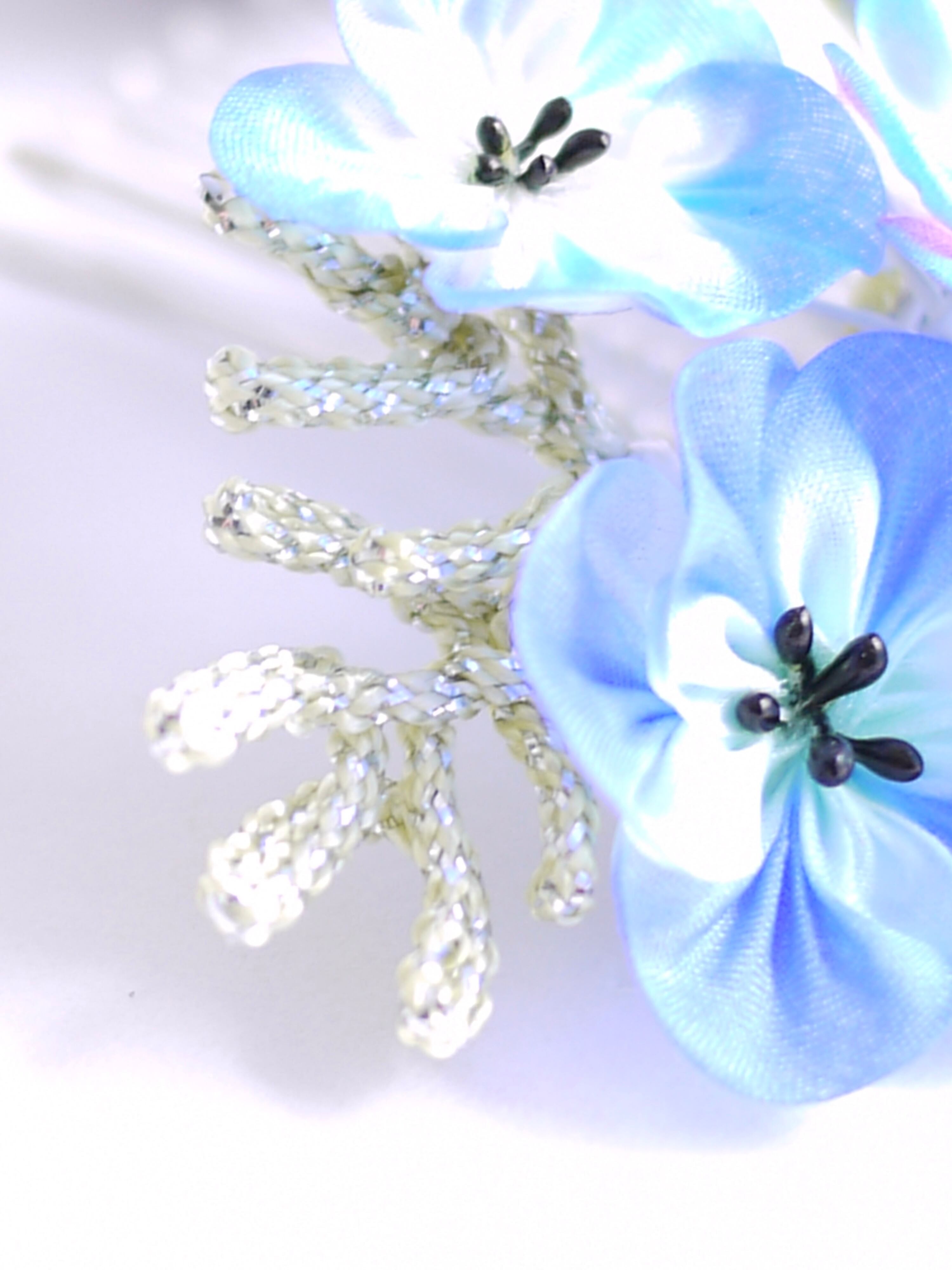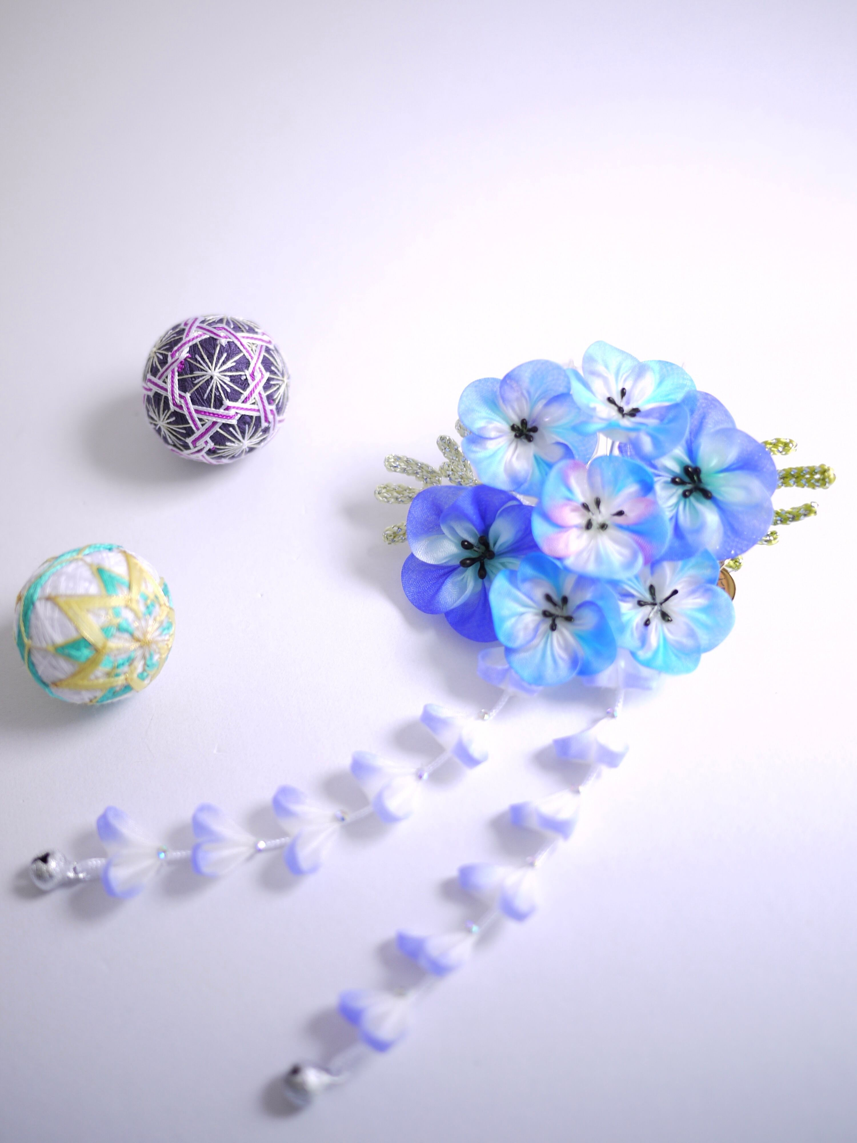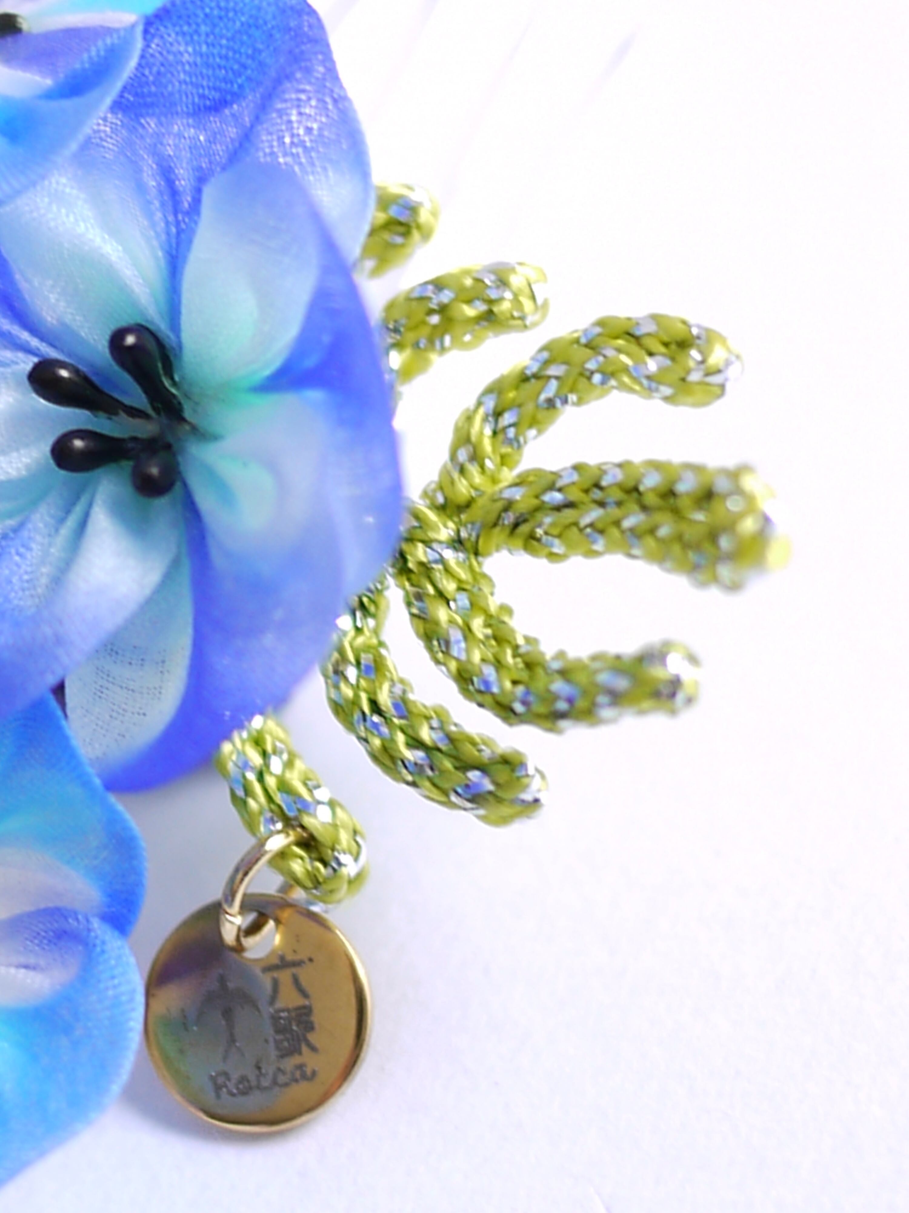 つまみ細工は専用の糊のみで制作しております、水に濡れると糊が溶けて型崩れしたり、正絹地が変形・変色する原因になることがございます。 雨や水濡れ・湿気には十分お気をつけください。 濃色のものは特に色移りする場合がございます